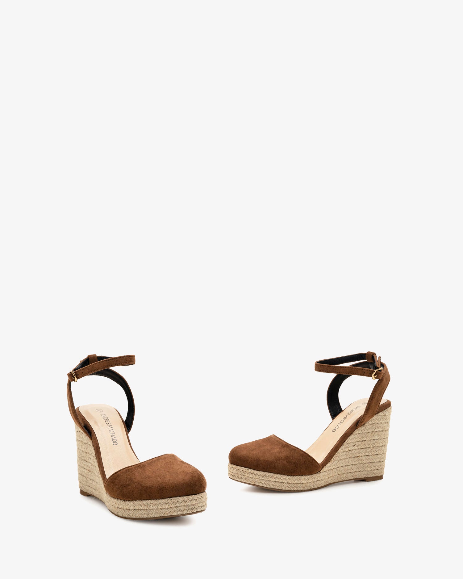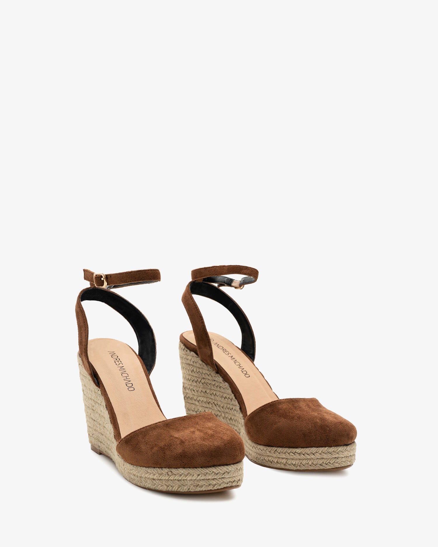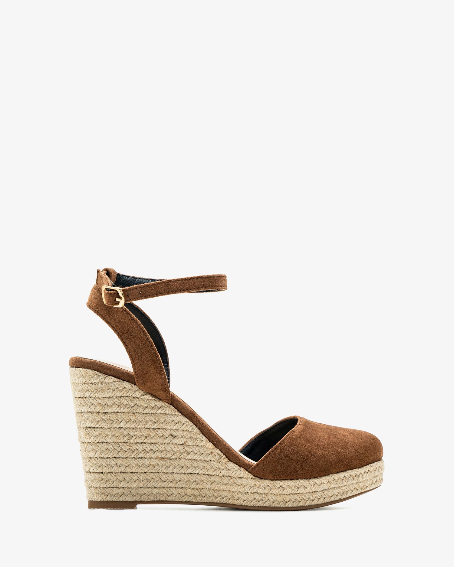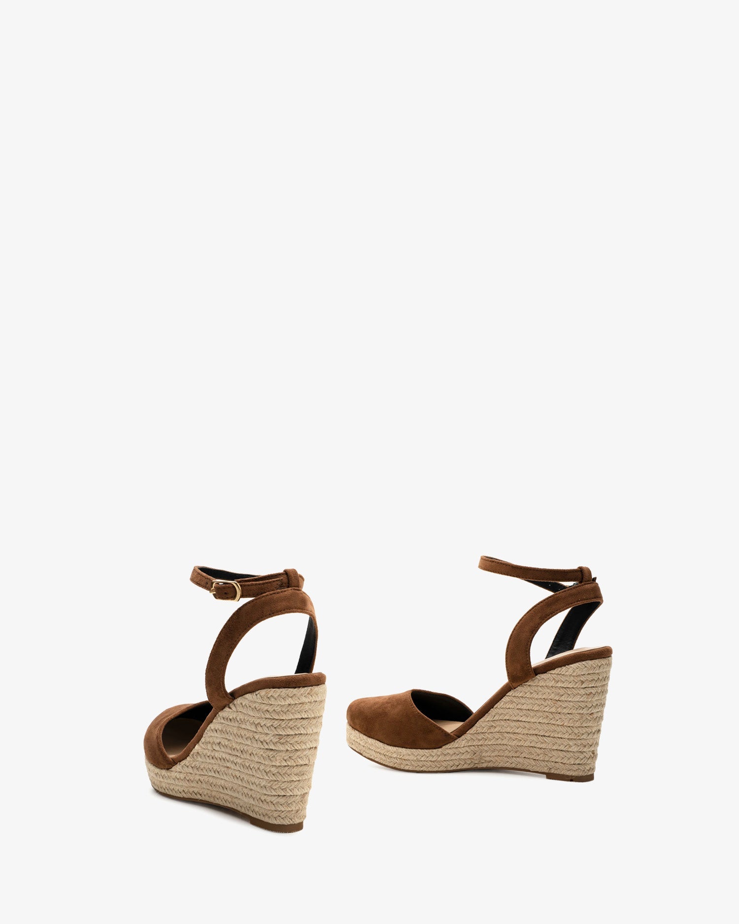 Brown faux suede espadrille with a jute wedge heel. Backless design with a buckle closure and matching ankle strap. Closed, rounded toe. Jute wedges and platform. 10 cm wedge and 2 cm platform for smaller sizes (32-35). 11.5 cm wedge and 2 cm platform for larger sizes (42-45).