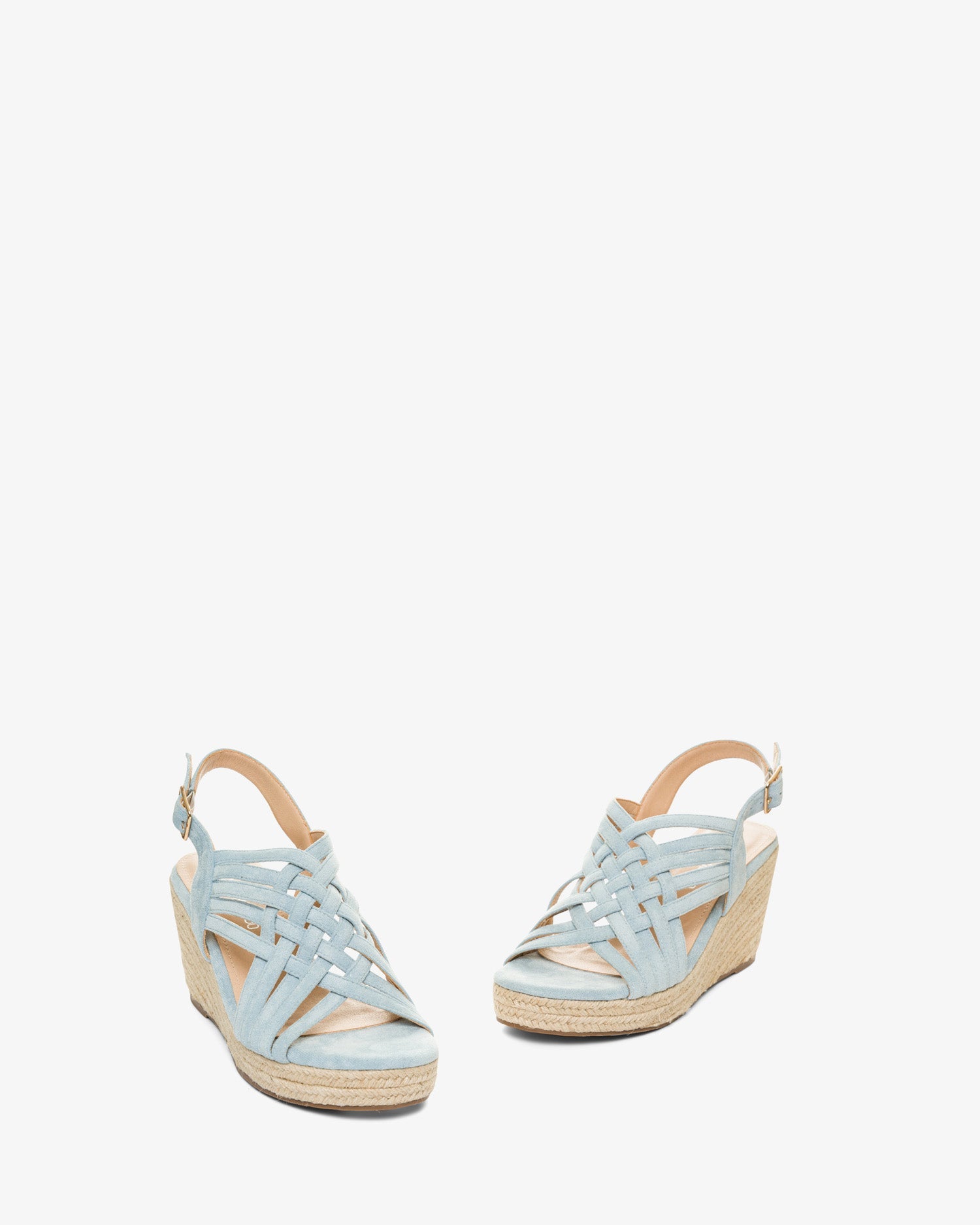 Light blue faux suede espadrilles with a wedge heel. Backless design with several interwoven straps at the front. Buckle closure with a matching ankle strap. Open toe. Jute wedges and platform. 8cm wedge and 3cm platform for smaller sizes (32-35). 9cm wedge and 3cm platform for larger sizes (42-45).