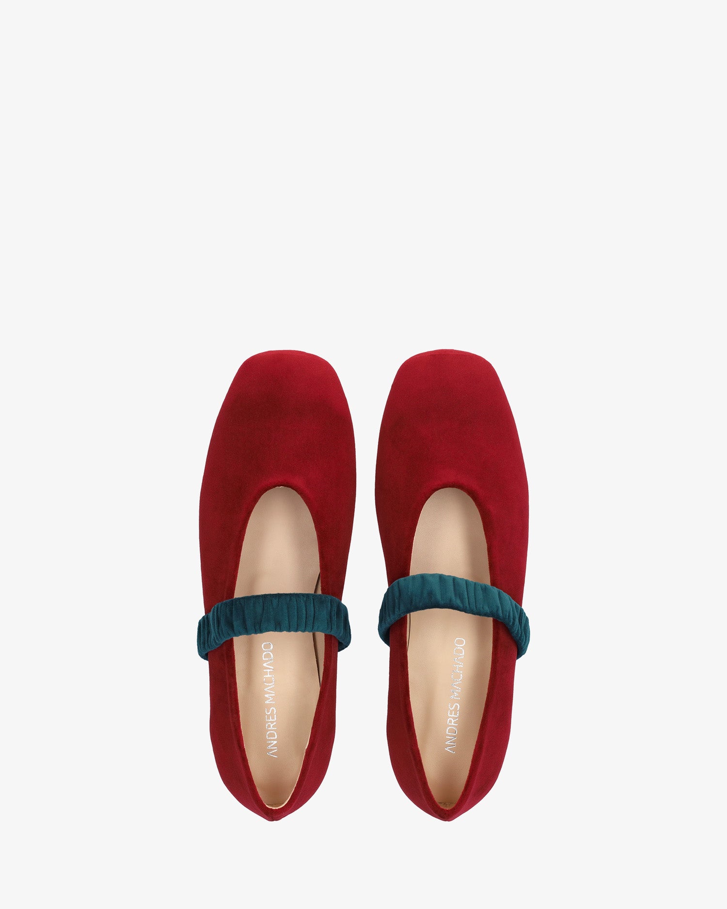 Flat ballet flat made of velvet, with a square toe and a wide elasticated turquoise strap across the instep. Available in small sizes (32-35) and large sizes (42-45). Made in Spain.