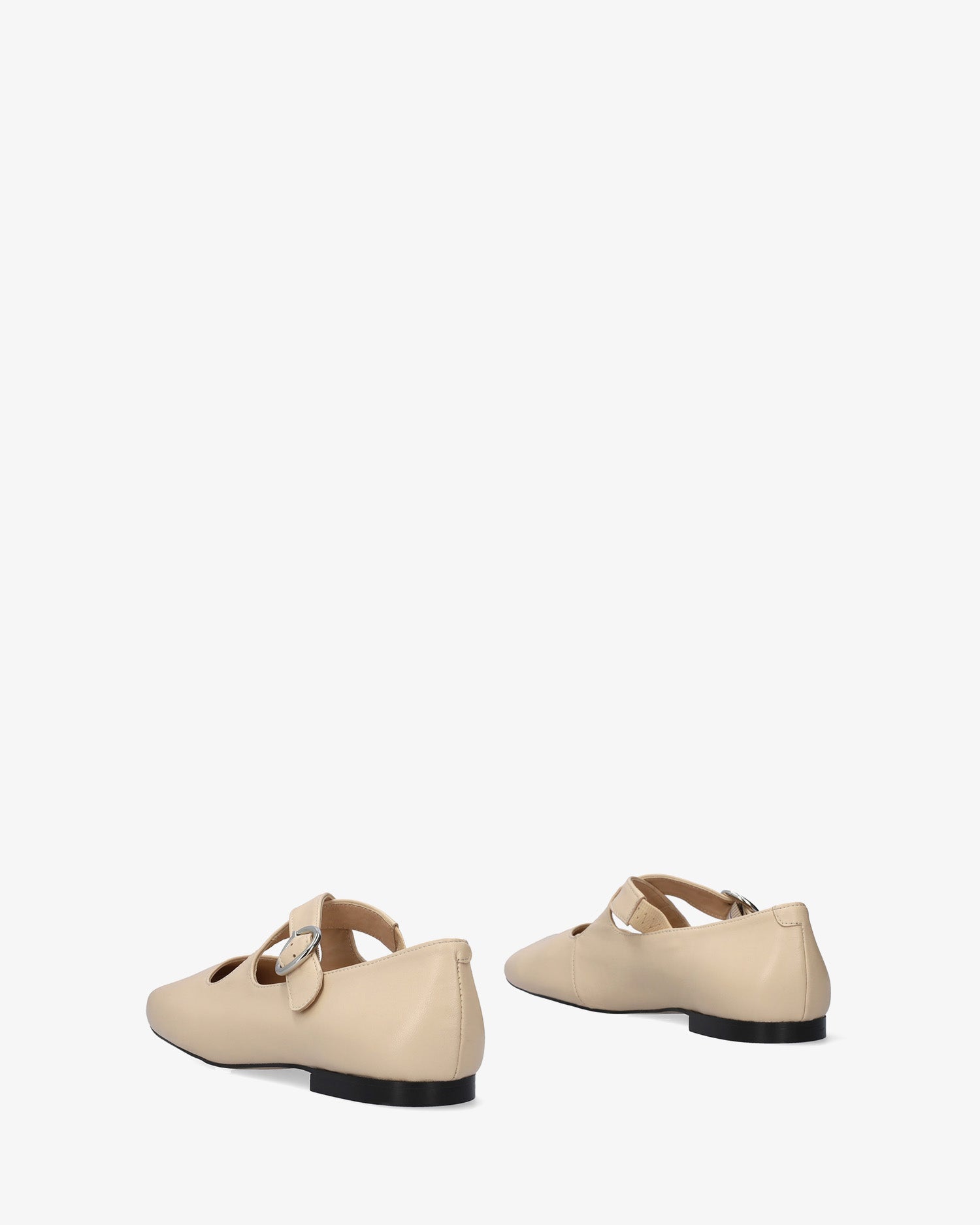 Flat leather ballet flat. Finished with a square toe, it features two wide, matching straps that cross over the instep and fasten with a buckle. Available in small sizes, from 32 to 35, and large sizes, from 42 to 45. Made in Spain.