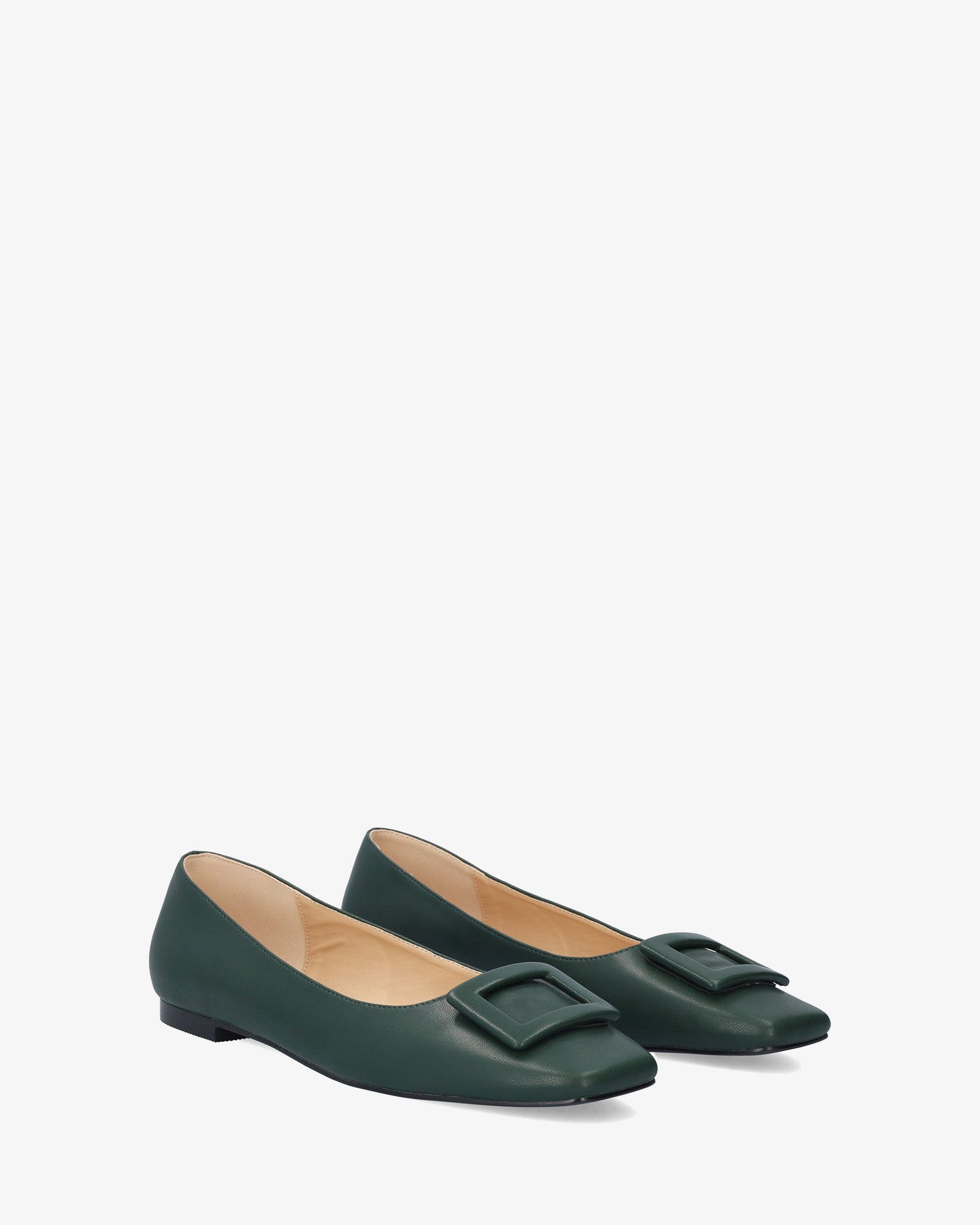 Green soft ballet flat. Square toe design with a rectangular buckle detail in matching soft material. Wide heel for larger sizes 42 to 45.