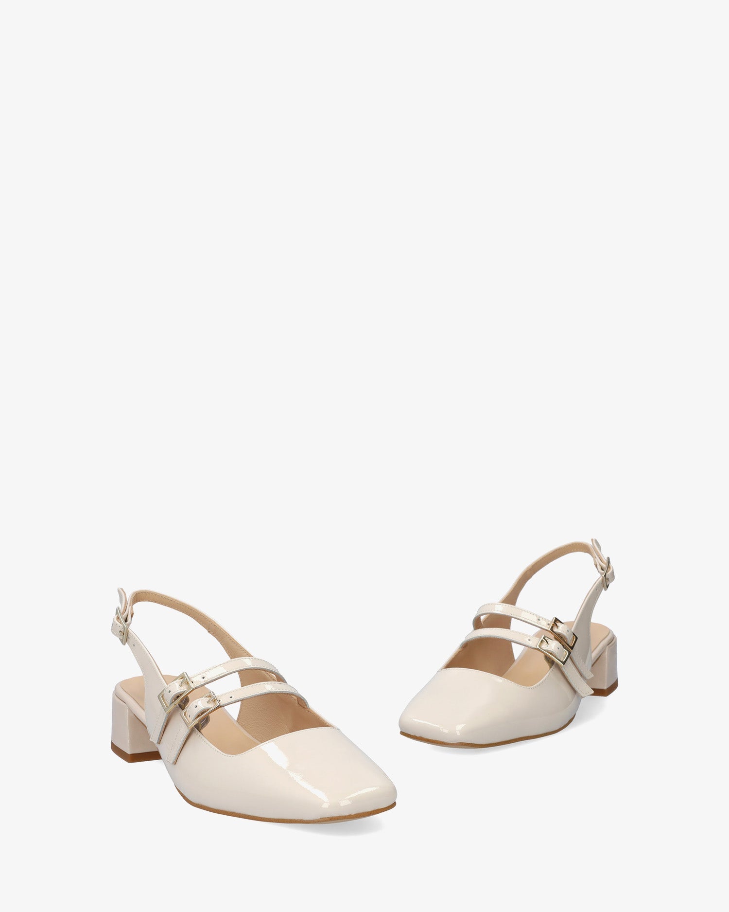 Off-white patent leather ballerina flat. Backless design with thin straps and a metal buckle closure at the instep. Square toe. Buckle closure at the side of the ankle. Beige leather lining. 3.5 cm covered heel for smaller sizes (32-35). 4 cm heel for larger sizes (42-45). Made in Spain.