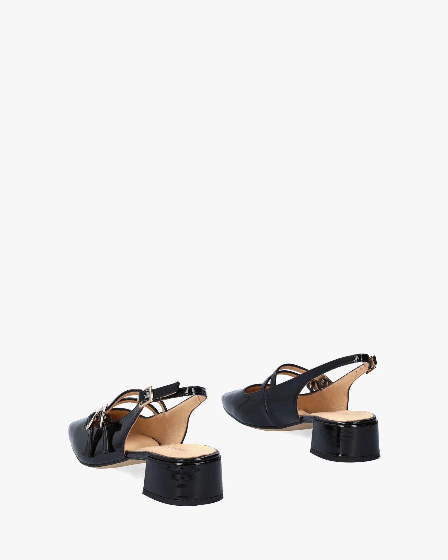 Black patent leather ballerina flat. Backless design with thin straps and a metal buckle closure at the instep. Square closed toe. Buckle closure at the side of the ankle. Beige leather lining. 3.5 cm covered heel for smaller sizes (32-35). 4 cm heel for larger sizes (42-45). Made in Spain.