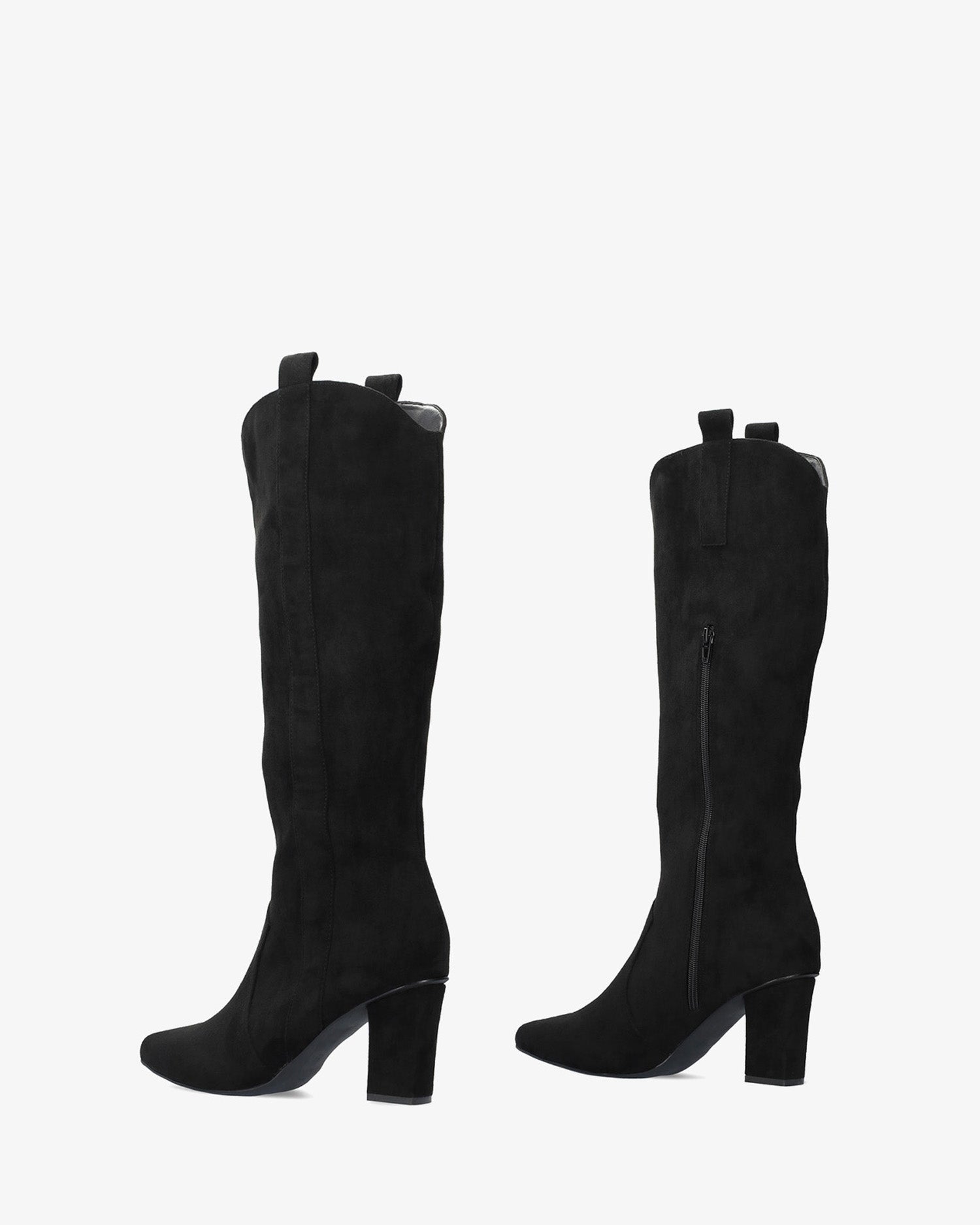 High-heeled boot in black faux suede with a matching inner zipper. Features a decorative longitudinal strip in the same material along the sides and matching pull tabs on the upper outer and inner sides of the shaft. The boot has a 7.5 cm wide, covered heel in a matching color for smaller sizes (32-35) and an 8.2 cm wide heel for larger sizes (42-45). This style runs small; we recommend ordering one size up from your usual size.