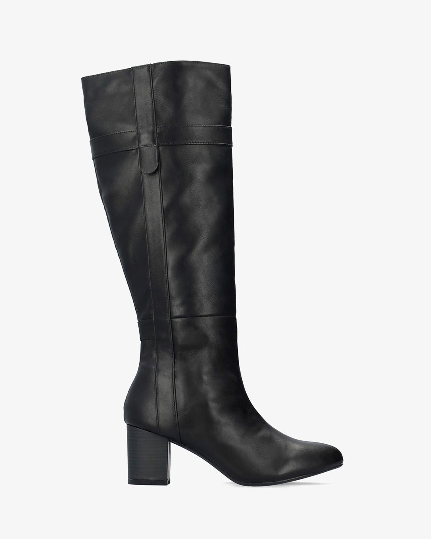 High boot in soft black leather. Matching inner zip closure. Decorative strip detail on the side and around the shaft, and a matching pull tab on the outside. Almond-shaped toe. 5.3 cm wide, dark wood-effect heel for smaller sizes (32-35). 7.5 cm wide heel for larger sizes (42-45). This style runs small; we recommend ordering one size up.
