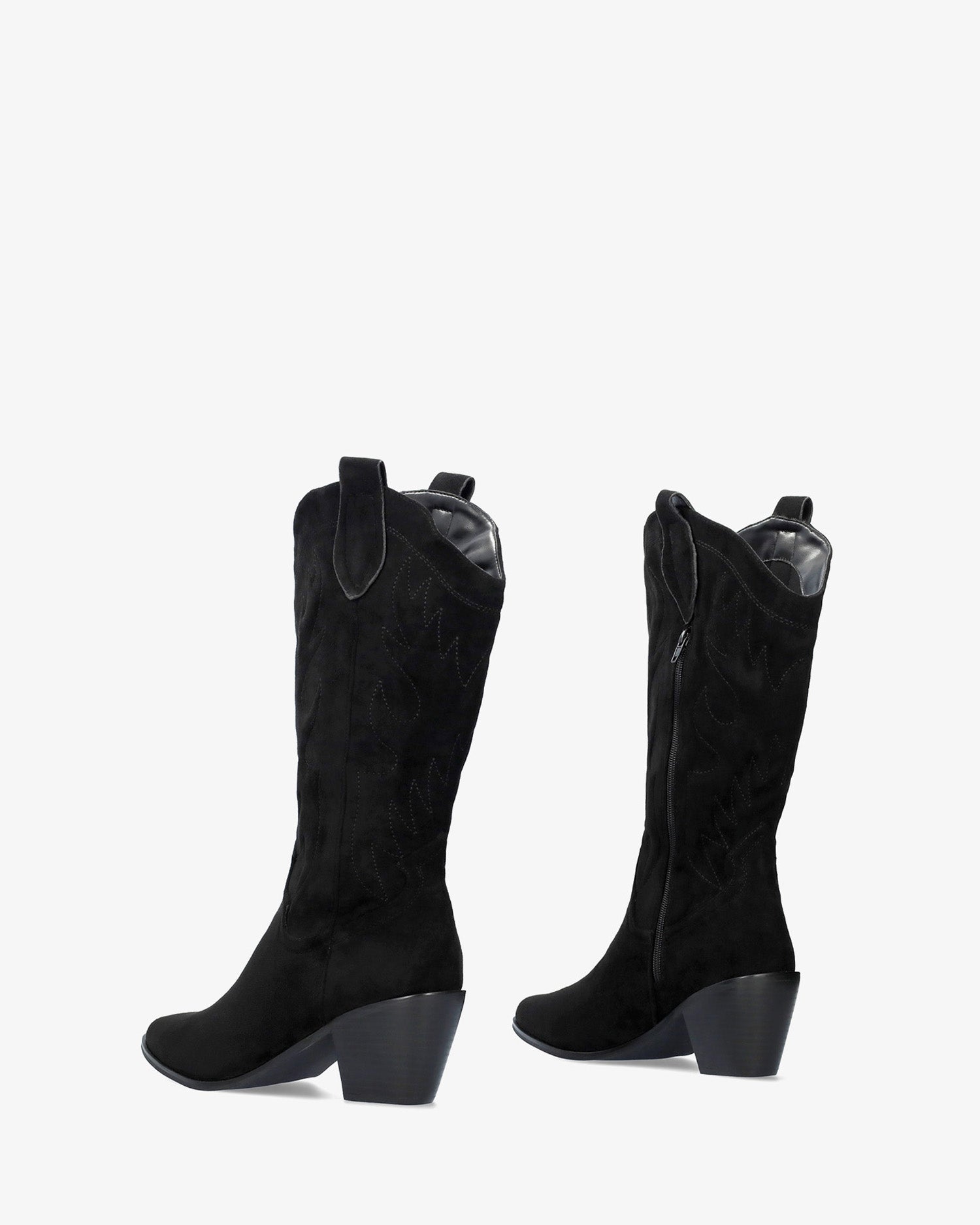 Cowboy boot with a pointed toe and decorative stitching in the same tone. The heel has a wood-effect finish: 6 cm for smaller sizes (32-34) and 7.5 cm for larger sizes (42-46).