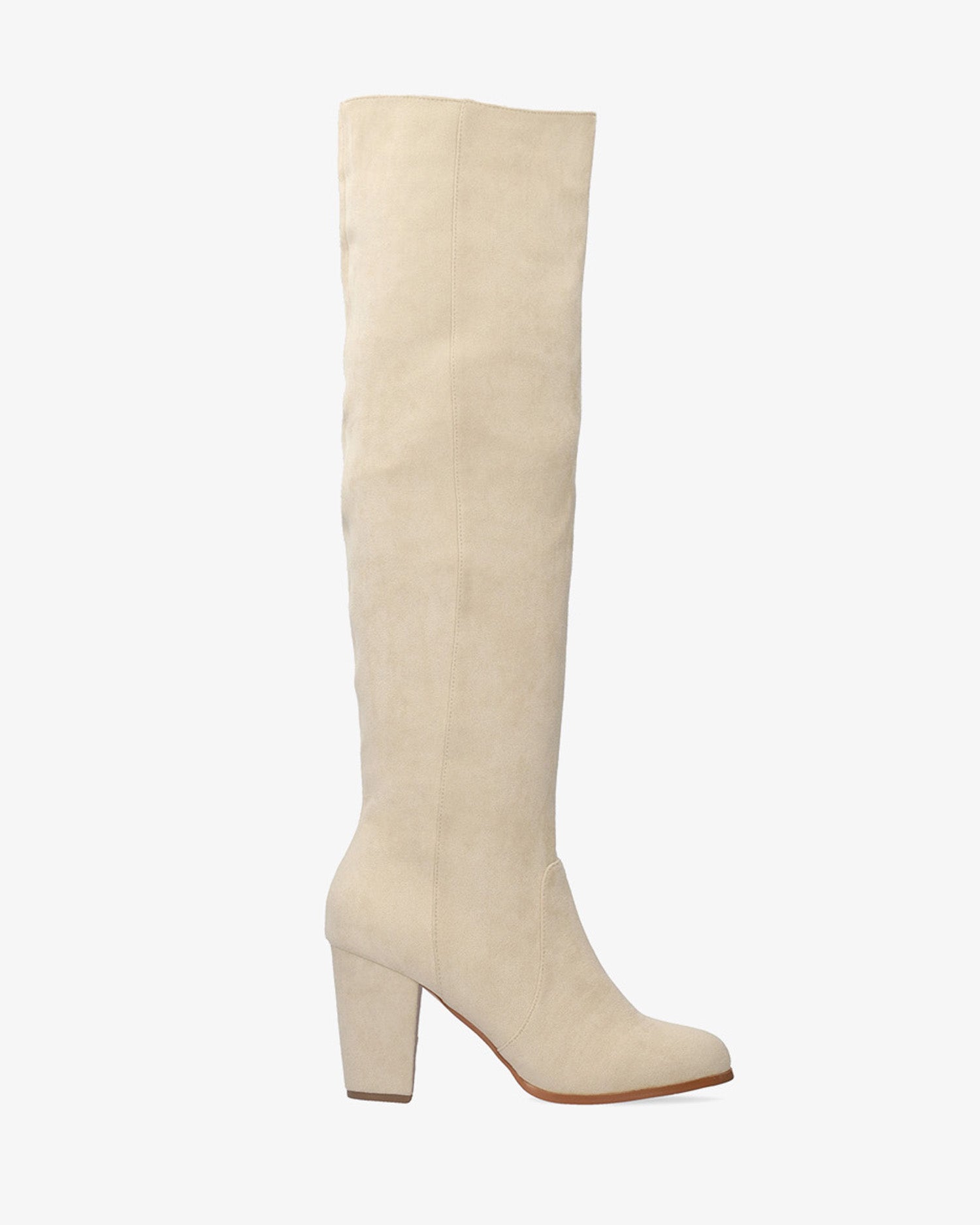 Cream-colored faux suede knee-high boot. Matching zip fastening on the inside, mid-shaft. Decorative topstitching detail on the outside of the shaft and instep. Round toe. Matching covered heel: 7.5 cm for smaller sizes (32-35). 9.5 cm heel for larger sizes (42-45).