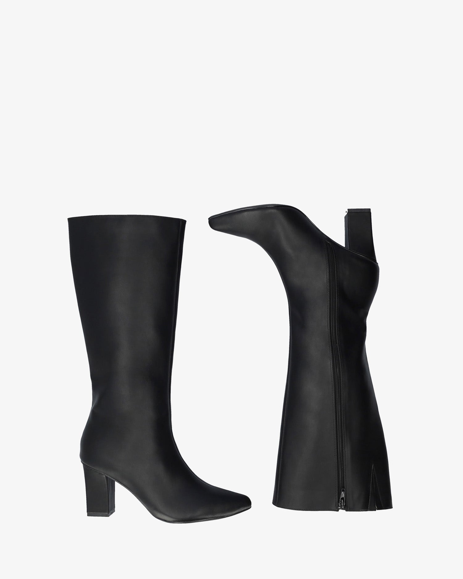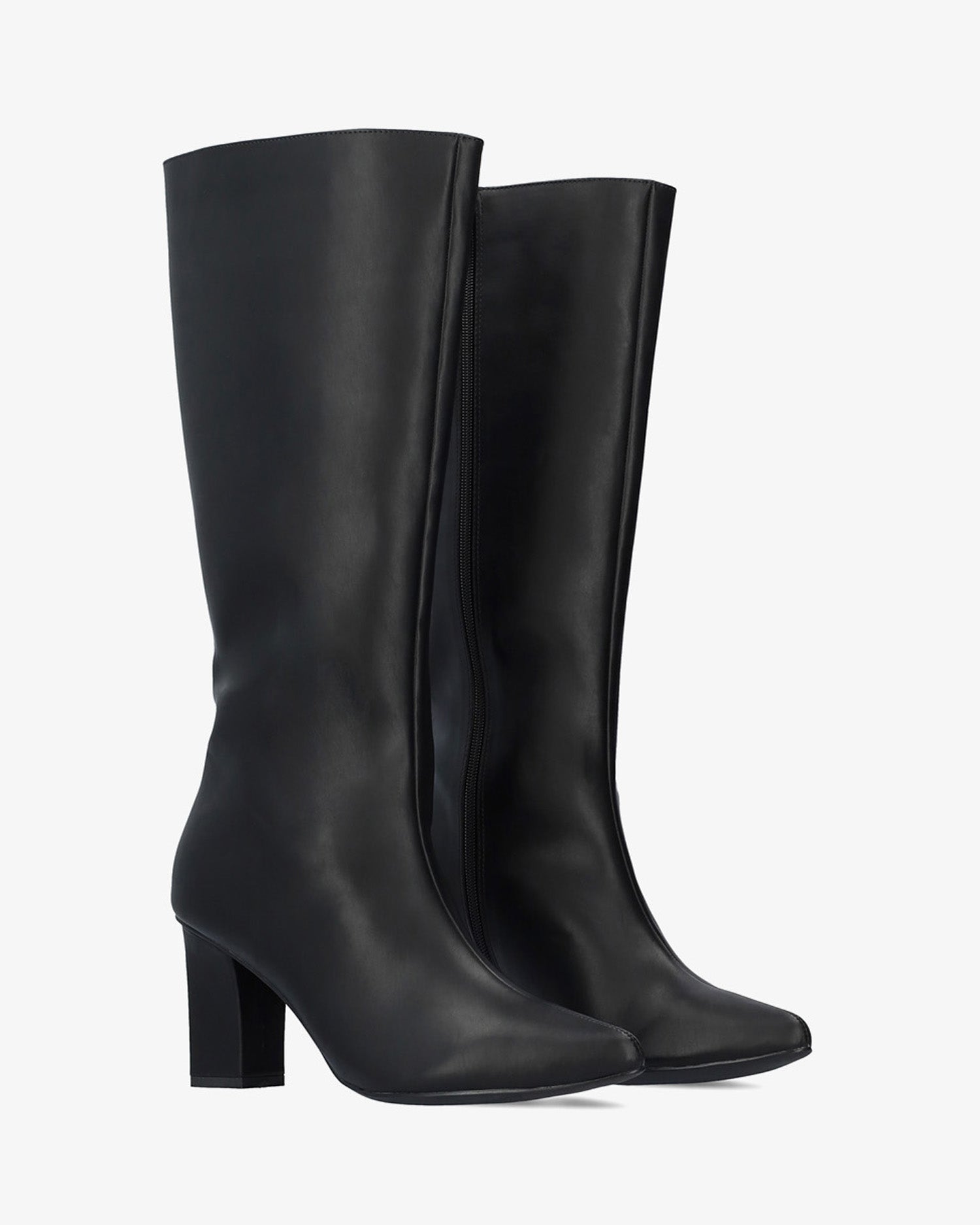 Black soft leather boot. Decorative stitching detail down the center, from the toe to the top of the shaft. Inside zip closure and matching elastic at the top of the shaft. Pointed toe. Matching covered heel: 7.3 cm for smaller sizes (32-35). 8.5 cm heel for larger sizes (42-45). This style runs small; we recommend ordering one size up.