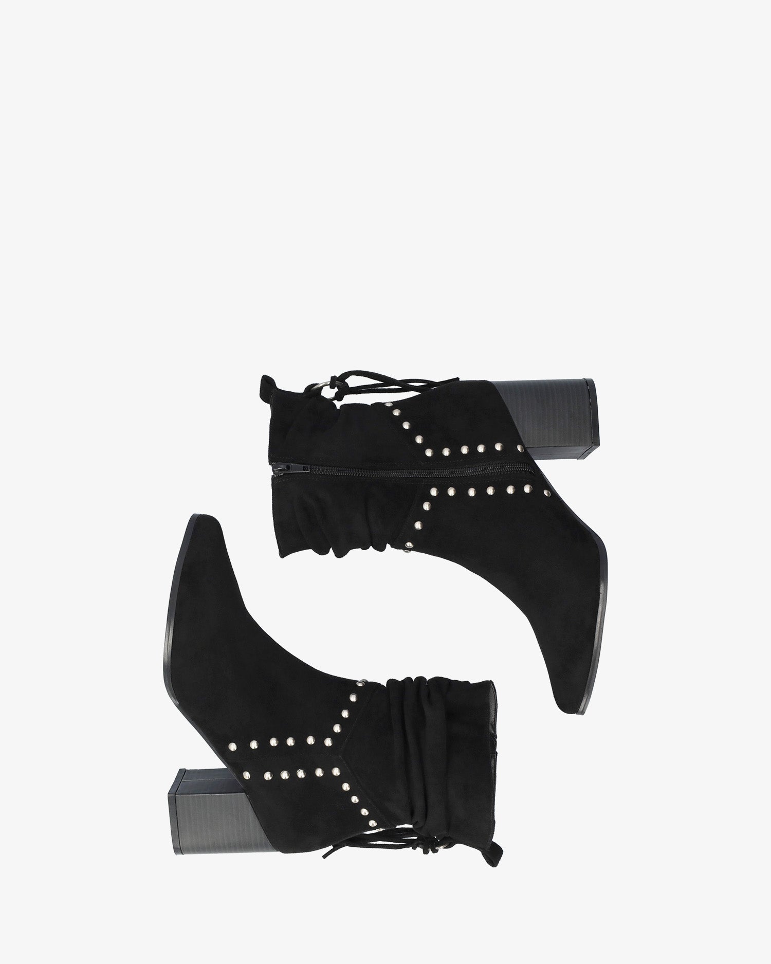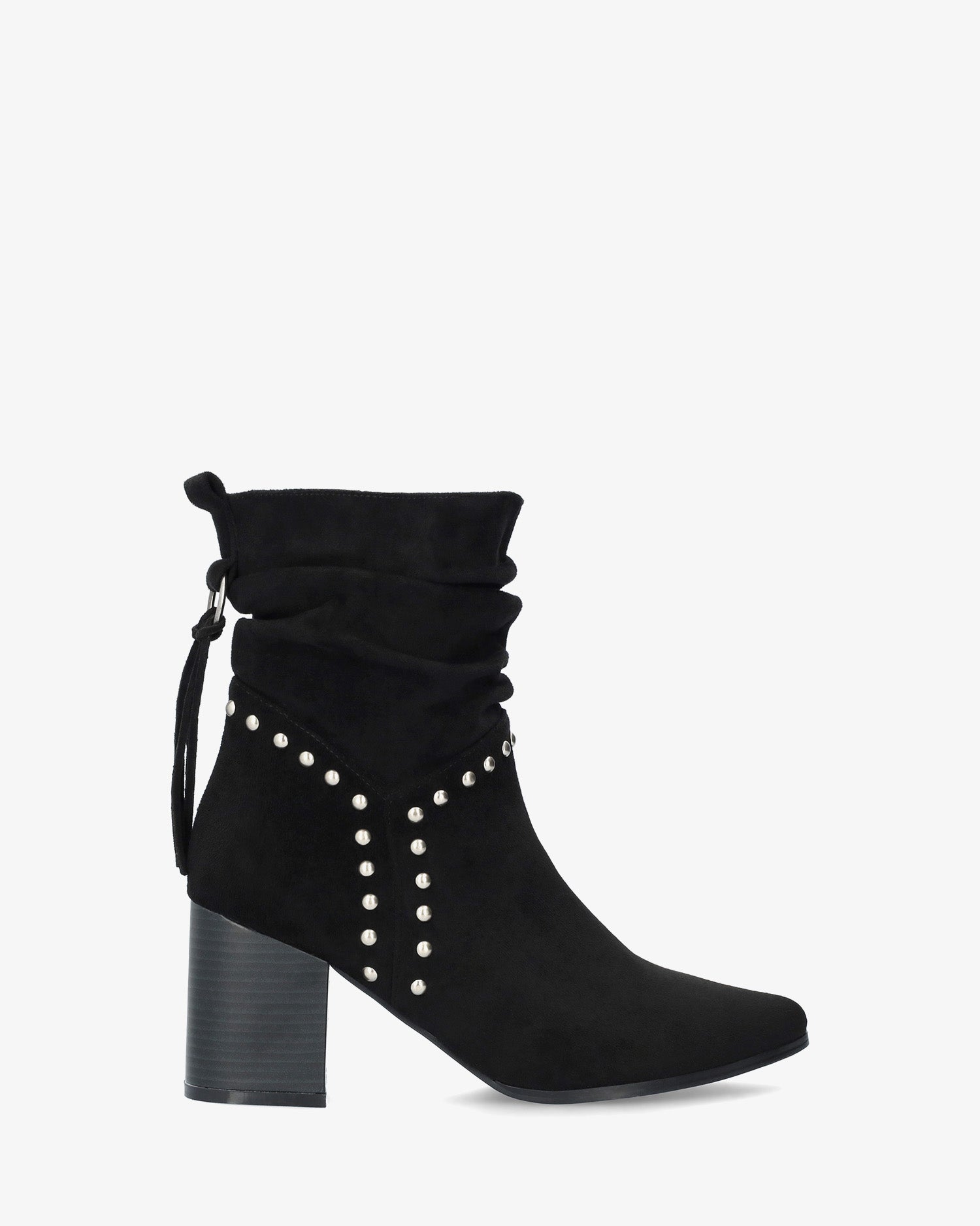 Black faux suede cowboy-style ankle boots with a zip closure and a back strap with matching hanging loops. Features decorative silver studs on the shaft and a ruched detail at the ankle. Pointed toe. 6 cm block heel for smaller sizes (32-35). 8 cm heel for larger sizes (42-45).