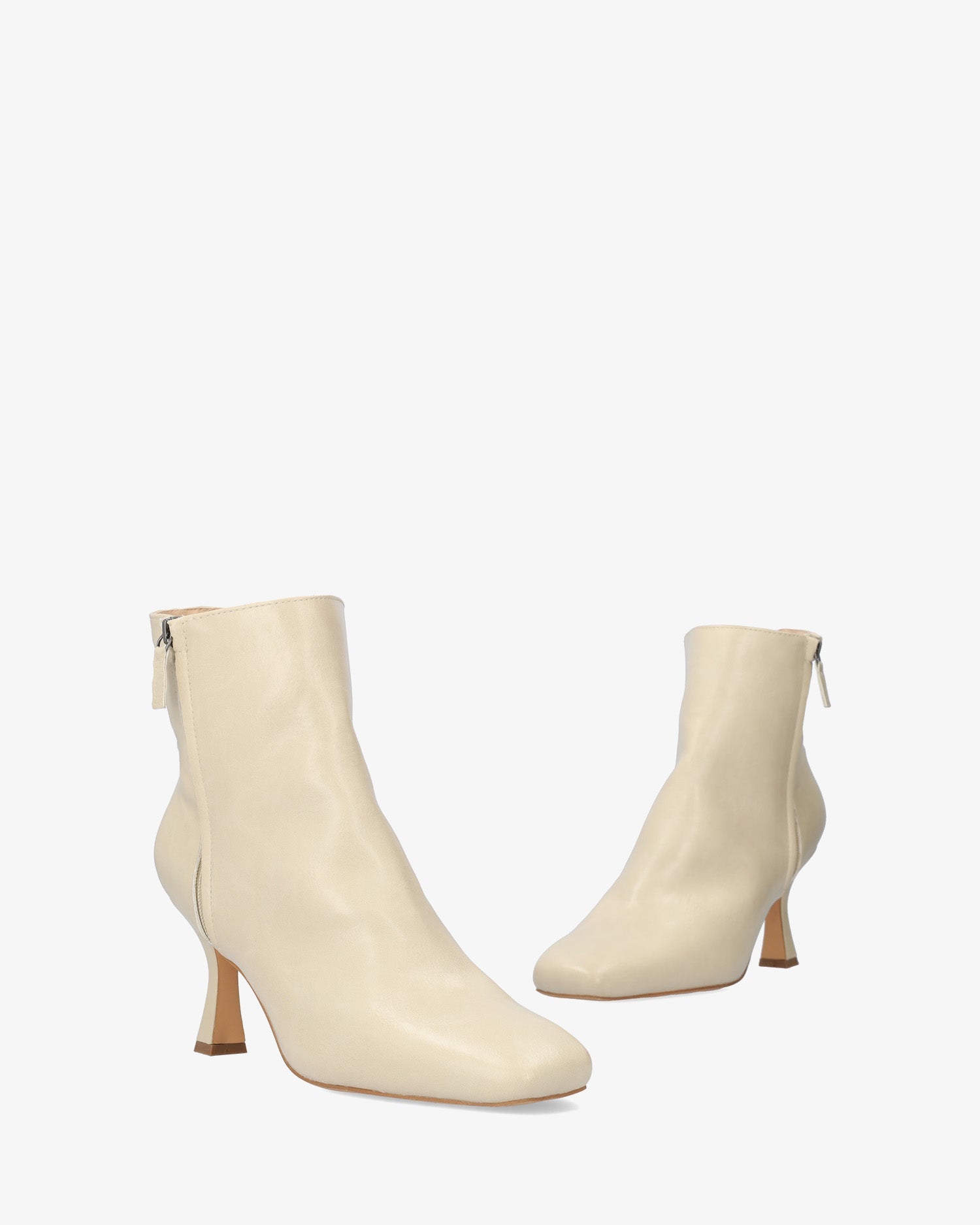 Cream-colored ankle boots with a soft kitten heel. Low shaft with a matching zip closure on the inner side. Square toe. Tonal covered heel: 8.3 cm for smaller sizes (32-35). 8.7 cm heel for larger sizes (42-45).