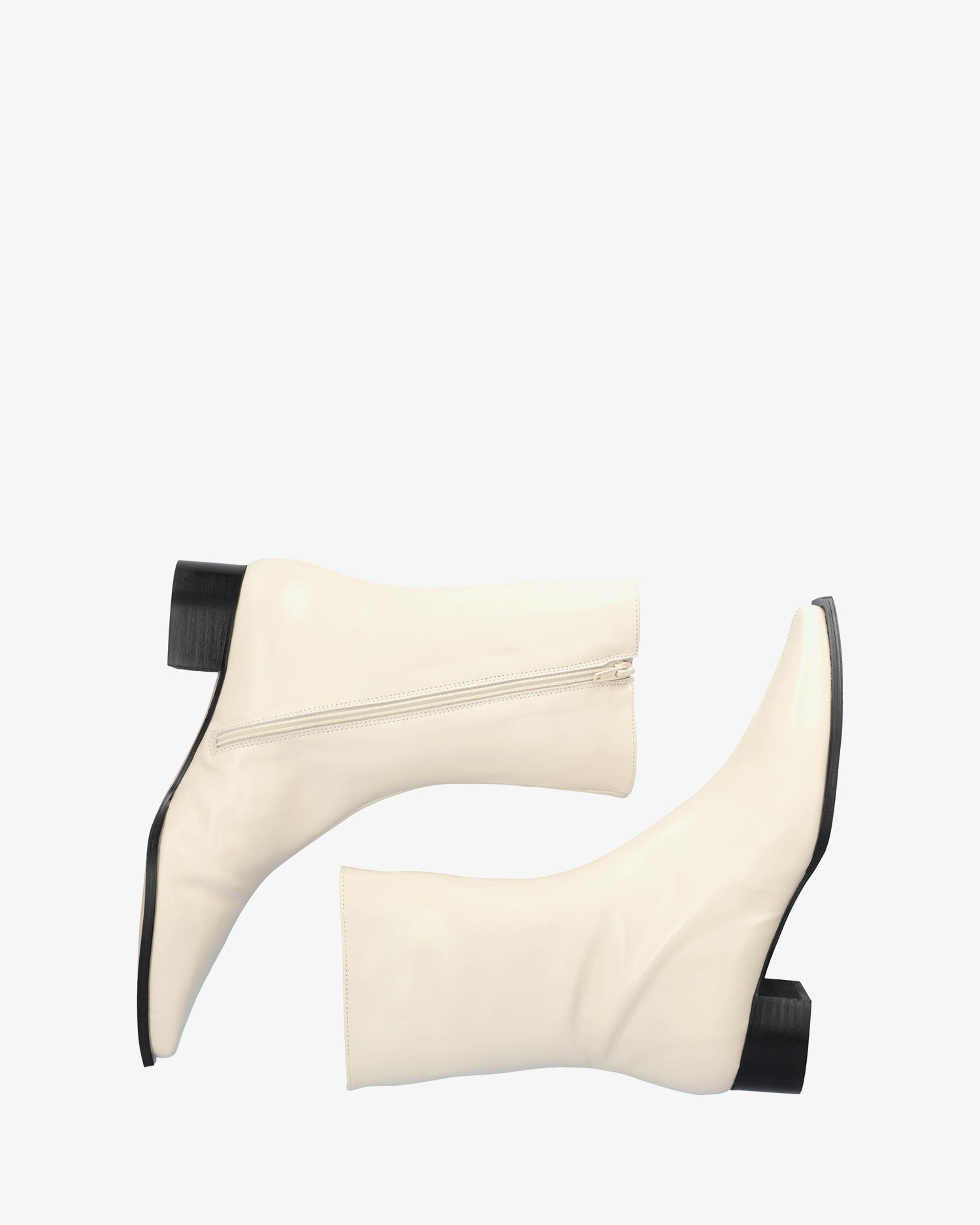 Ice-colored leather ankle boots. Stitching detail from the center of the toe to the top of the shaft. Square toe. Matching zipper on the inside. Beige leather lining. 3.5 cm block heel for small sizes 32-35. 4 cm heel for medium sizes 36-41. 4 cm heel for large sizes 42-45. Made in Spain.