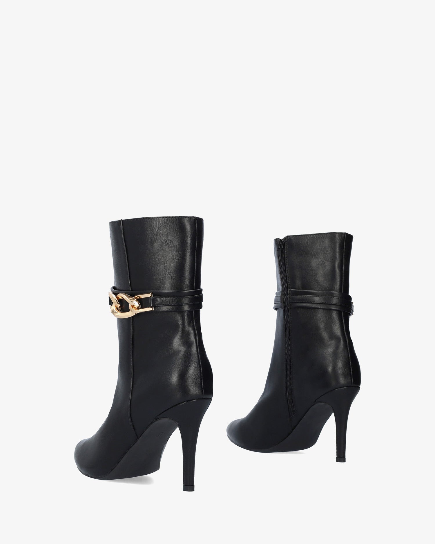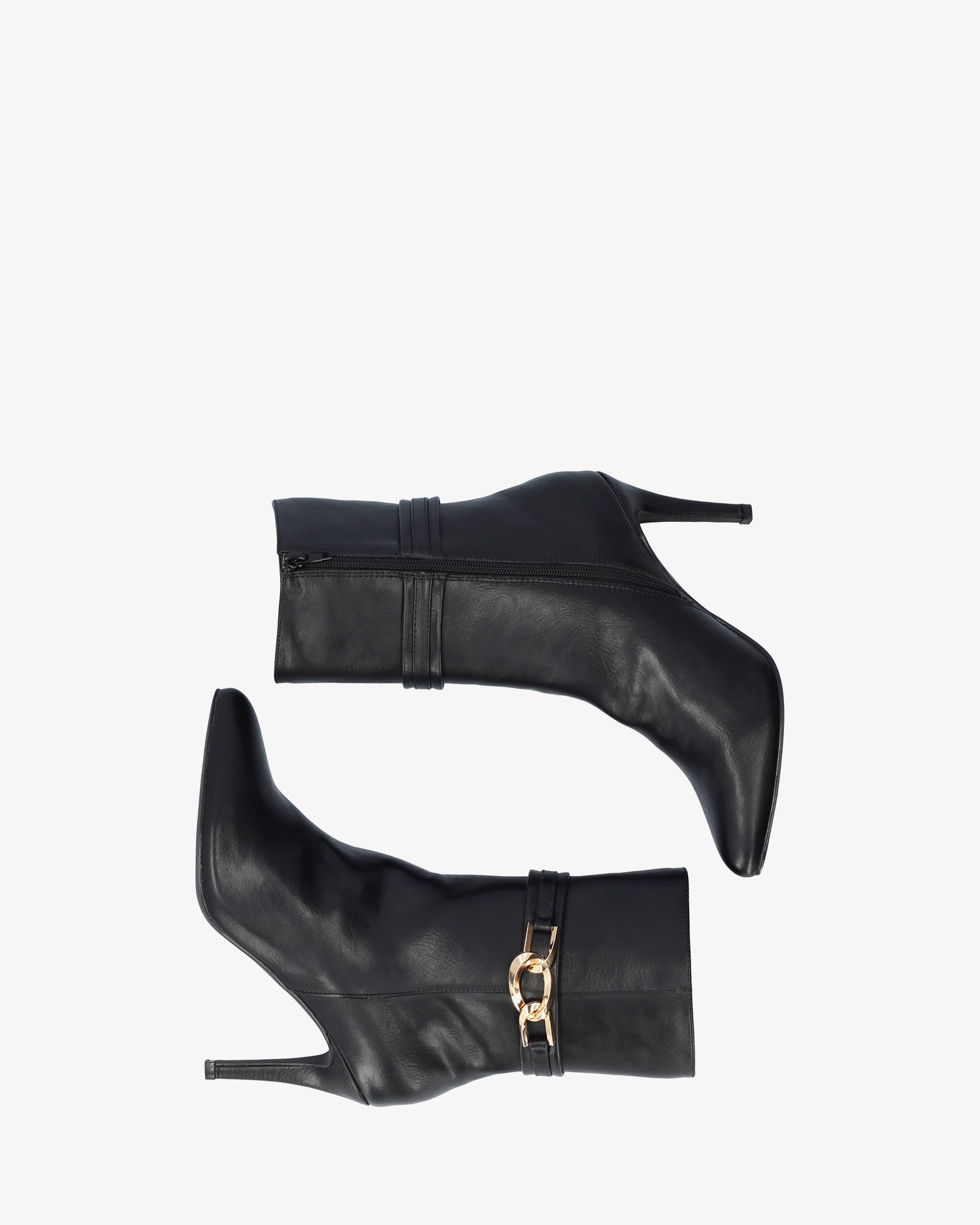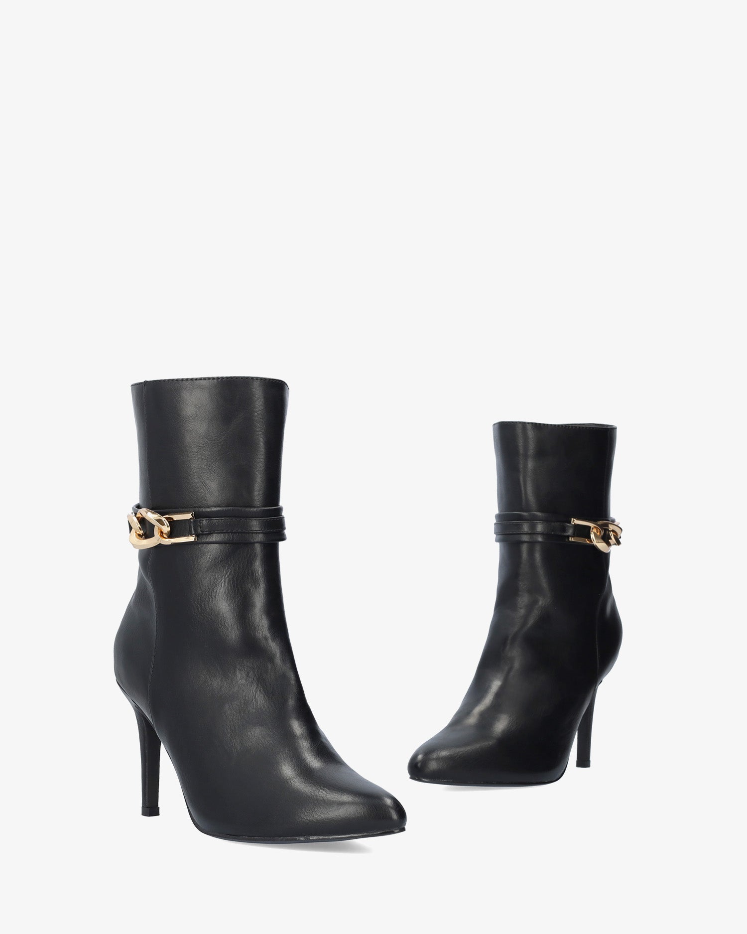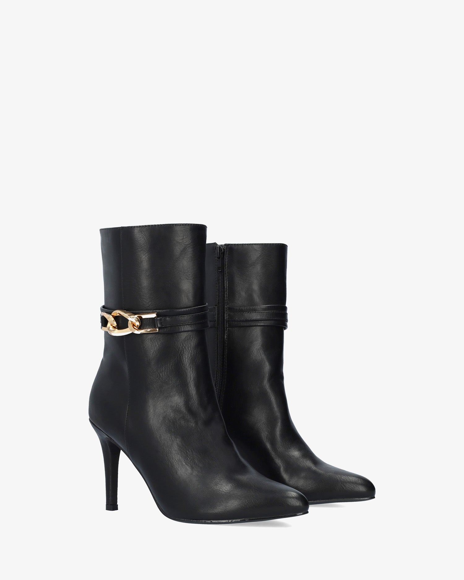 High-shaft ankle boots in soft black with a matching inner zip closure. Wide ankle strap with a gold buckle on the outer side. Pointed toe. 8.5 cm covered stiletto heel for smaller sizes (32-35). 9.5 cm heel for larger sizes (42-45).