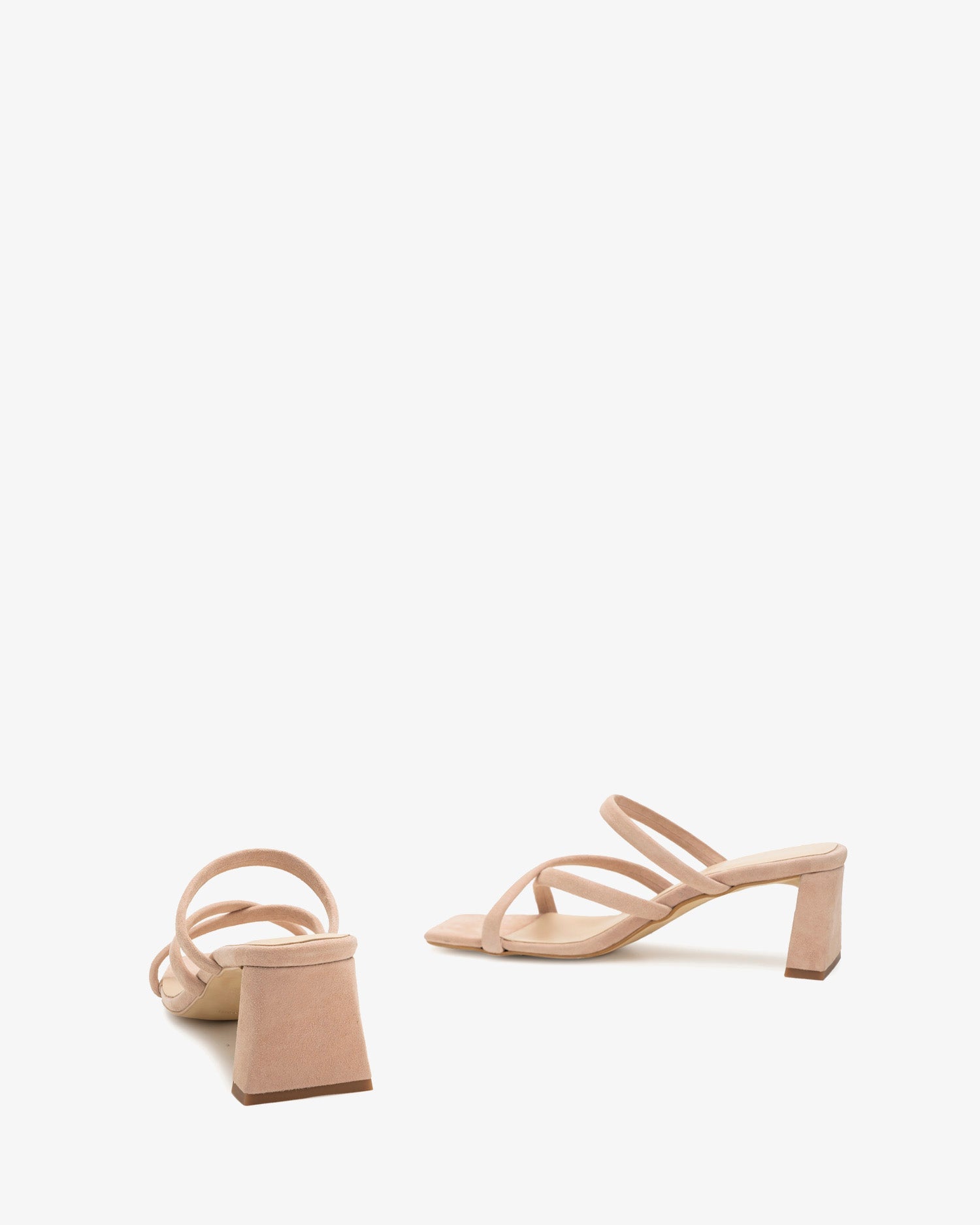 Beige suede mule. Features two thin, crossed, tonal tubular straps and a thin strap across the instep. Open, square toe. Tonal suede block heel. Available in sizes 32 to 45. 5.5 cm heel for sizes 32 to 37. 6 cm heel for sizes 38 to 45. Made in Spain