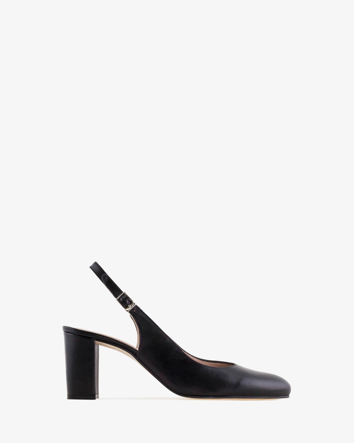 Slingback pump in black nappa leather with buckle closure on the side. Rounded toe. 8 cm block heel covered in matching leather for smaller sizes (32-35). 9 cm heel for larger sizes (42-45). Made in Spain.