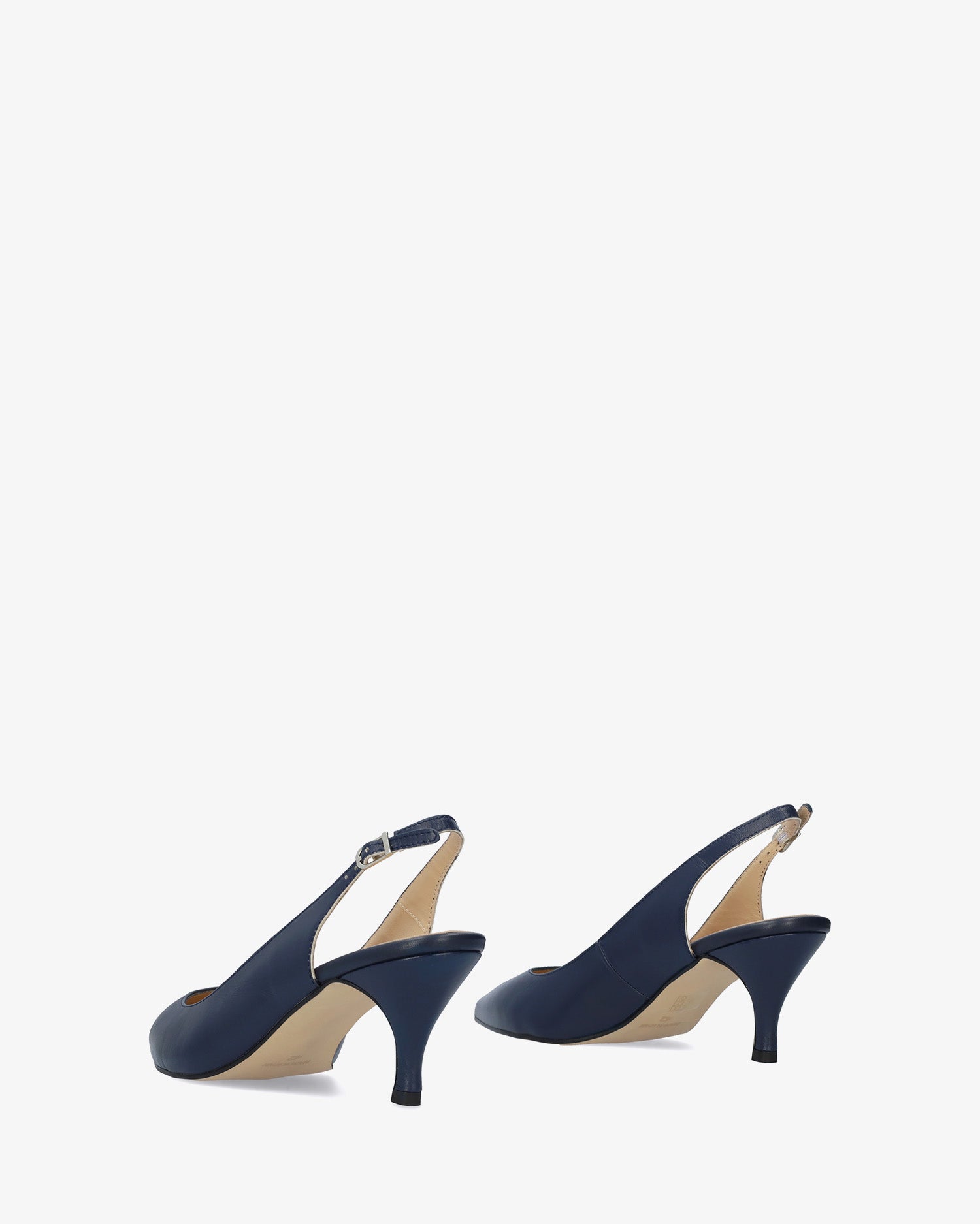 Slingback pump in navy blue leather. Buckle closure and pointed toe. 7 cm heel covered in matching leather for smaller sizes (32-35). 8 cm heel for larger sizes (42-45). Made in Spain.