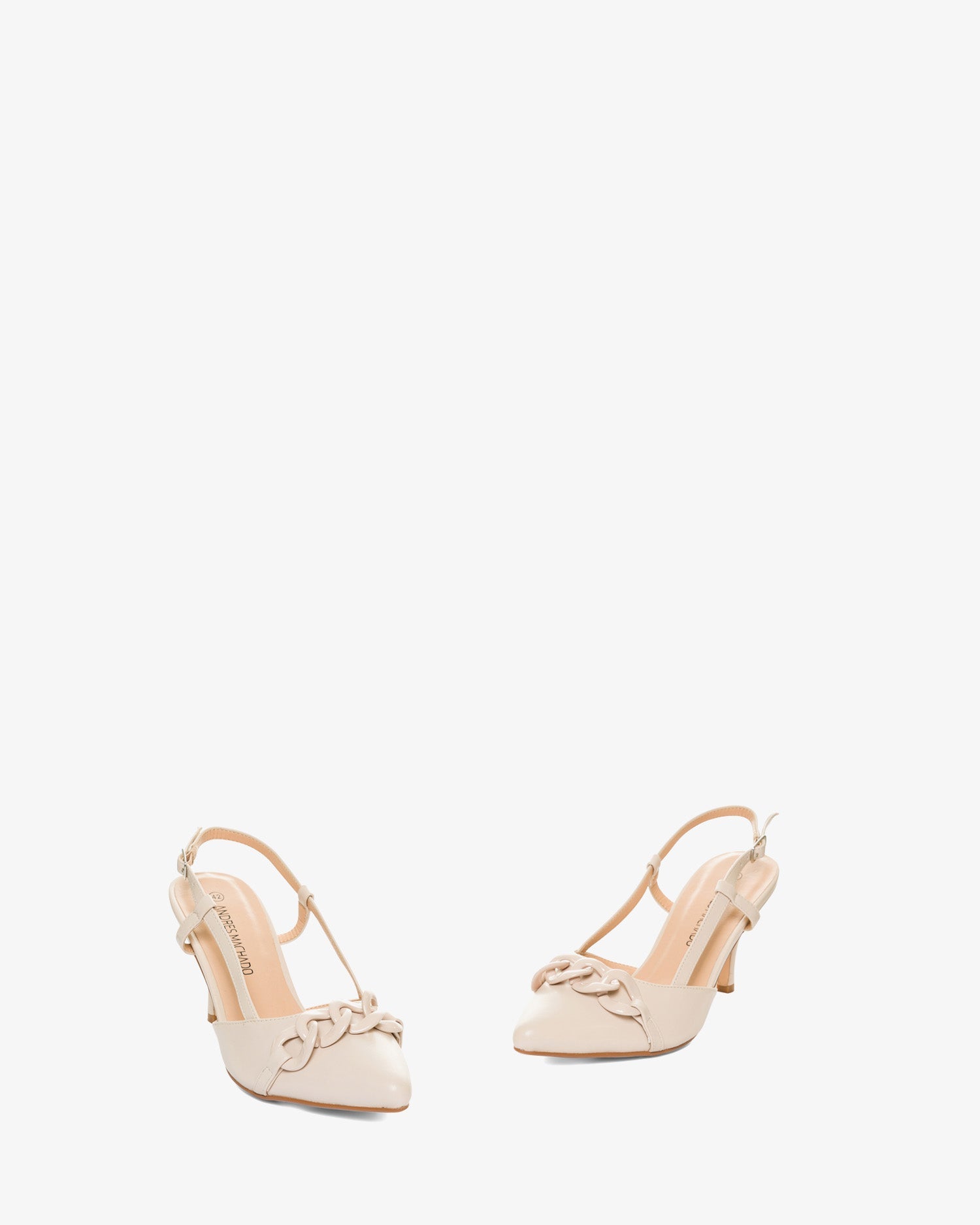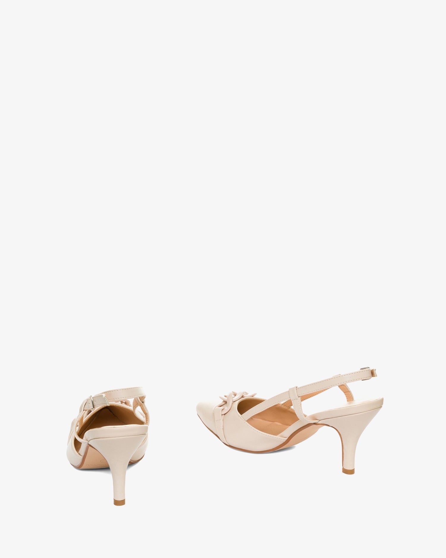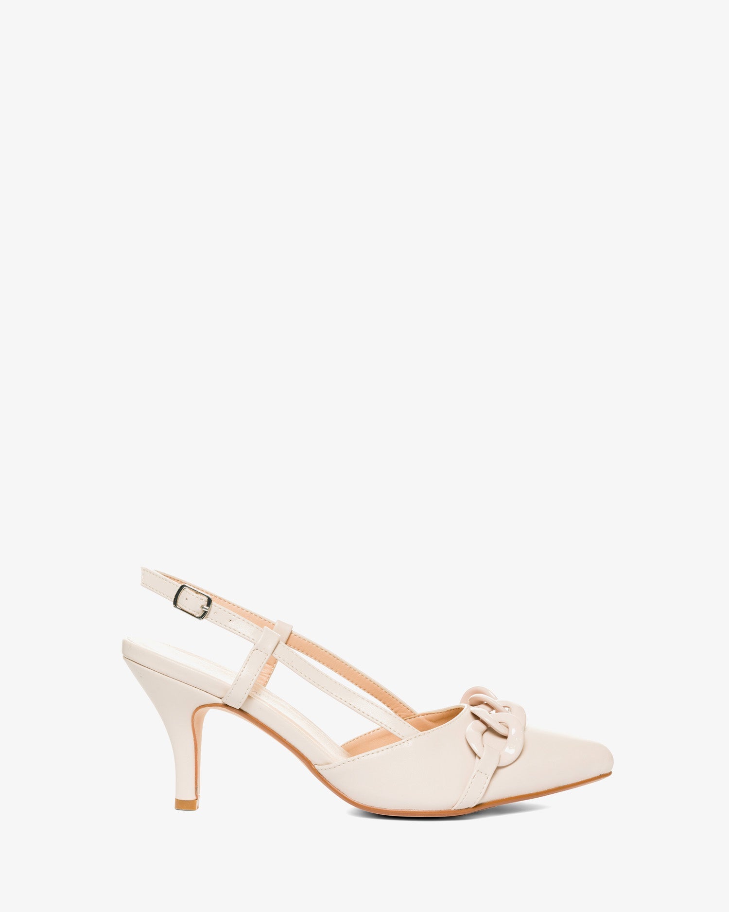 Cream-colored pump with a mid-heel. Features a pointed toe and a matching chain detail at the front. The open-back design includes side straps that wrap around the foot. A matching metal buckle closure completes the look. The heel height is 7 cm for smaller sizes (32-35) and 9 cm for larger sizes (42-45).