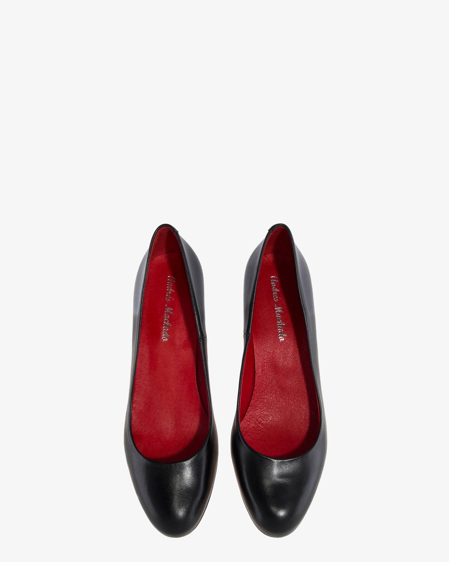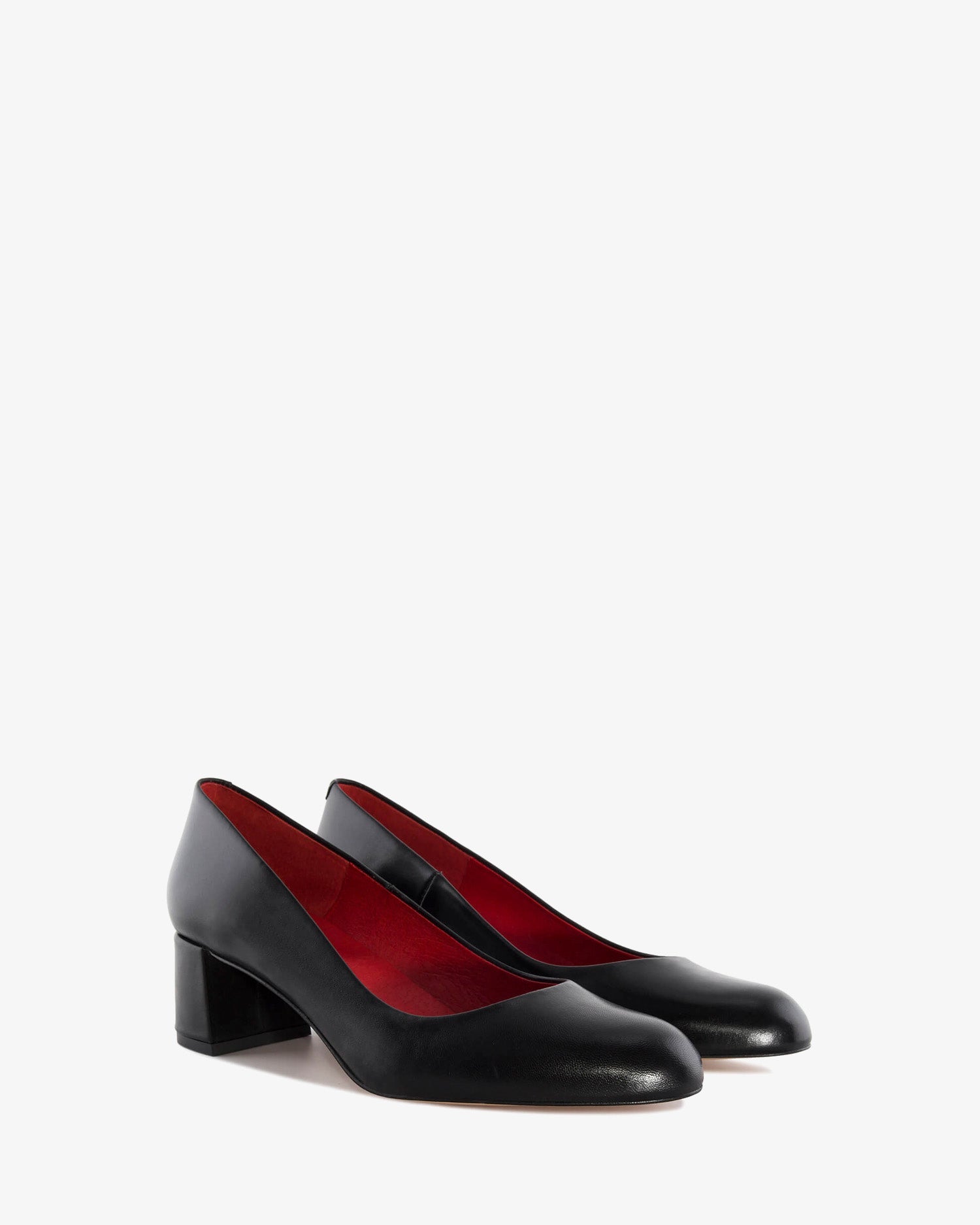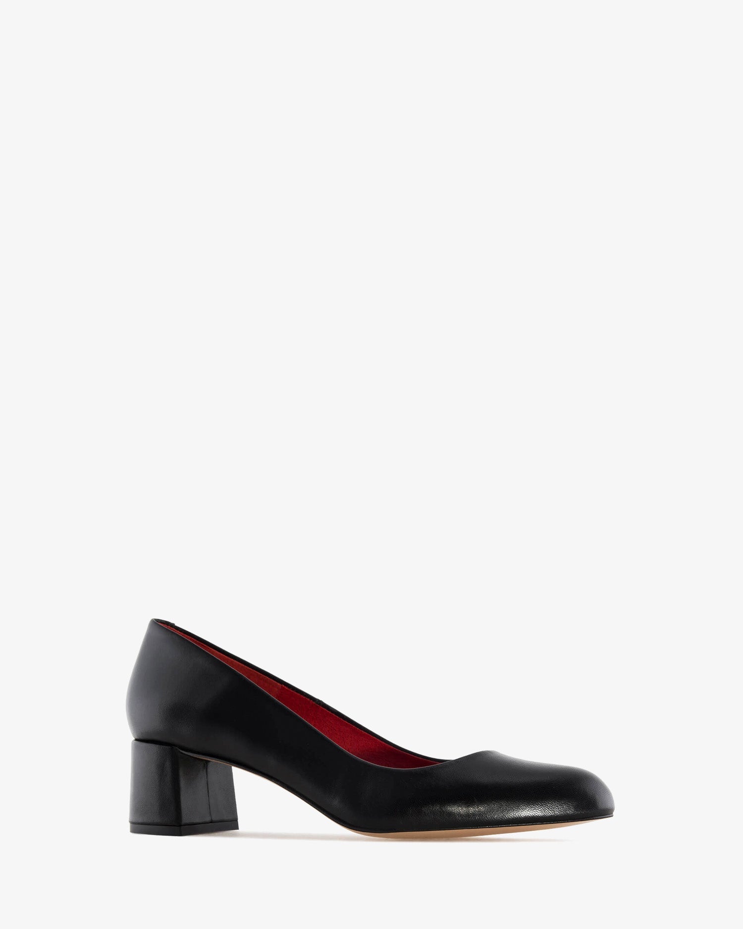 Black leather pump. Red leather lining and insole. 4 cm block heel in matching leather for smaller sizes (32-35). 4.5 cm heel for medium sizes (36-41). 5 cm heel for larger sizes (42-45). Made in Spain. This style runs small; we recommend ordering one size up.