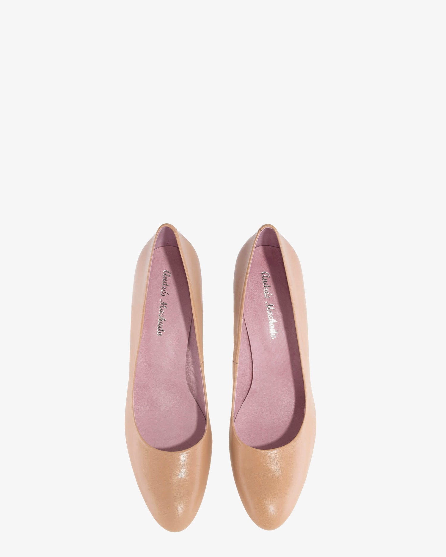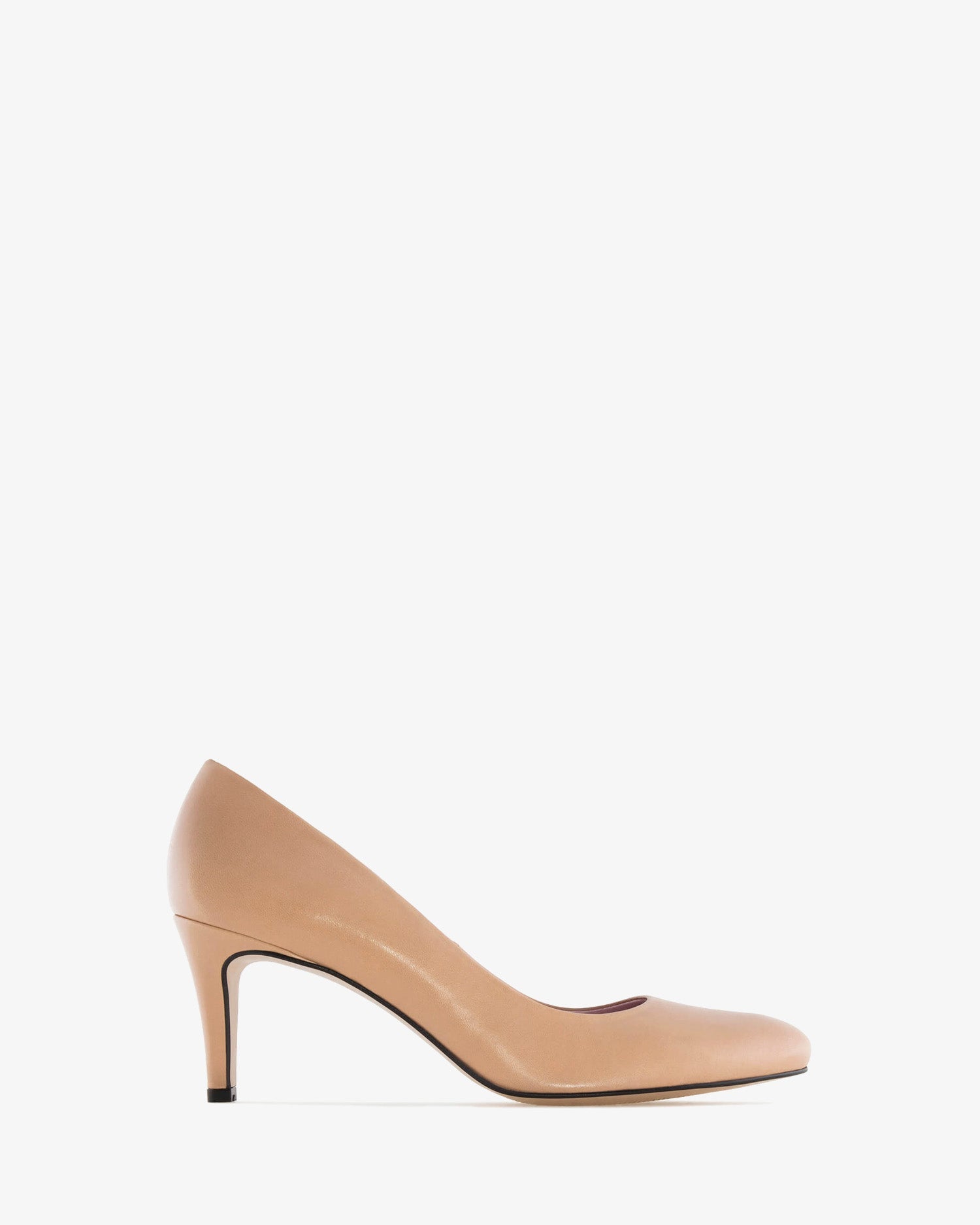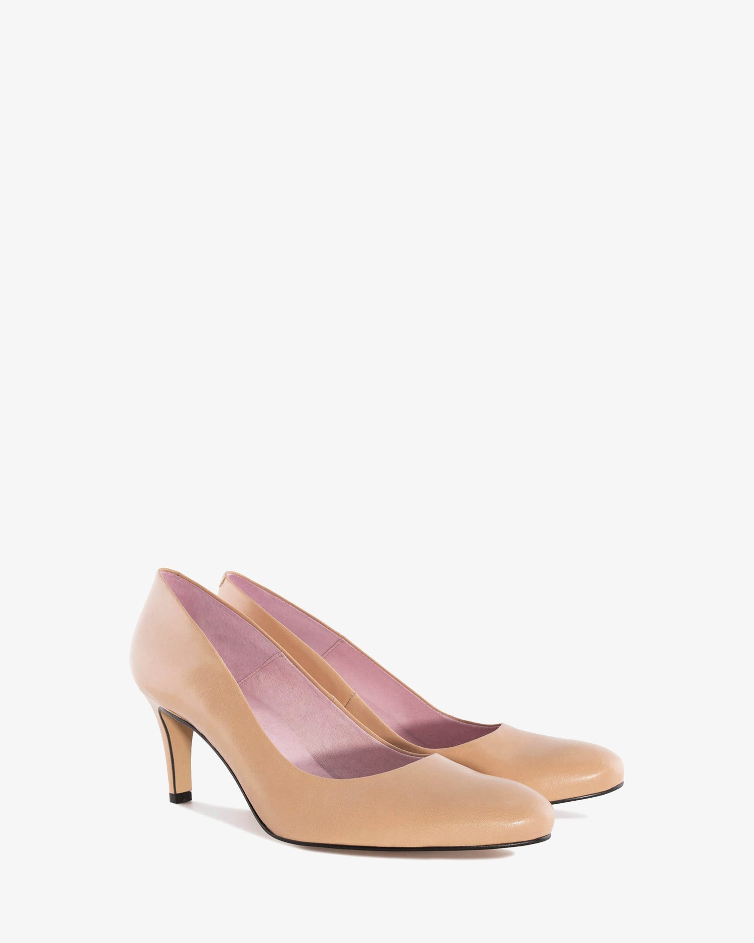 Nude leather pumps. Pink leather insole and lining. Medium stiletto heel, 7 cm, covered in matching leather for smaller sizes (32-35). 7 cm heel for medium sizes (36-41). 8 cm heel for larger sizes (42-45). Made in Spain. This style runs large; we recommend ordering one size smaller than usual.