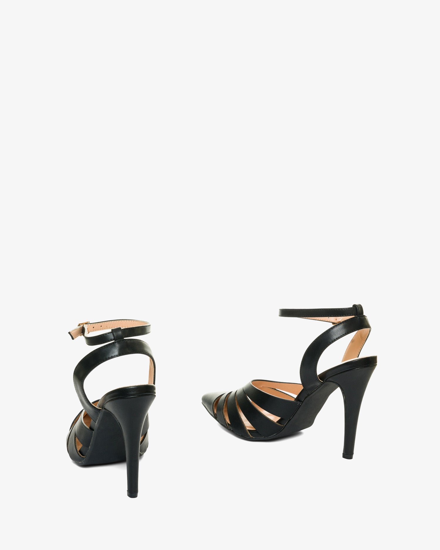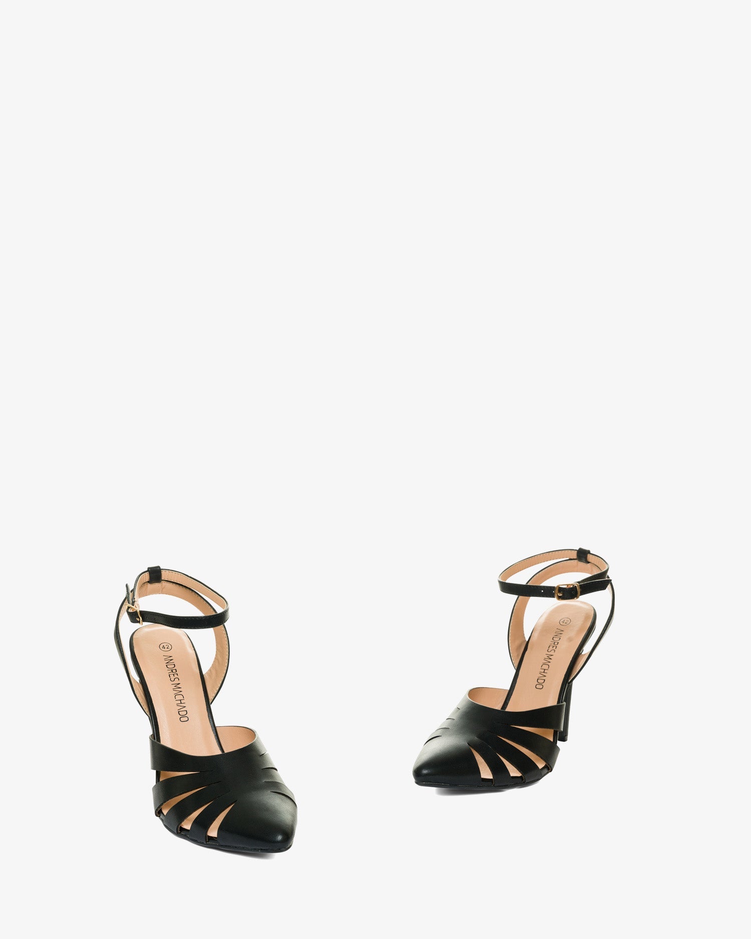 Black soft leather pointed-toe pump with decorative straps across the instep and a matching closed toe. Open heel and matching ankle strap with a metal buckle. 10 cm heel for smaller sizes 32-35. 12 cm heel for larger sizes 42-45.