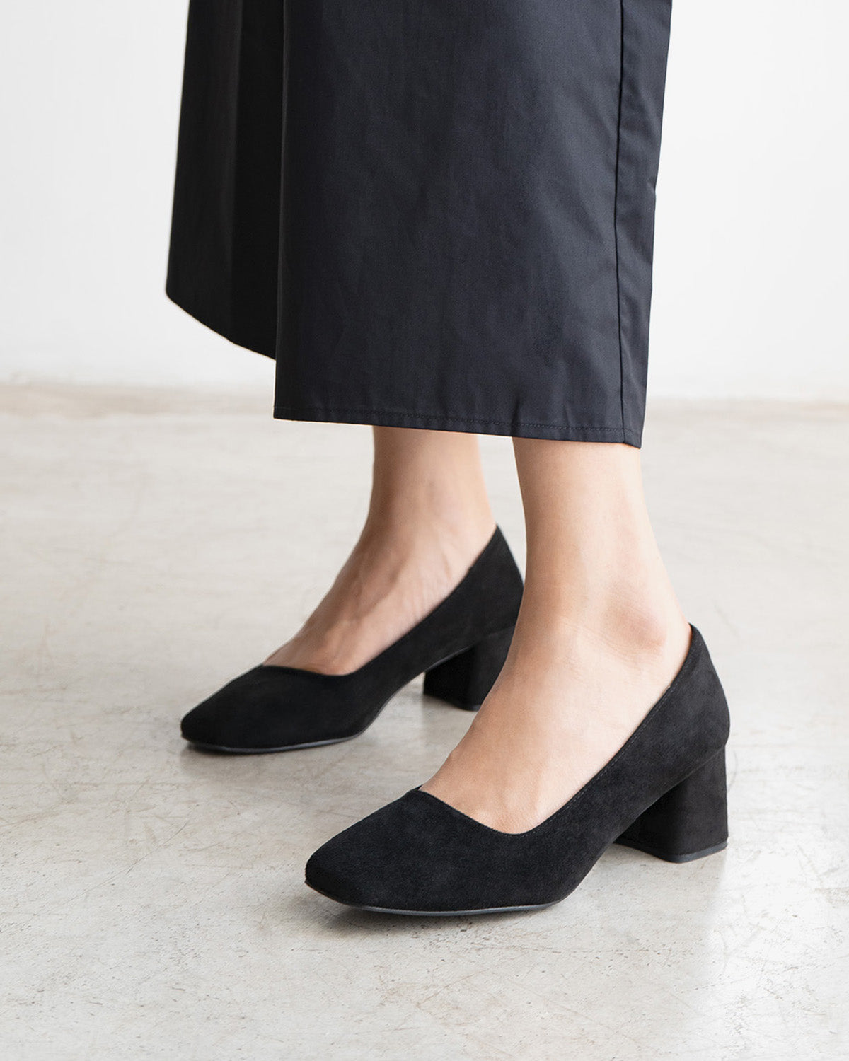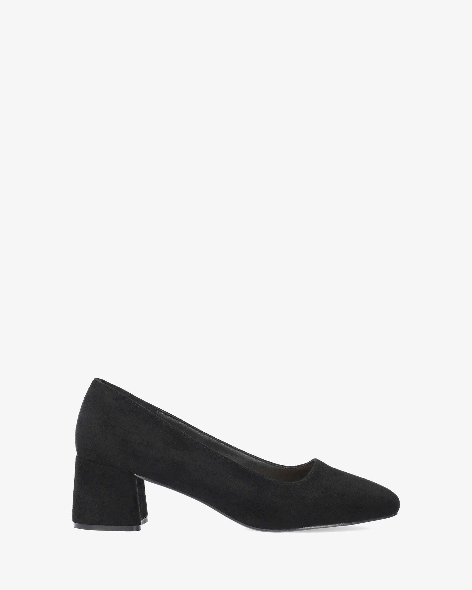 Black faux suede pump with a square toe. 6 cm block heel in matching fabric for smaller sizes 32-35. 6 cm heel for larger sizes 42-46.