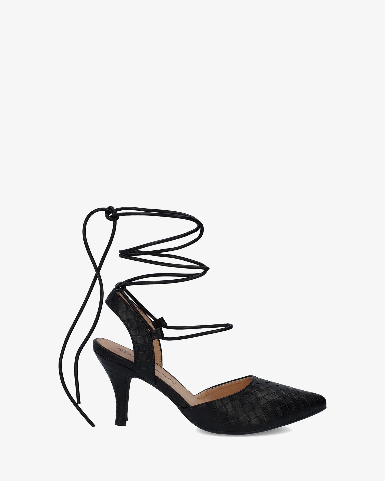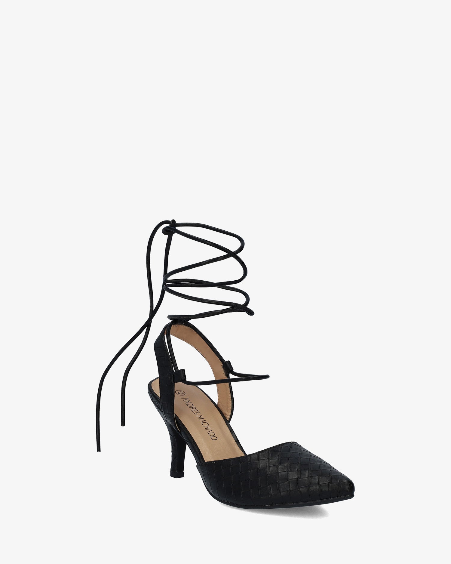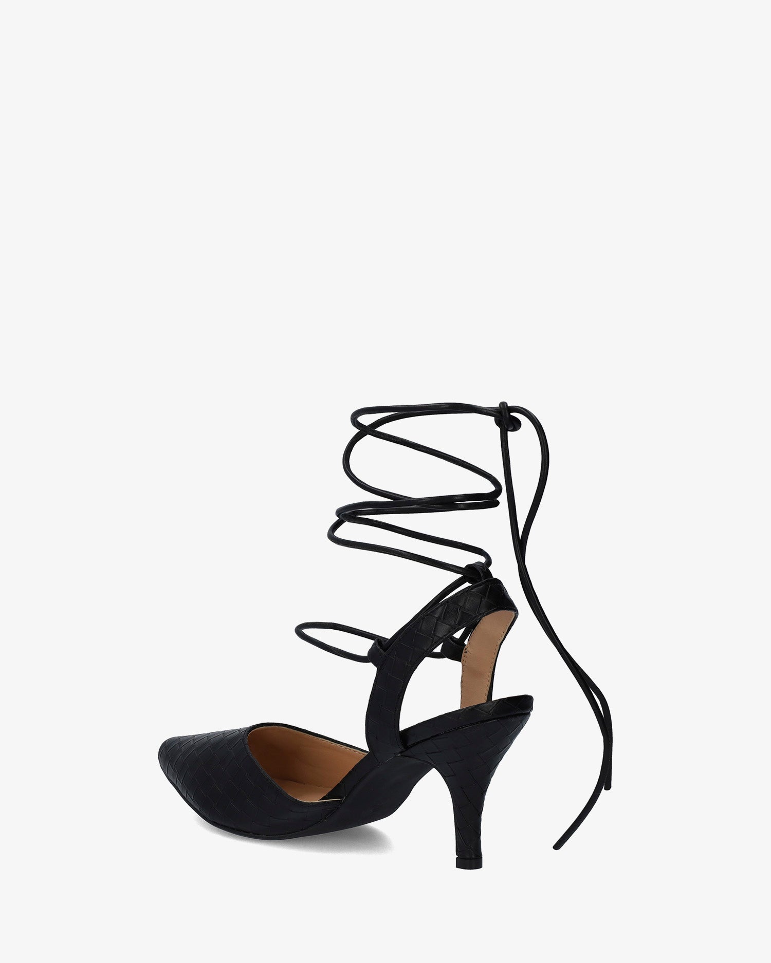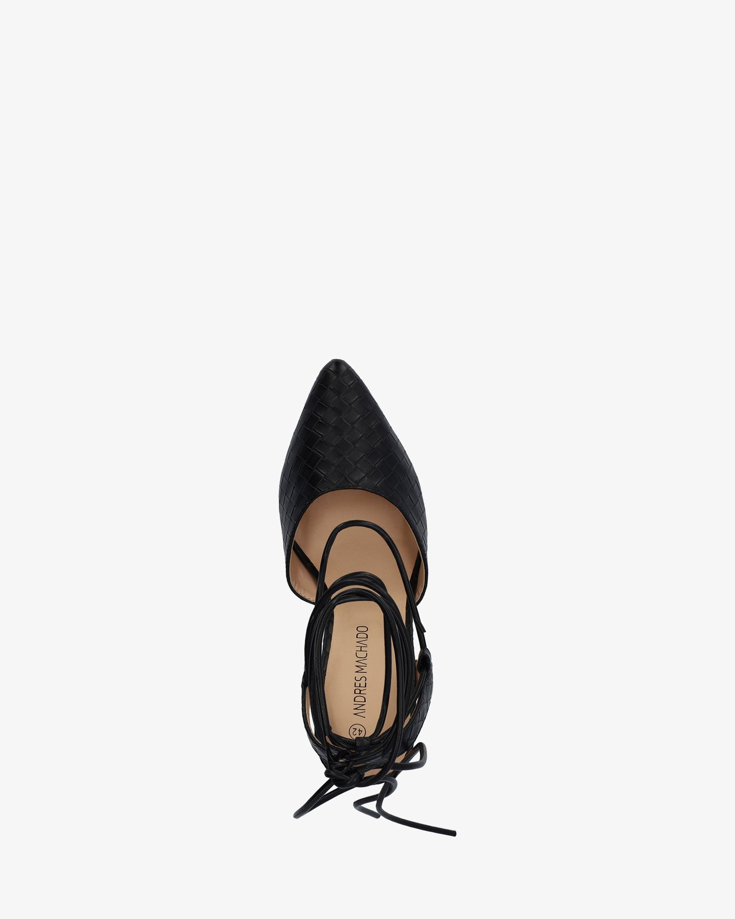 Black soft braided pump. Pointed toe with a matching braided mid-height heel. Backless design with thin matching straps that tie around the ankle. 7 cm heel for smaller sizes 32-35. 9 cm heel for larger sizes 42-45.