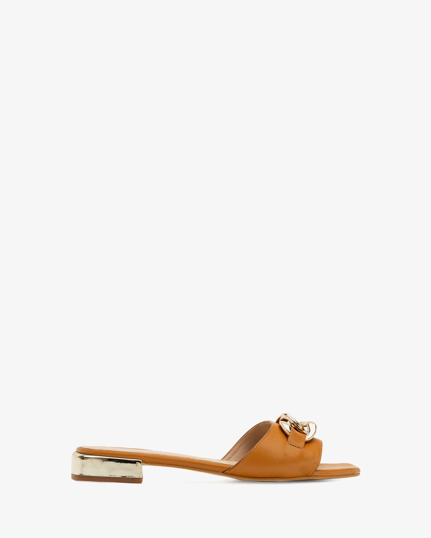 Camel-colored leather flat sandal. Wide, smooth camel-colored leather strap across the instep with a maxi gold-tone metal chain detail. Square toe. Available in sizes 32 to 45. Gold heel. 2 cm heel for all sizes 32 to 45. Made in Spain.