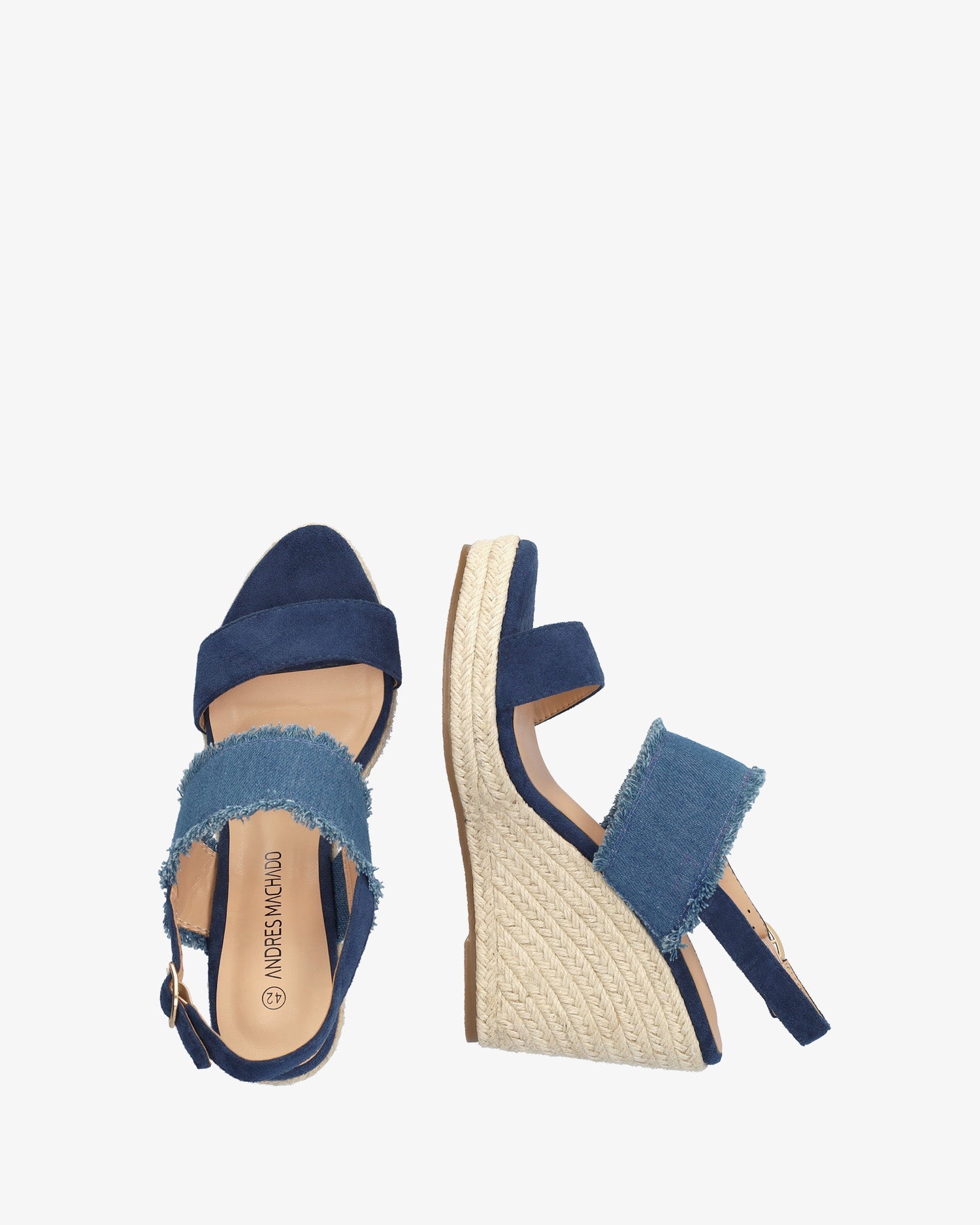 Blue faux suede wedge sandal. Features a backless design with two wide straps: one in suede at the front and another across the instep in a Western style. Gold buckle closure with a matching ankle strap. Open, rounded toe. Jute wedge and platform. Smaller sizes (32-35) have an 11 cm wedge and a 3 cm platform. Larger sizes (42-46) have a 12 cm wedge and a 3 cm platform.