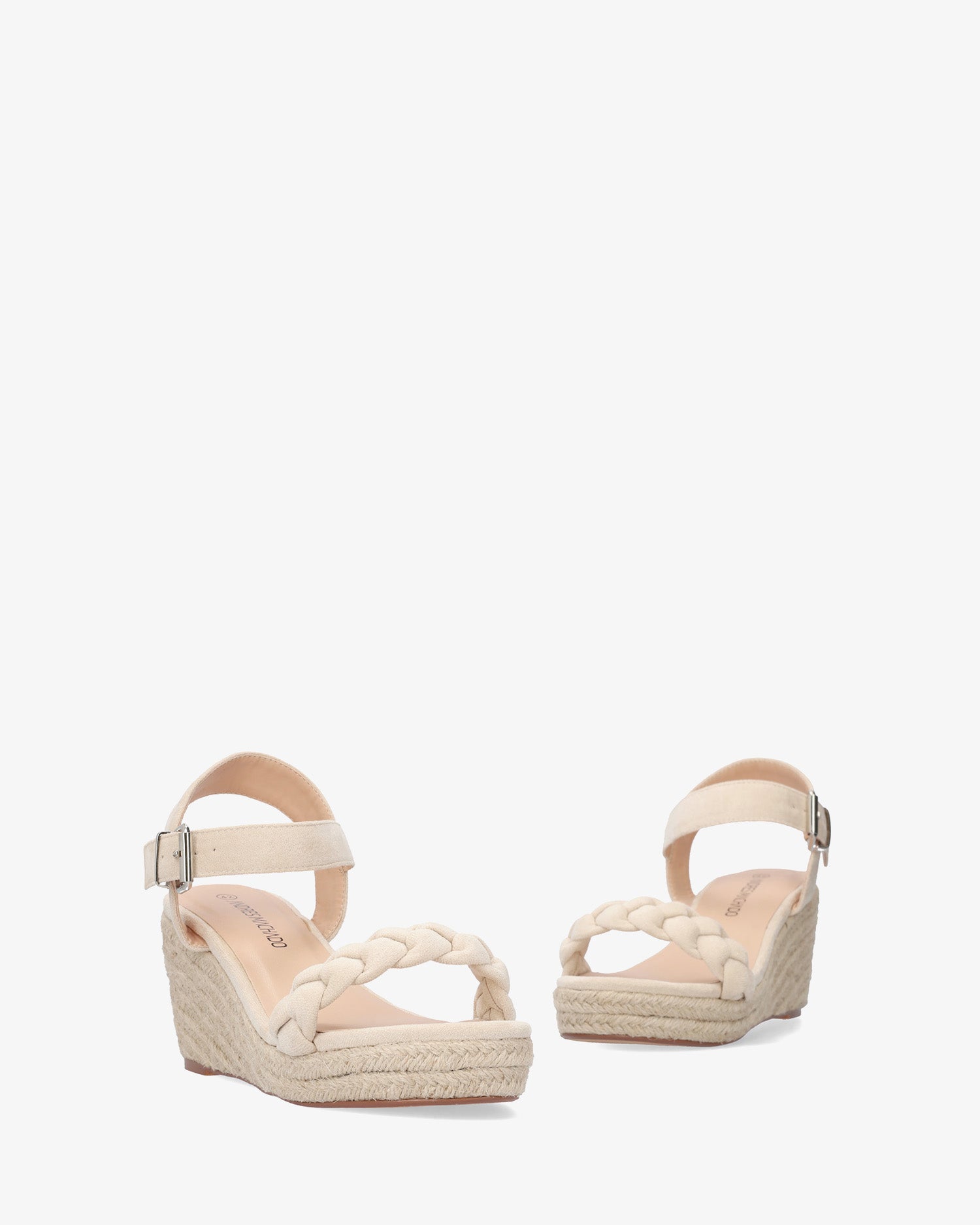 Beige faux suede wedge sandals. Backless design with a wide, tonal braided strap at the front. Metal buckle closure with a wide ankle strap. Open toe. Jute wedges and platform. 7 cm wedge and 2.5 cm platform for smaller sizes (32-35). 8.5 cm wedge and 3 cm platform for larger sizes (42-45). This style may have slight variations in size; we recommend checking the insole measurements.