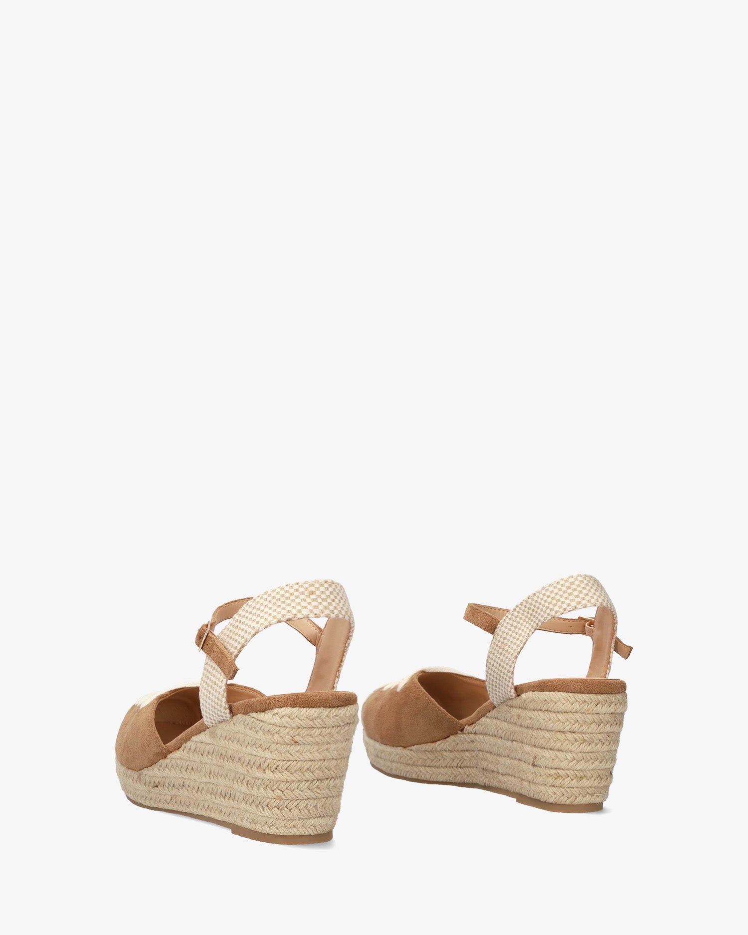 Camel-colored jute wedge sandal with a suede-like finish. Backless design with a rounded, closed toe, featuring a fabric detail and wide laces at the front. Fastens with a metal buckle and matching ankle strap for added security. Jute wedge and platform. 7 cm wedge and 2 cm platform for smaller sizes (32-35). 8 cm wedge and 2.5 cm platform for larger sizes (42-46).