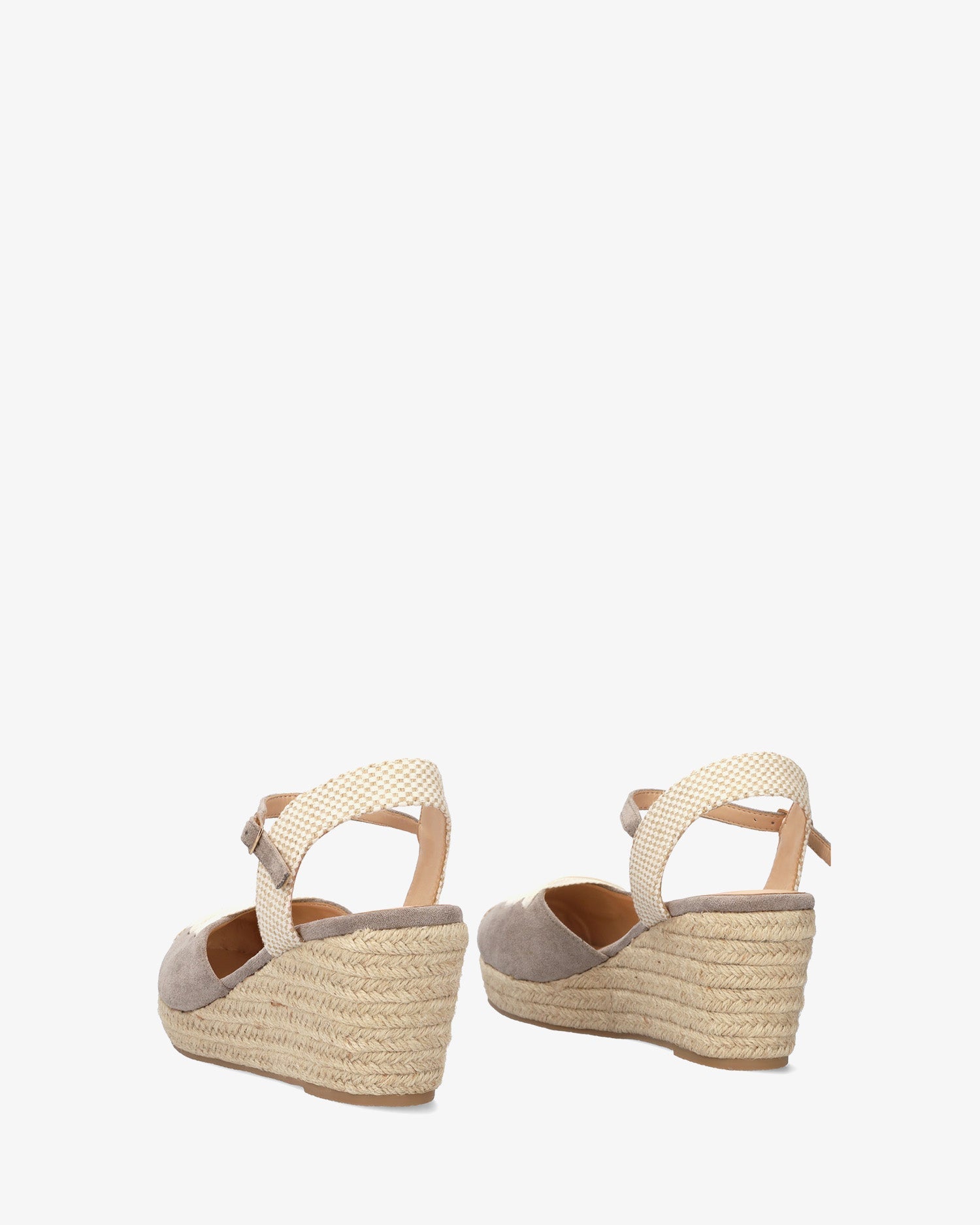 Gray faux suede jute wedge sandal. Backless design with a rounded, closed toe, featuring fabric detailing and wide laces at the front. Fastens with a metal buckle and matching ankle strap for added security. Jute wedge and platform. Smaller sizes (32-35) have a 7 cm wedge and a 2 cm platform. Larger sizes (42-46) have an 8 cm wedge and a 2.5 cm platform.