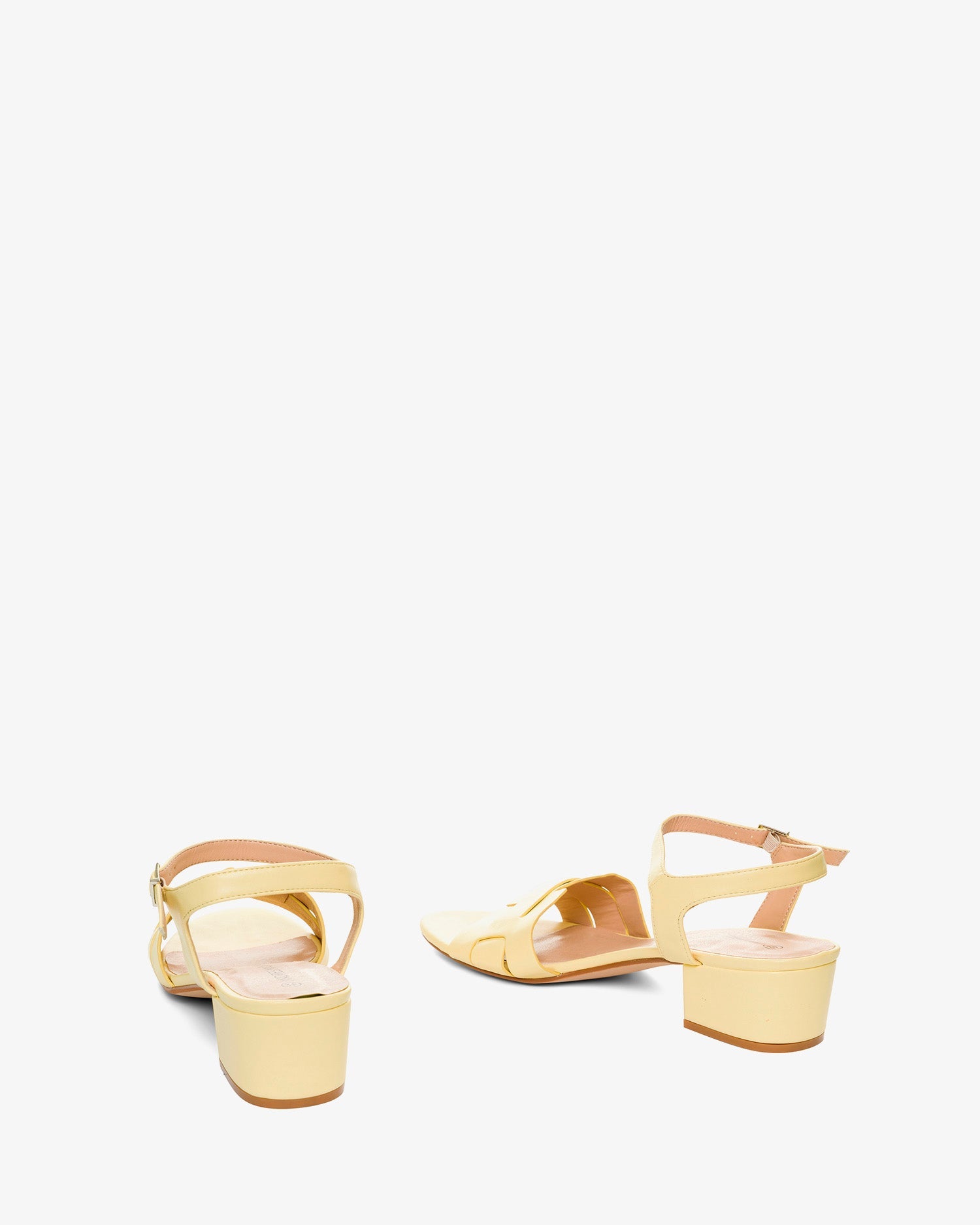Soft yellow block heel sandals. Backless design with a wide strap and a thin strap intertwined at the toe in matching colors. Ankle strap with a metal buckle. Rounded, open toe. 5 cm heel for smaller sizes (32-35). 5.5 cm heel for larger sizes (42-45).