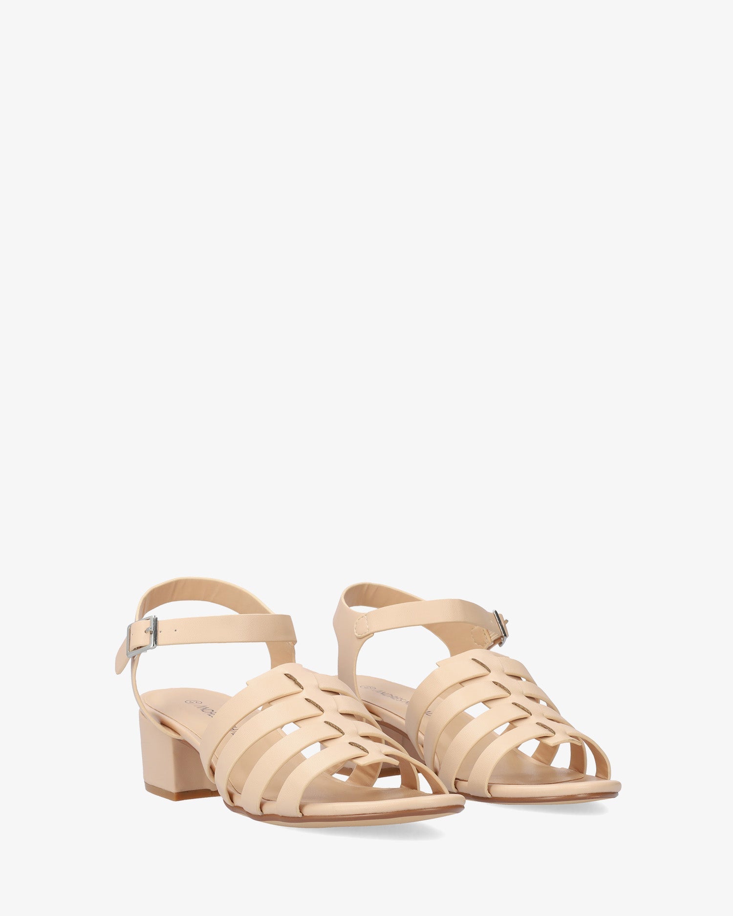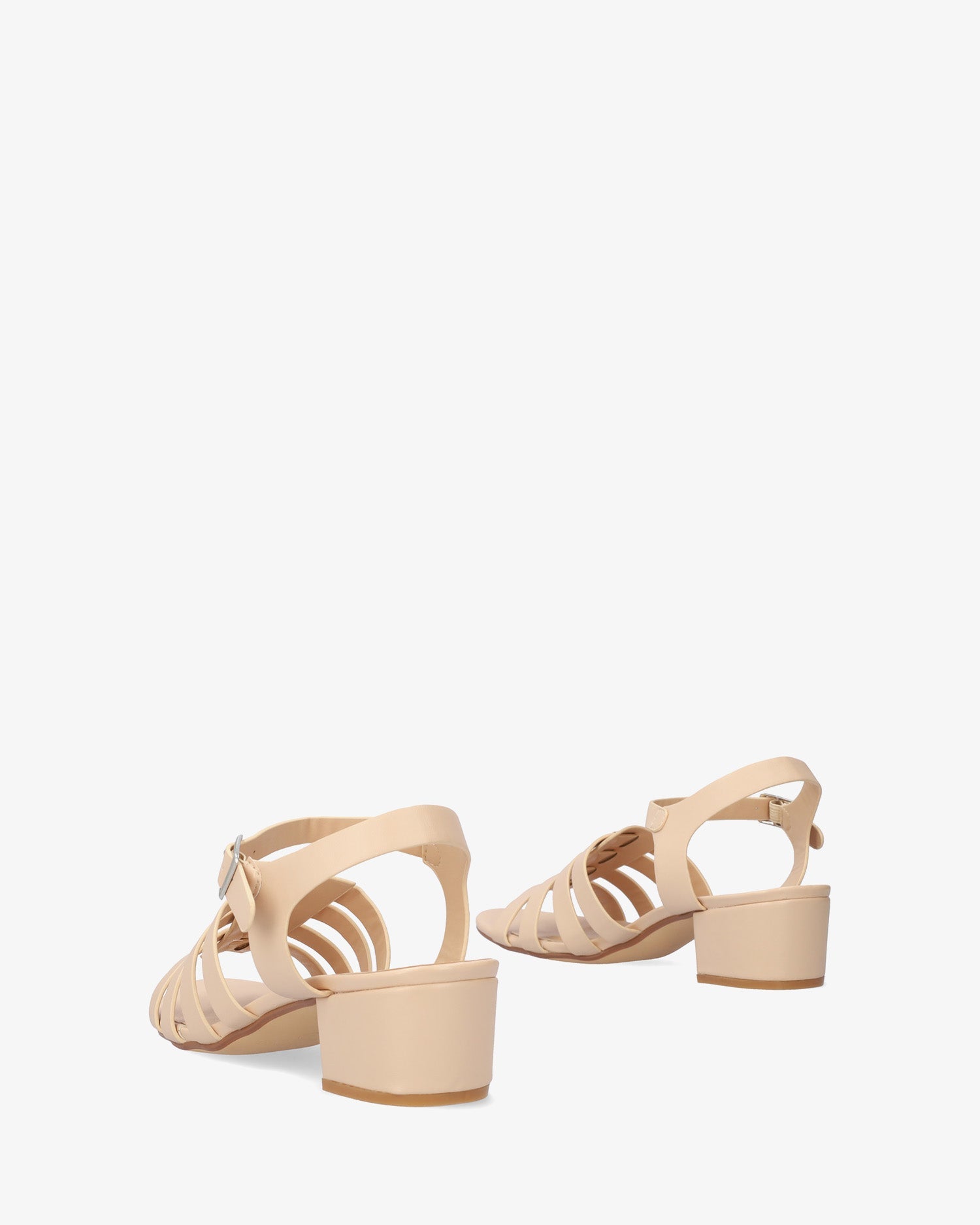 Soft nude sandals with a square heel. Backless design with thin, parallel straps joined by a matching central strap. Open, rounded toe. Metal buckle closure around the ankle. 5 cm heel for smaller sizes 32-35. 5.5 cm heel for larger sizes 42-45.
