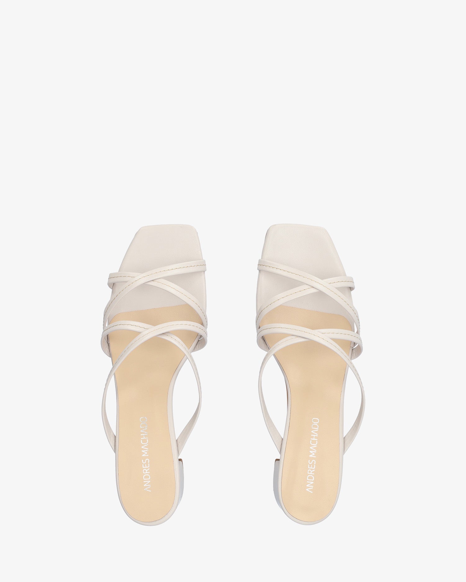 Grey leather heeled sandals. Features a design with thin, crisscrossing straps at the front and instep, accented with stitching. Open-toe, square toe. 6 cm heel for sizes 32-35 (small), 36-41 (medium), and 42-45 (large). Made in Spain.