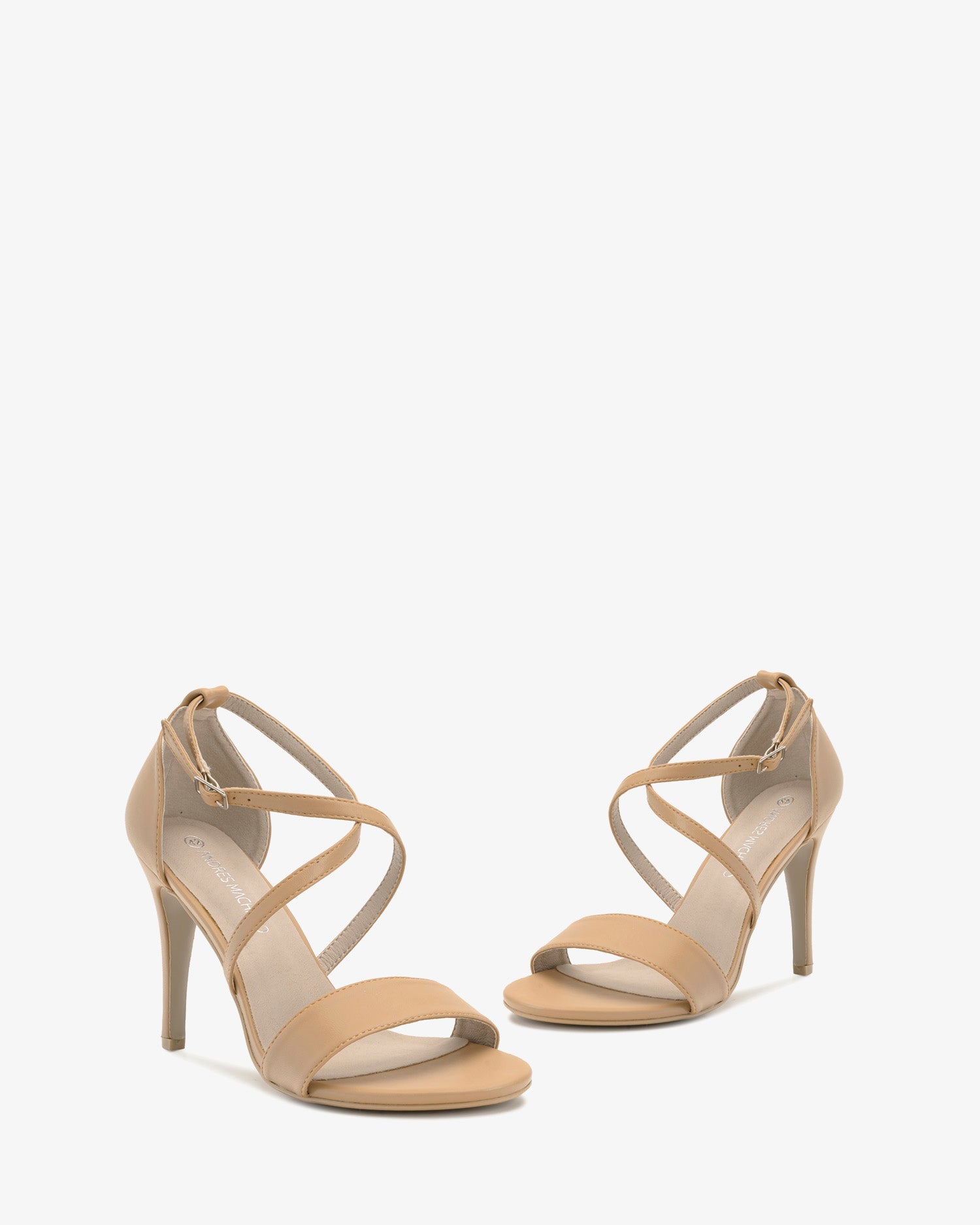 Soft nude heeled sandals. Features a wide tonal strap at the toe and thin crisscrossing straps across the instep with a side buckle closure. The heel is covered in the same color. The heel is 8 cm high and covered in soft nude for smaller sizes (32-35). The heel is 10.5 cm high for larger sizes (42-45).