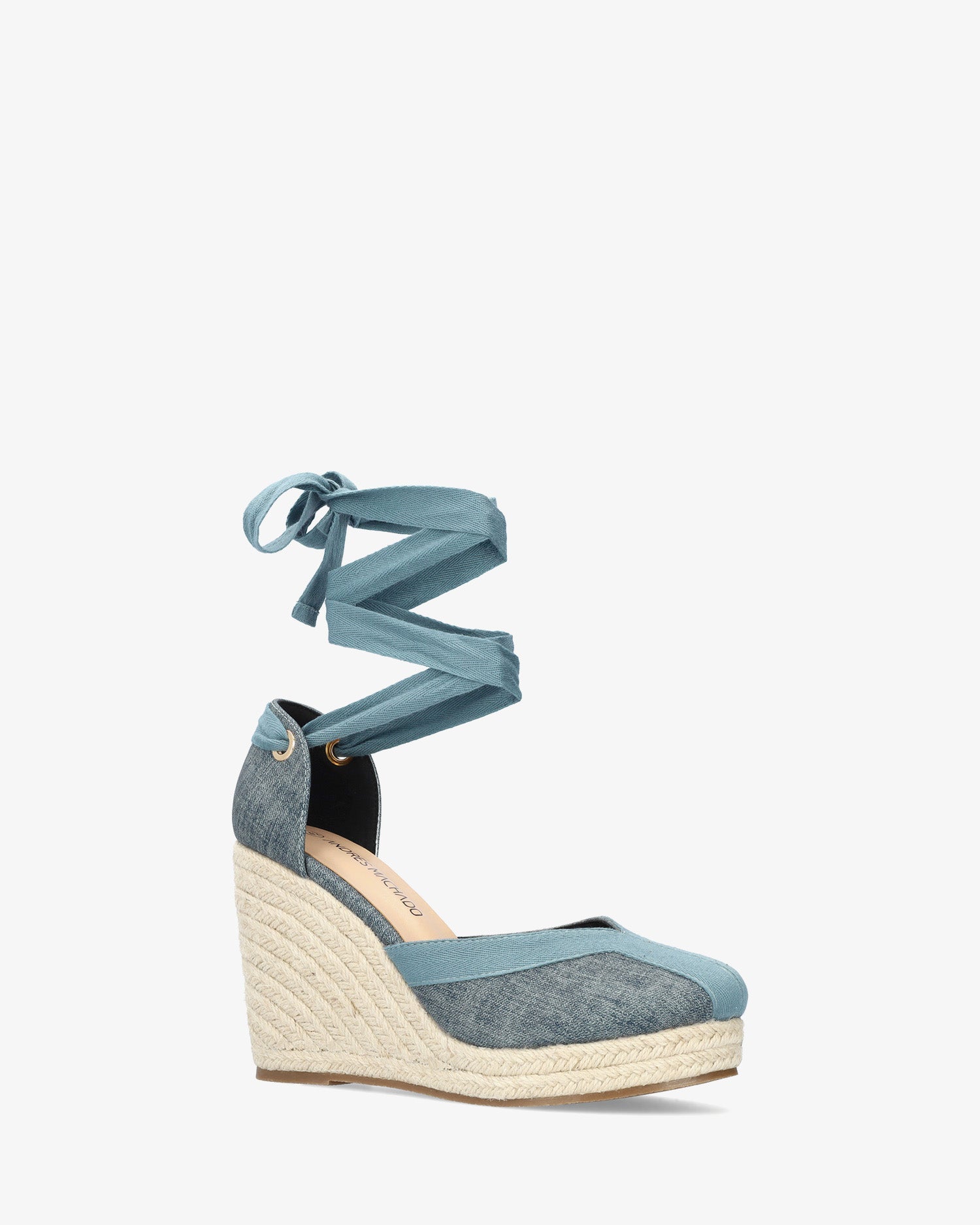 Turquoise jute wedge sandals. Features a toggle detail for ankle ties, a V-neck trim adorned with tonal ribbon, a wide lace-up closure, an open heel, and a rounded closed toe. The wedge and platform are made of jute. The wedge is 10 cm and the platform 2 cm for smaller sizes (32-35). The wedge is 11 cm and the platform 2 cm for larger sizes (42-46).