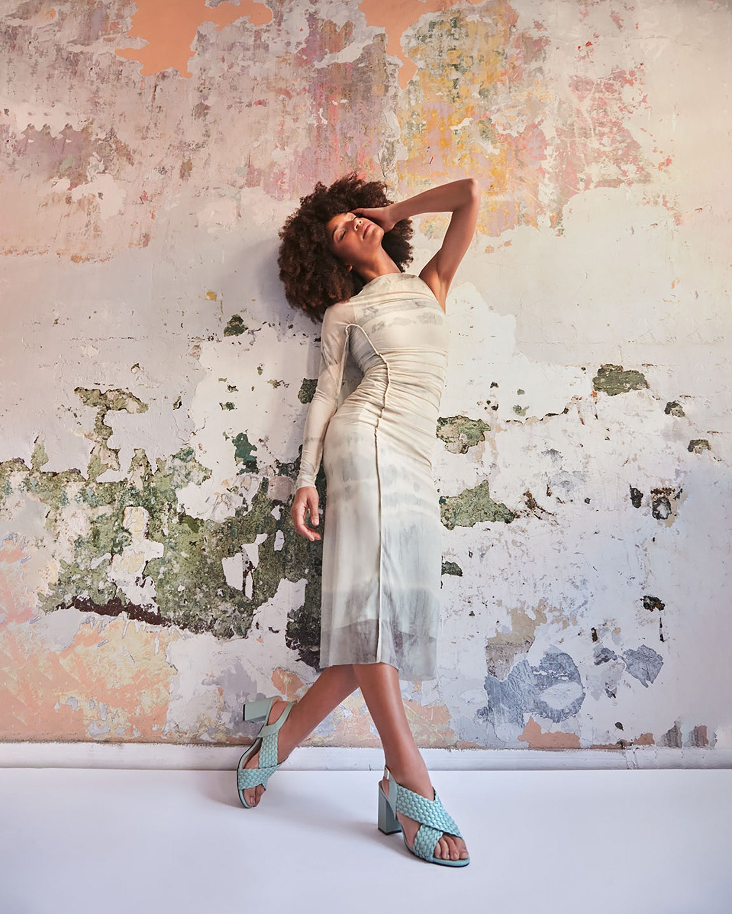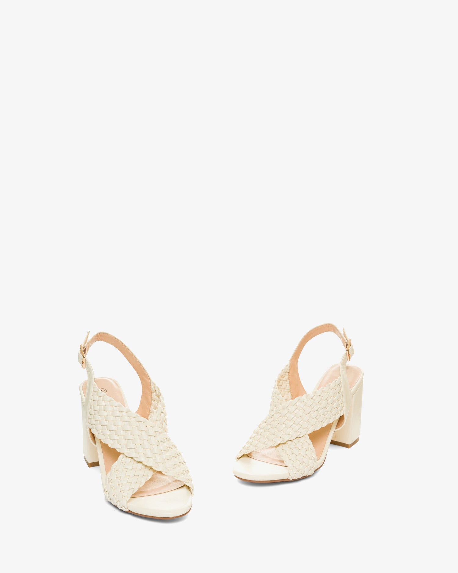 Soft white square-heeled sandals. Backless design with two wide, crisscrossed, braided straps across the instep in a matching color. Ankle strap with a metal buckle. Rounded, open toe. 8.5 cm heel for smaller sizes 32-35. 9.5 cm heel for larger sizes 42-45.