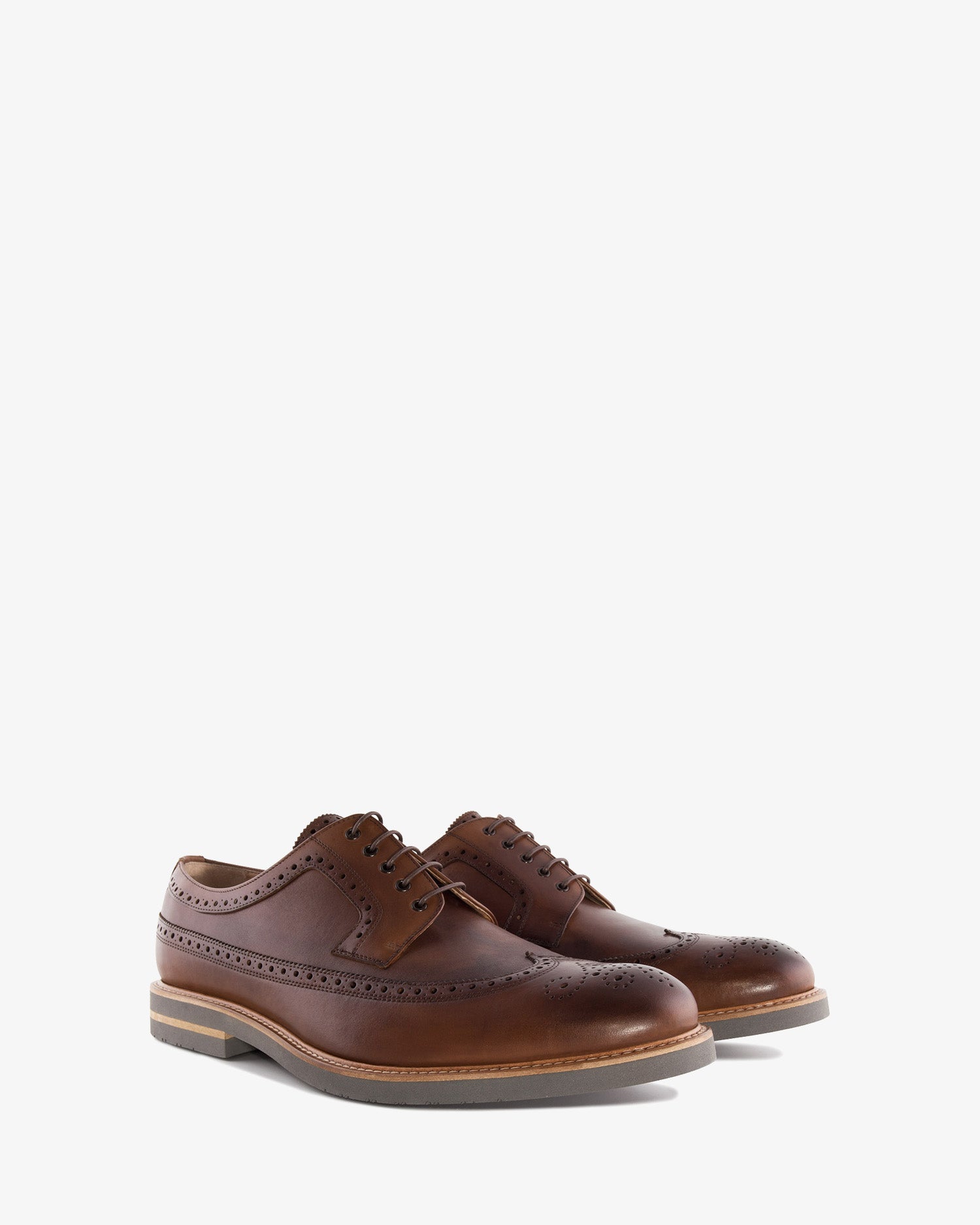 Men's Oxford-style shoe in brown leather with matching laces. Perforated details on the vamp and sides, characteristic of this style. Brown leather lining. Black EVA rubber sole with stitching. Made in Spain. Small sizes 37-40. Large sizes 47-52.