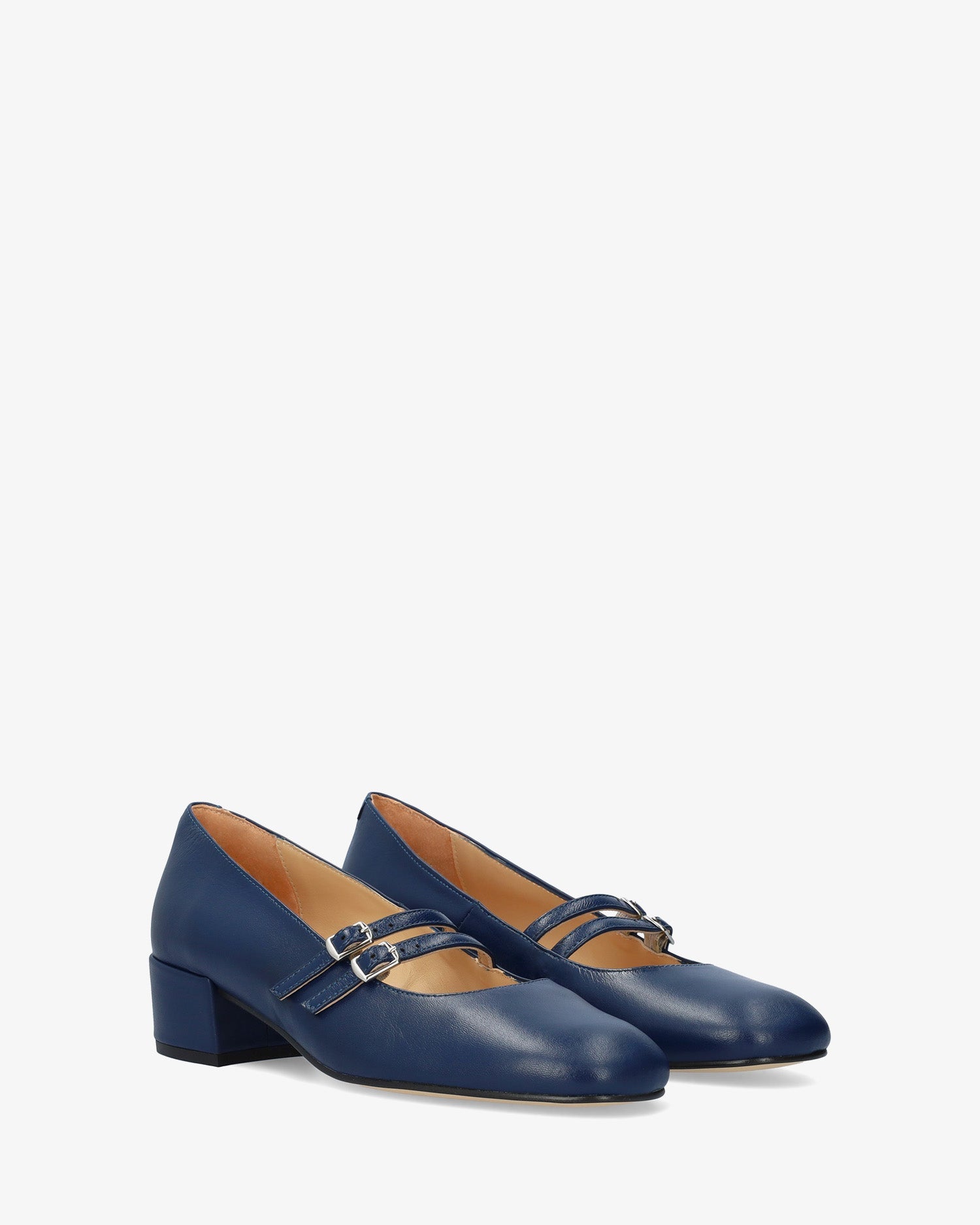 Navy blue leather shoe. Two-strap design in matching color with elastic over the instep and metal buckle closure. Leather lining and round toe. Wide, covered 4.5 cm heel for larger sizes 42 to 45. Made in Spain.