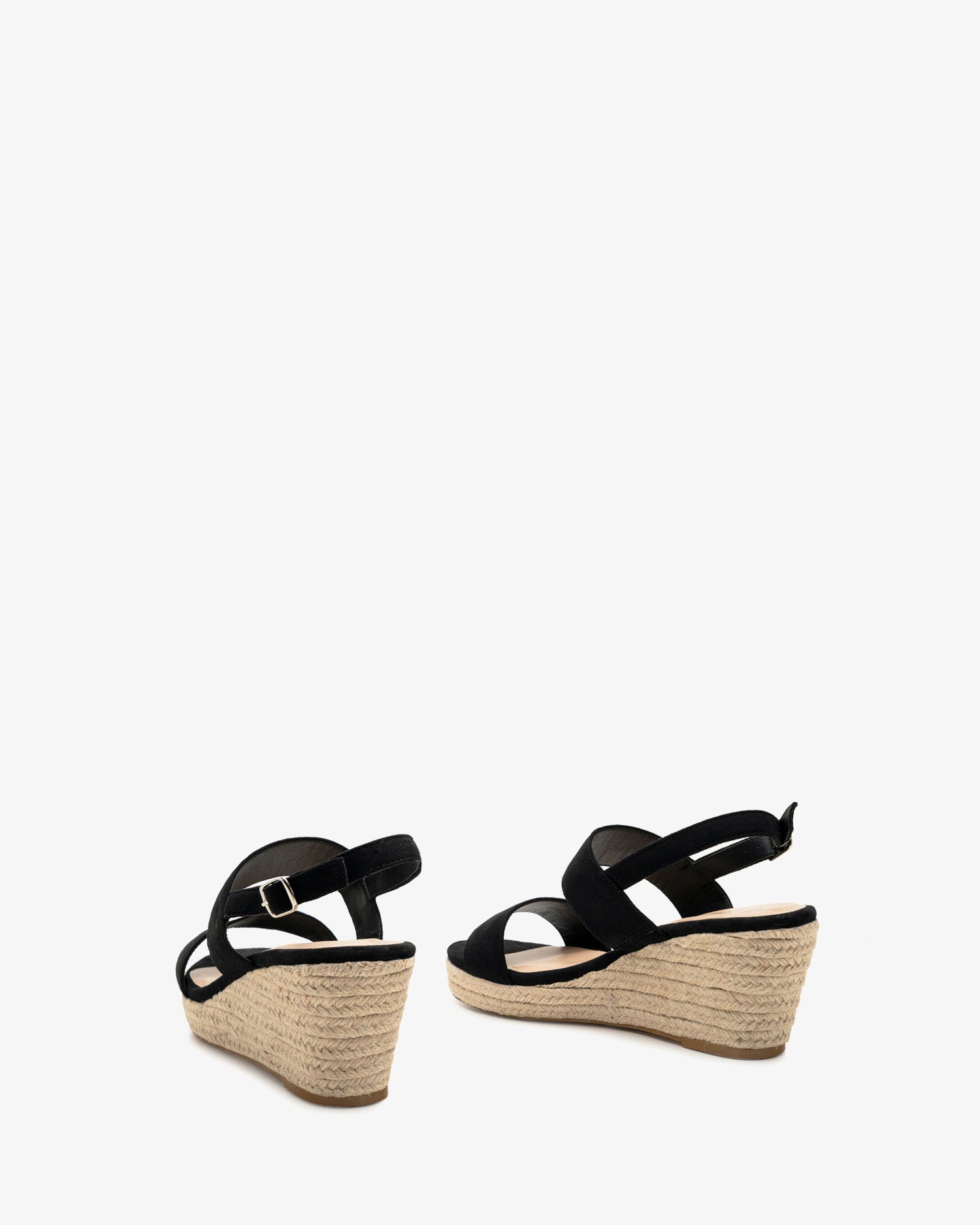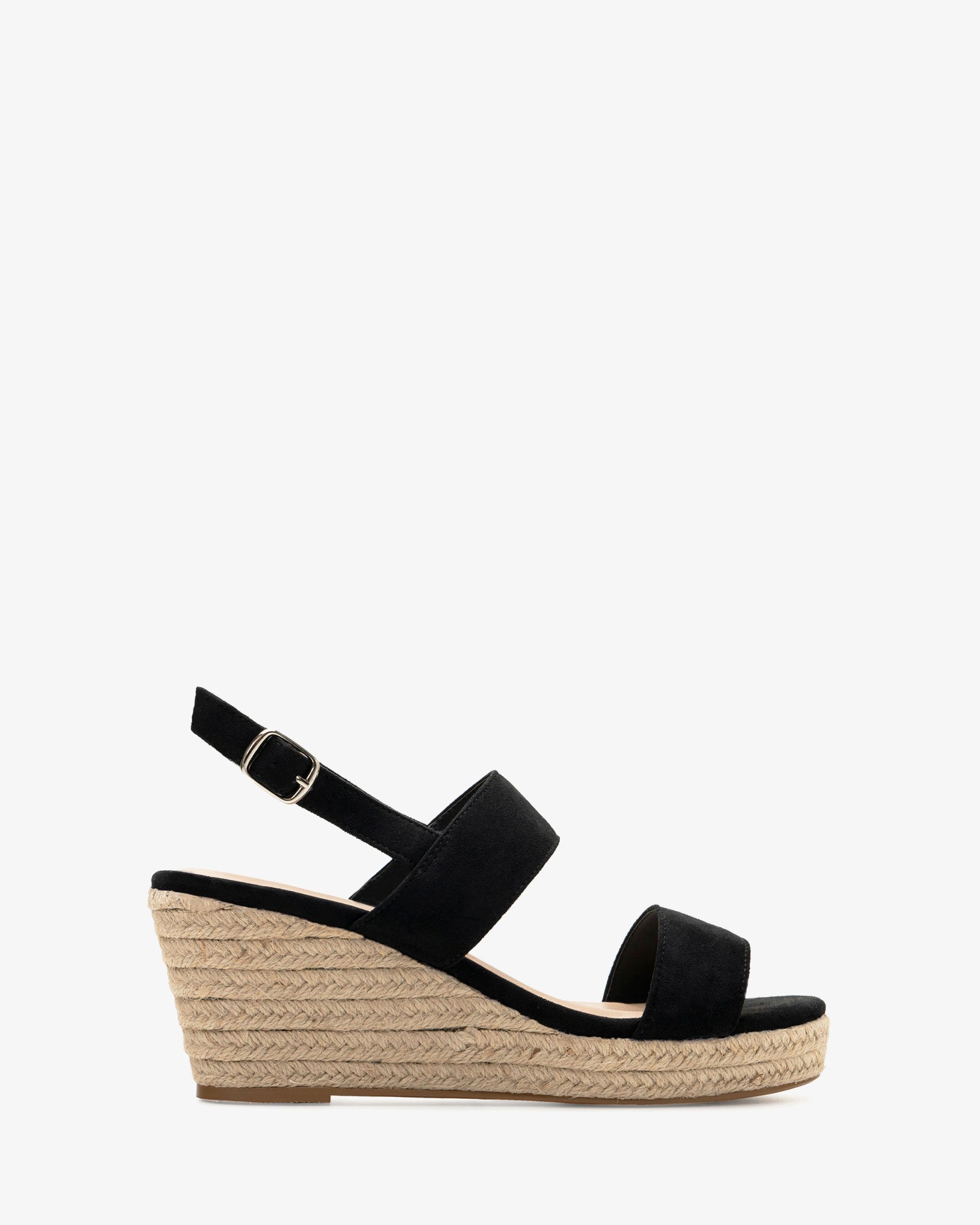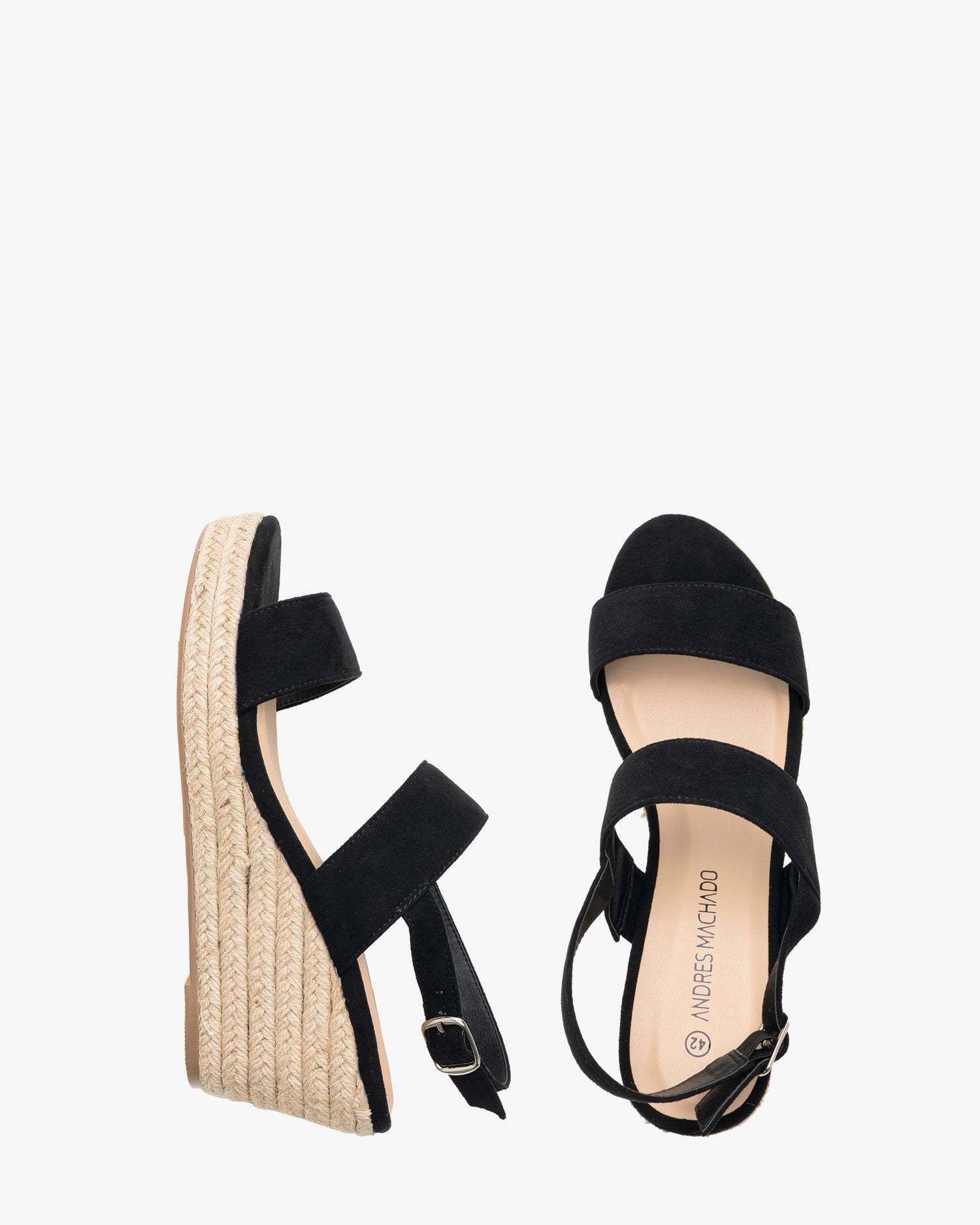 Alpargata en símil ante en color negro con cuña en yute. Diseño de dos tiras anchas al tono en la puntera y alrededor del empeine. Cierre de hebilla con tiras al tono en la parte trasera. Punta redondeada y abierta. Cuña de 7 cm yplataforma de 2 cm para las tallas pequeñas de la 32 a la 35. Cuña de 8 cm yplataforma de 2 cm para las tallas grandes de la 42 a la 45. Este modelo calza pequeño, se recomienda coger una talla más de la habitual.