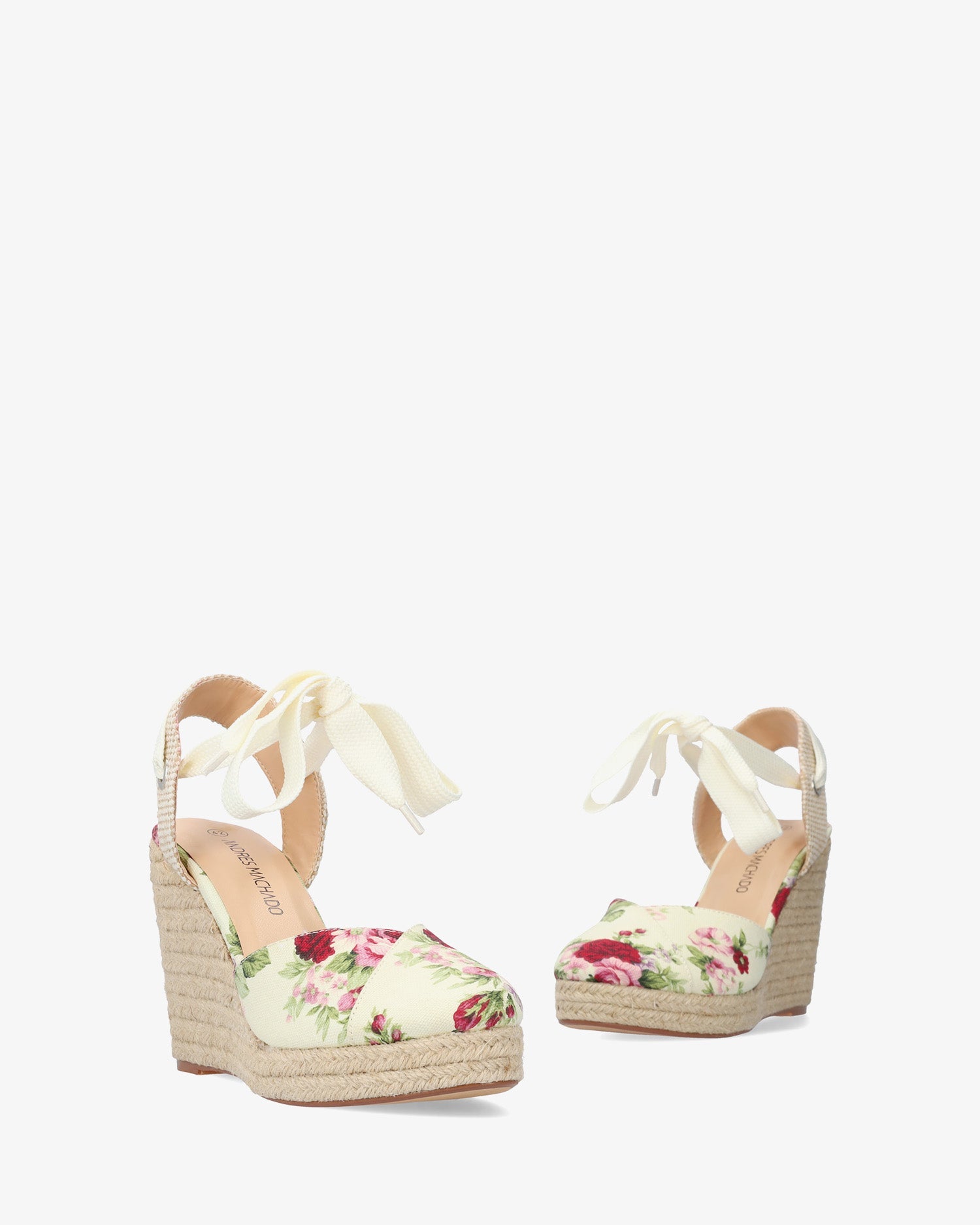 Alpargatas con cuña en tejido de color Beige con motivos florales. Diseño destalonado con banda de hilo cosida en la tira trasera. Punta redonda y cerrada con detalle de hilo cosido y cruzado en la parte delantera. Cierre con cordones anchos blancos en el tobillo. Cuñas y plataforma delantera en yute. Cuña de 10,5 cm y plataforma de 2,5 cm para las tallas pequeñas de la 32 a la 35. Cuña de 12 cm y plataforma de 2,5 cm para las tallas grandes de la 42 a la 45.