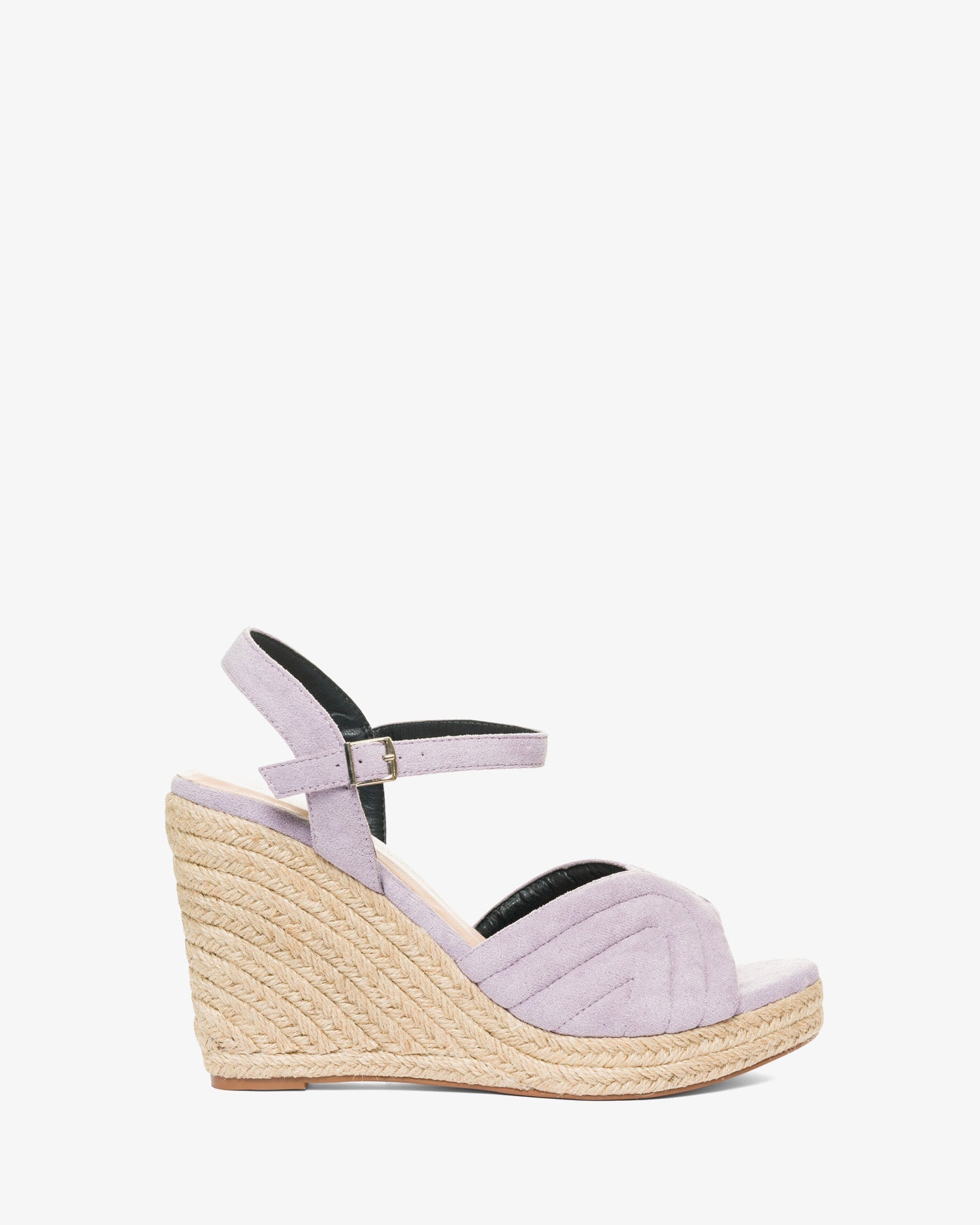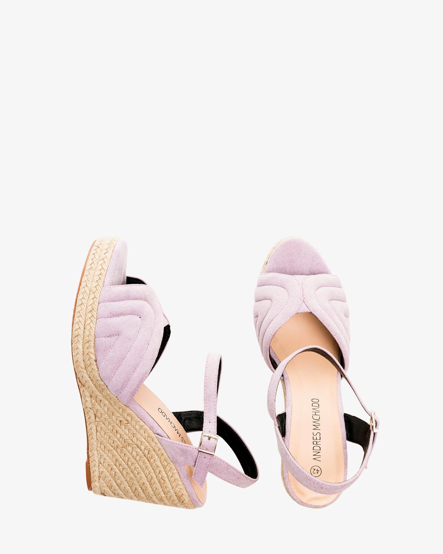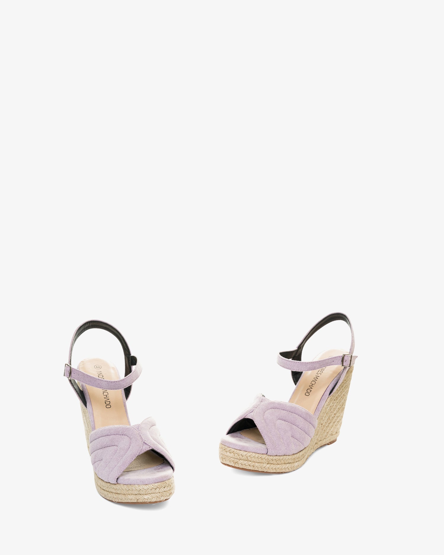 Alpargatas en simil ante de color Malva con cuña. Diseño destalonado con forma ondulada y en relieve en la parte delantera. Cierre de hebilla con pulsera al tono en el tobillo. Puntera abierta. Cuñas y plataforma delantera en yute. Cuña de 10 cm y plataforma de 2 cm para las tallas pequeñas de la 32 a la 35. Cuña de 12 cm y plataforma de 2 cm para las tallas grandes de la 42 a la 45.