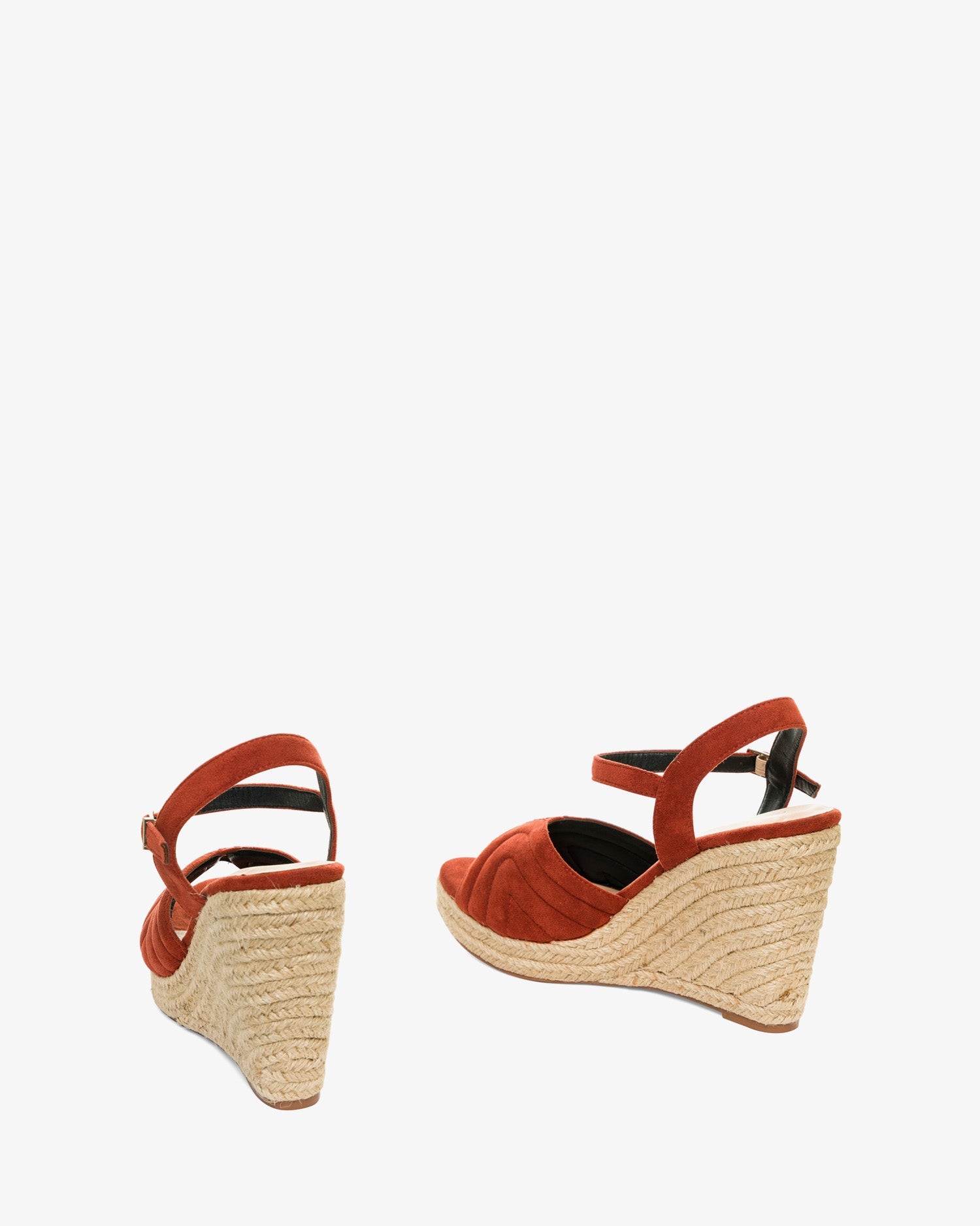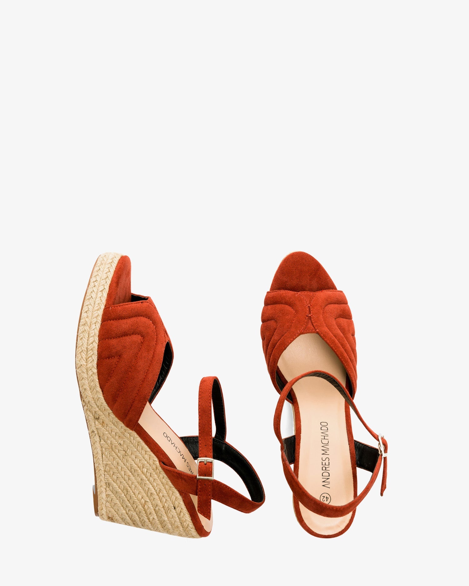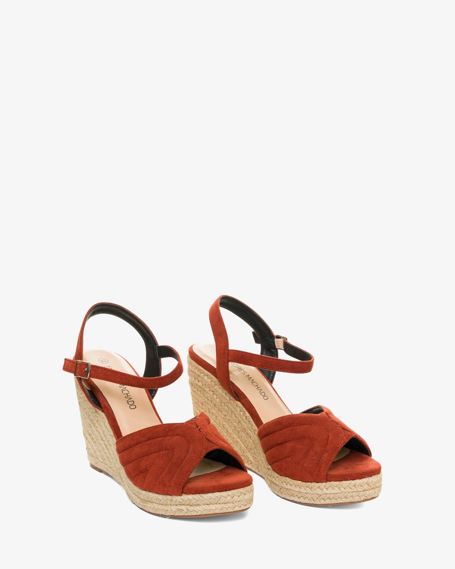 Alpargatas en simil ante de color Teja con cuña. Diseño destalonado con forma ondulada y en relieve en la parte delantera. Cierre de hebilla con pulsera al tono en el tobillo. Puntera abierta. Cuñas y plataforma delantera en yute. Cuña de 10 cm y plataforma de 2 cm para las tallas pequeñas de la 32 a la 35. Cuña de 12 cm y plataforma de 2 cm para las tallas grandes de la 42 a la 45.
