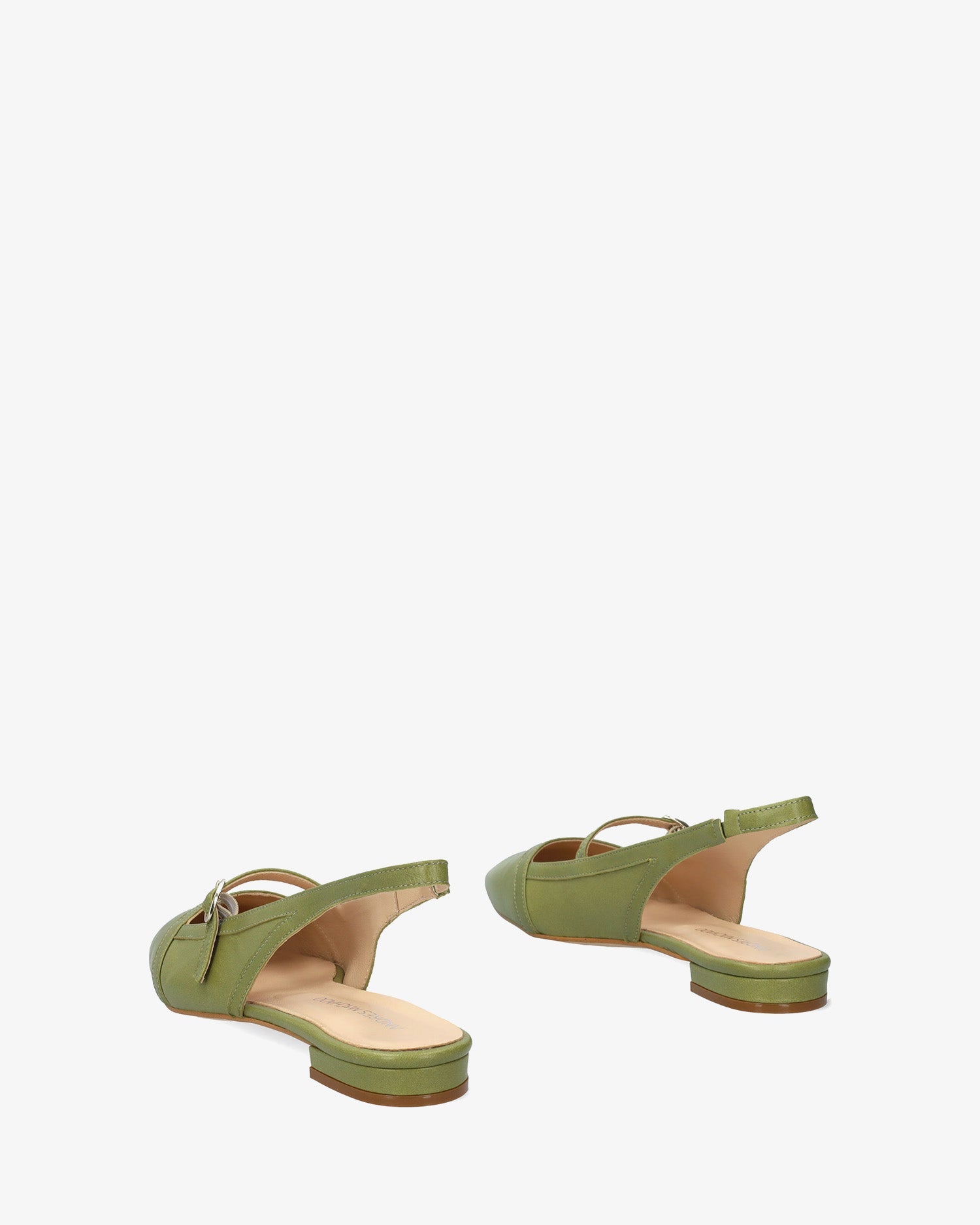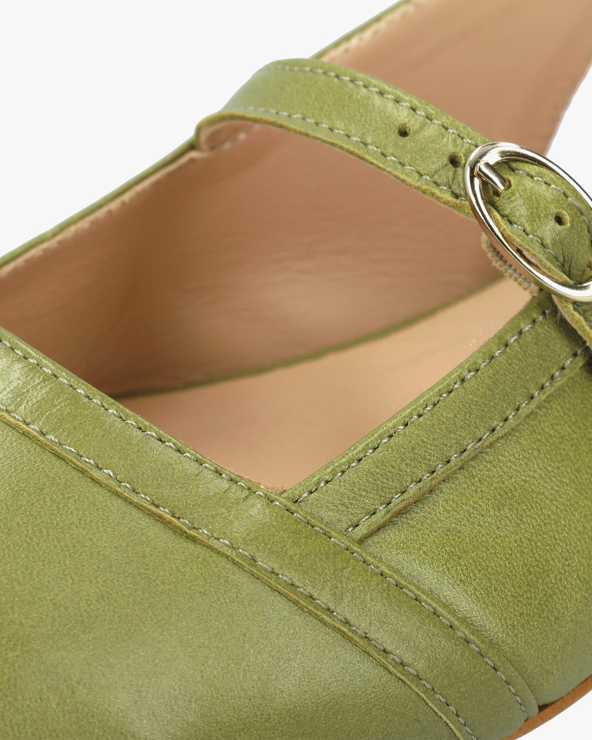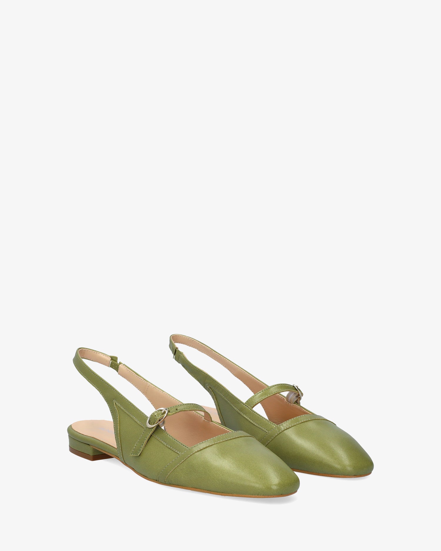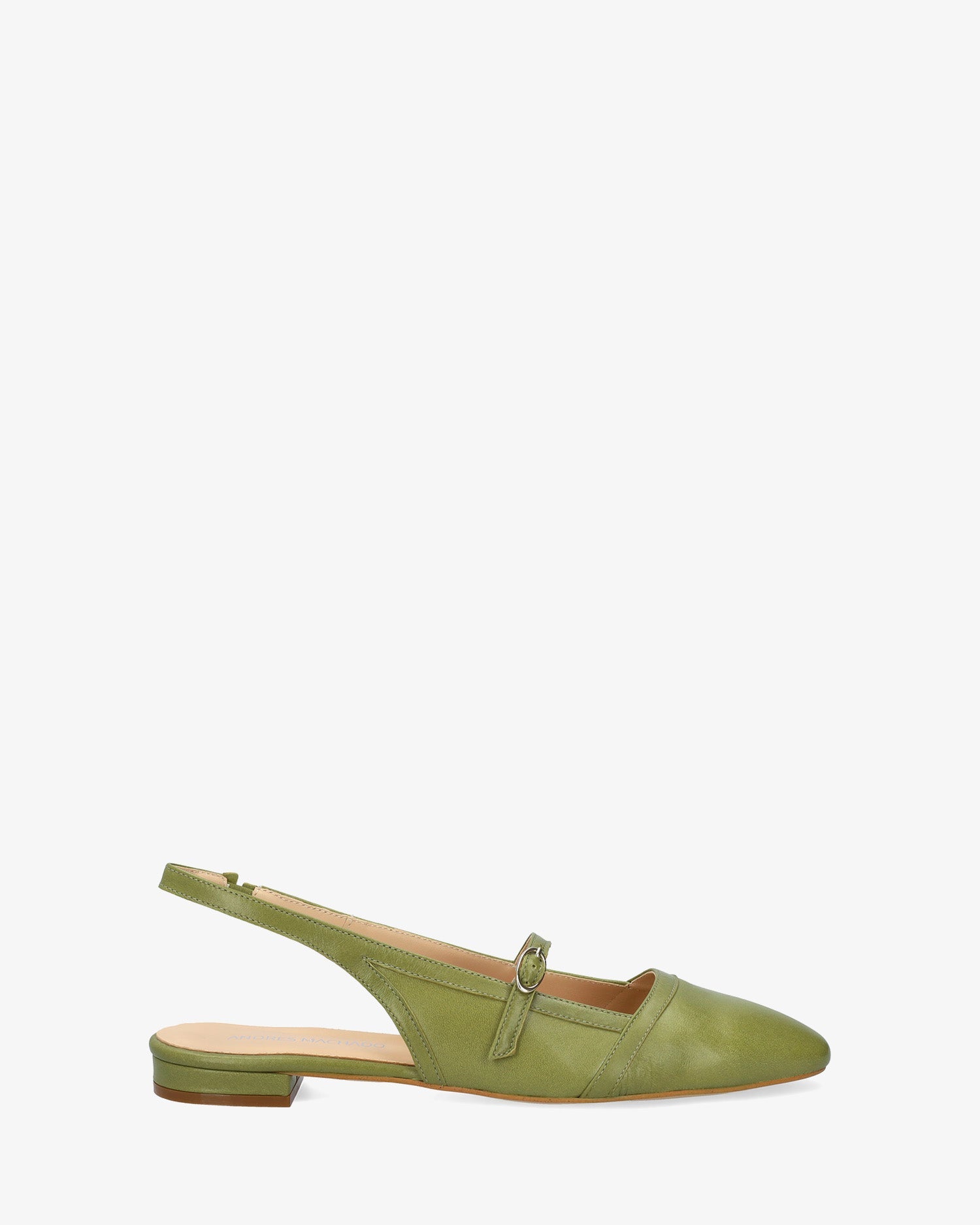 Bailarina destalonada en piel lisa de color Verde. Diseño con punta cerrada y redondeada, con detalle de cinta fina al tono y hebilla metálica en el empeine. Tira alrededor del tobillo con elástico para una mayor sujeción. Forro interior en piel color beige. Tacón forrado al tono de 1,5 cm para las tallas grandes de la 42 a la 45. Fabricado en España.