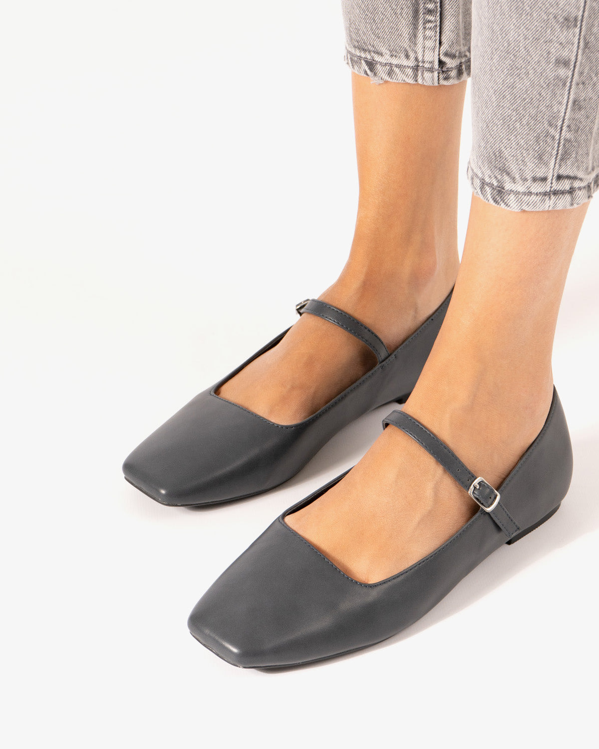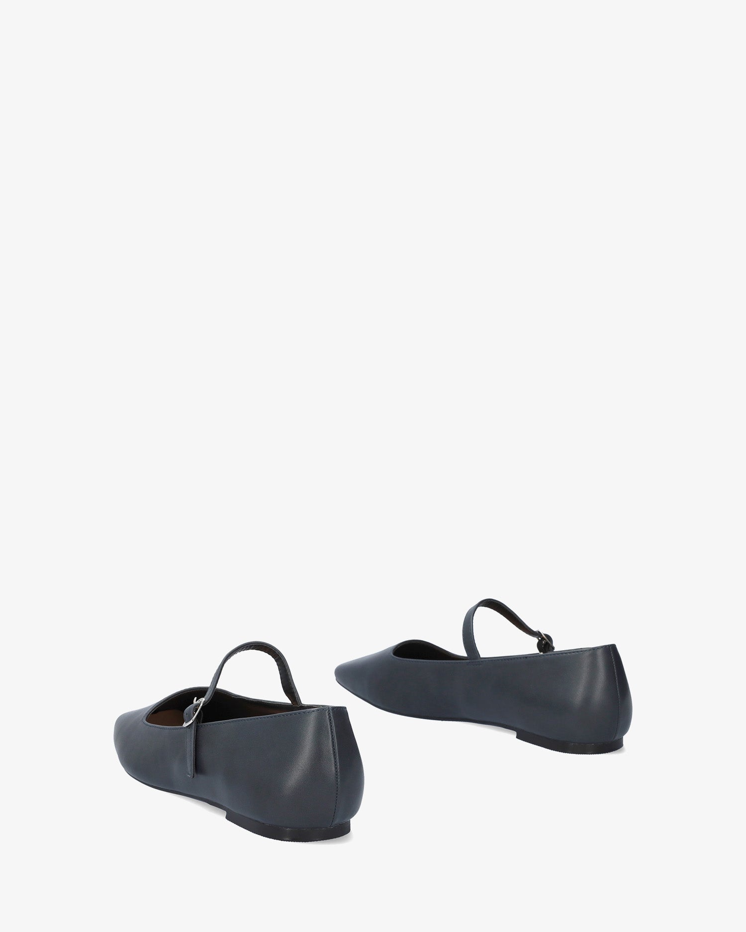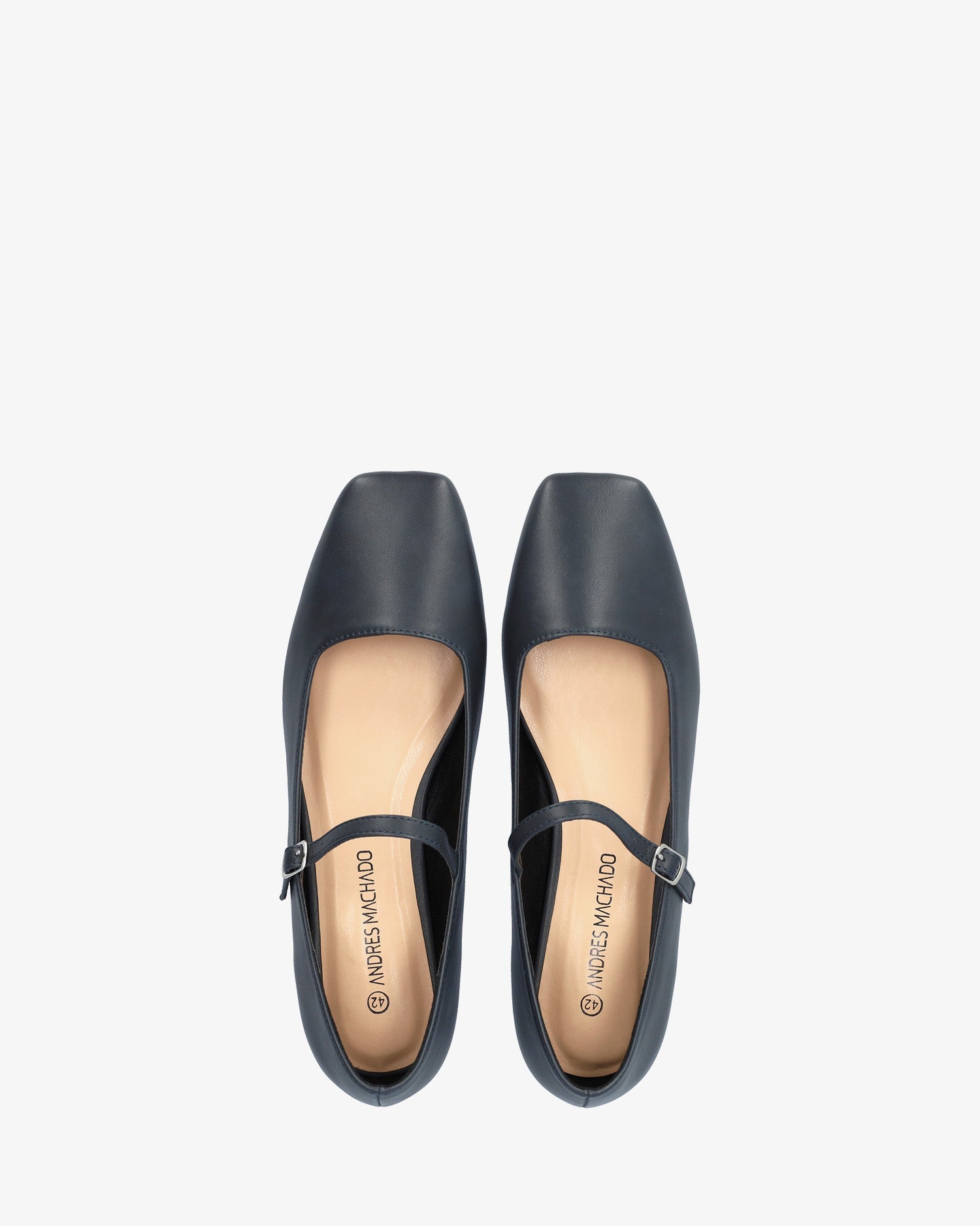 Bailarina plana tipo Mary Jane en soft de color marino. Acabado en punta cuadrada y tira en el empeine con hebilla metálica lateral. Disponible para las tallas grandes de la 43 a la 46.