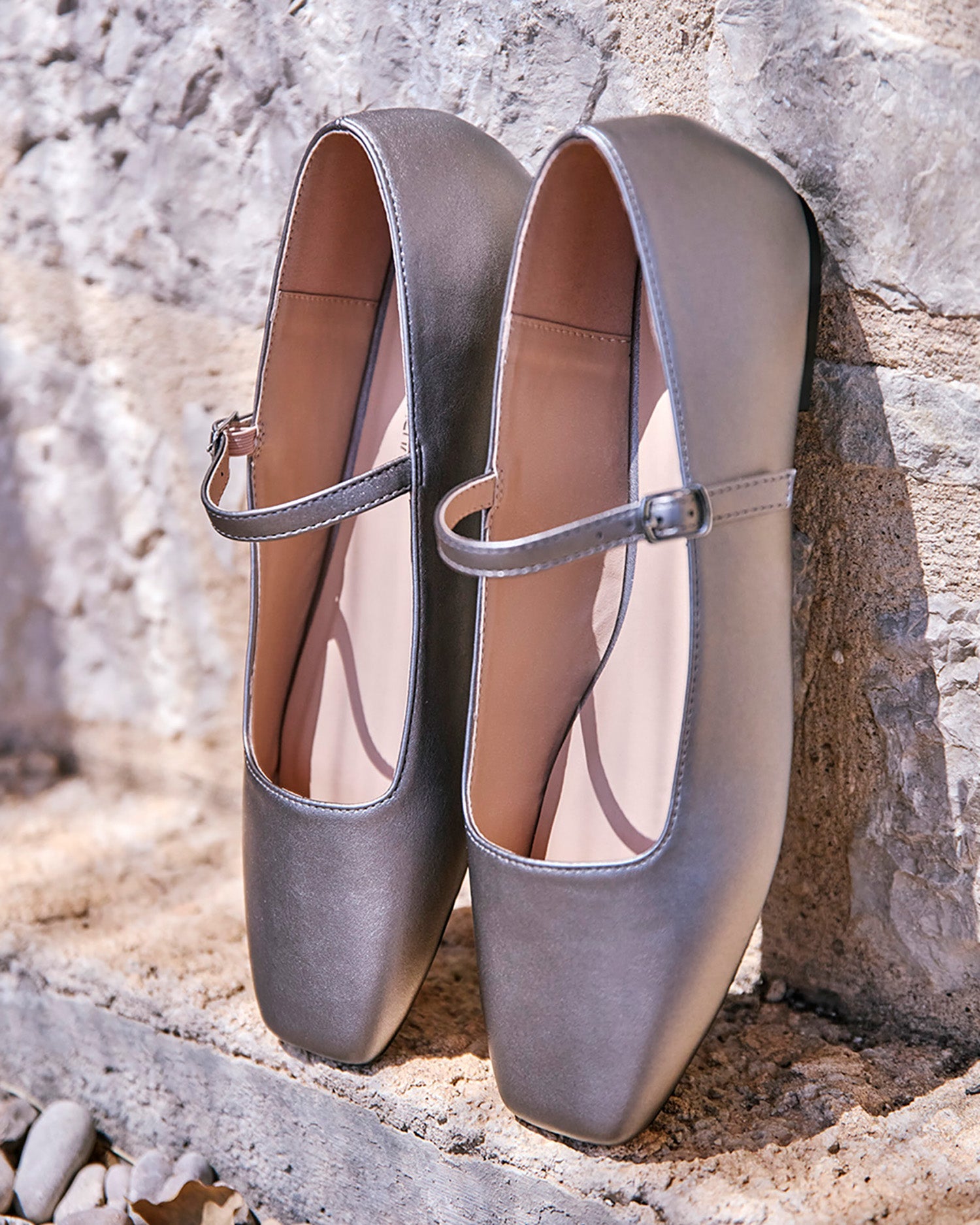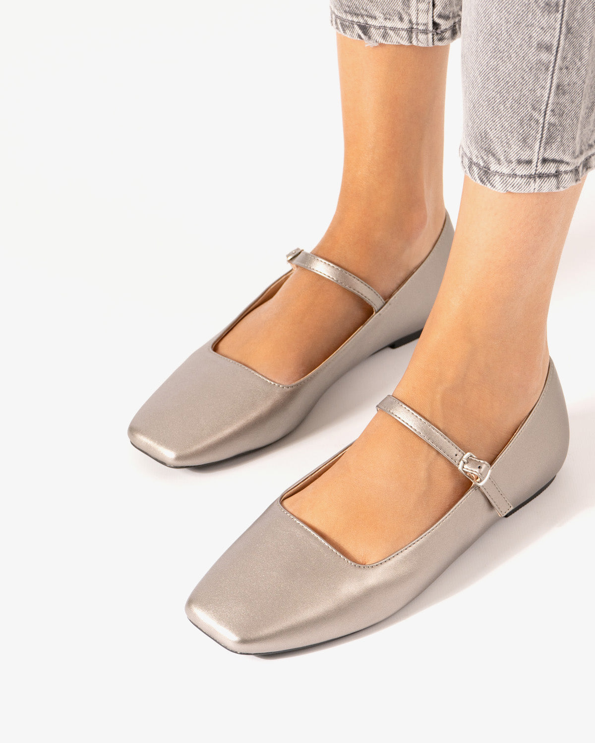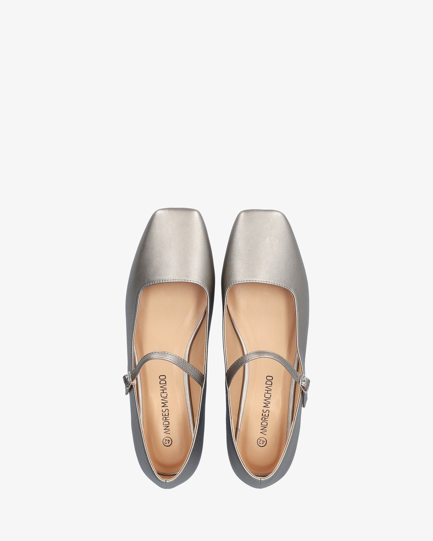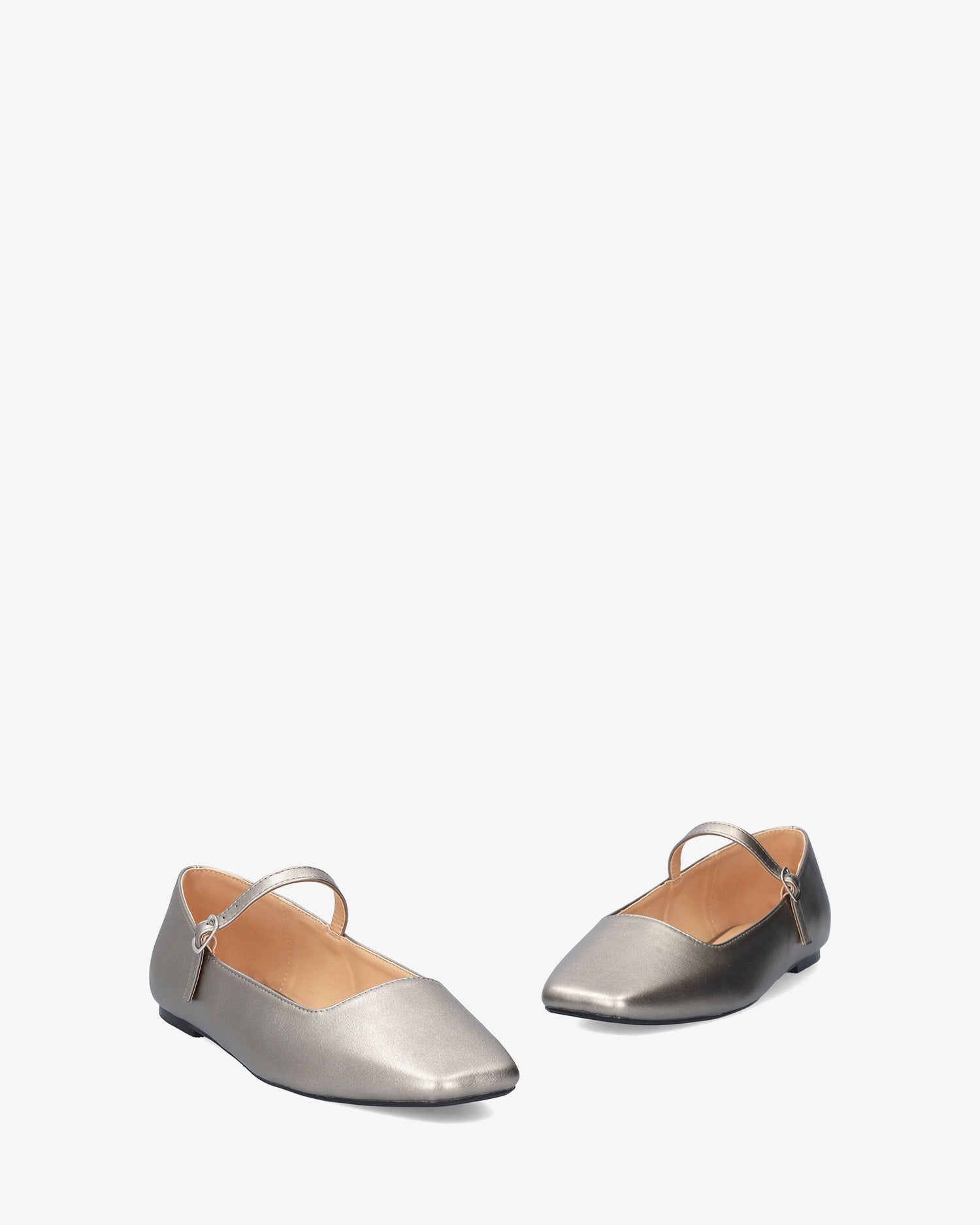 Bailarina plana tipo Mary Jane en soft de color plata vieja. Acabado en punta cuadrada y tira en el empeine con hebilla metálica lateral. Disponible para las tallas grandes de la 43 a la 46.