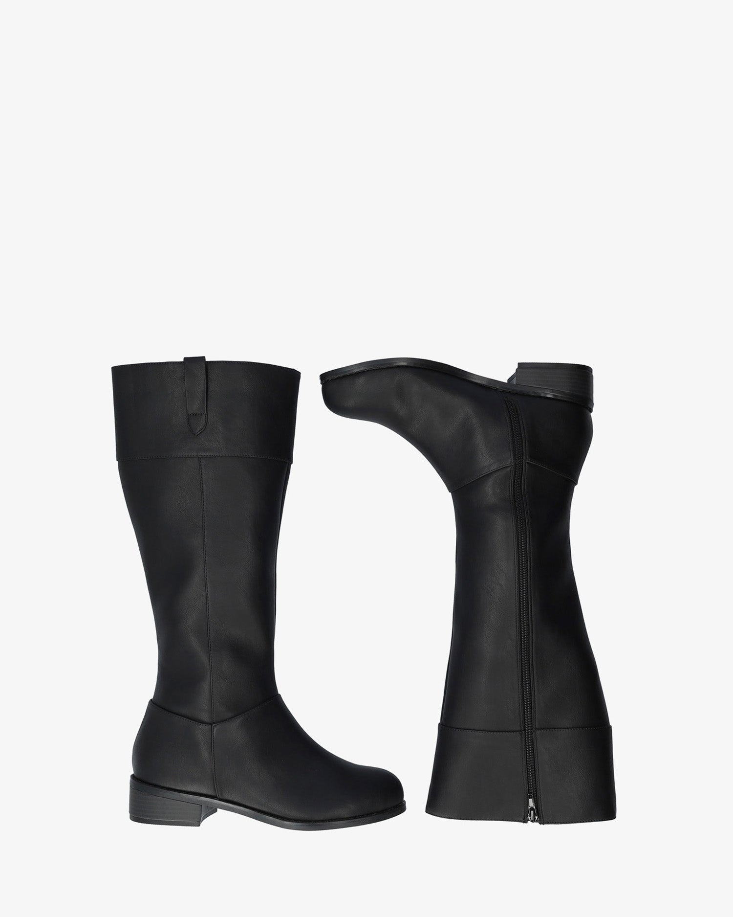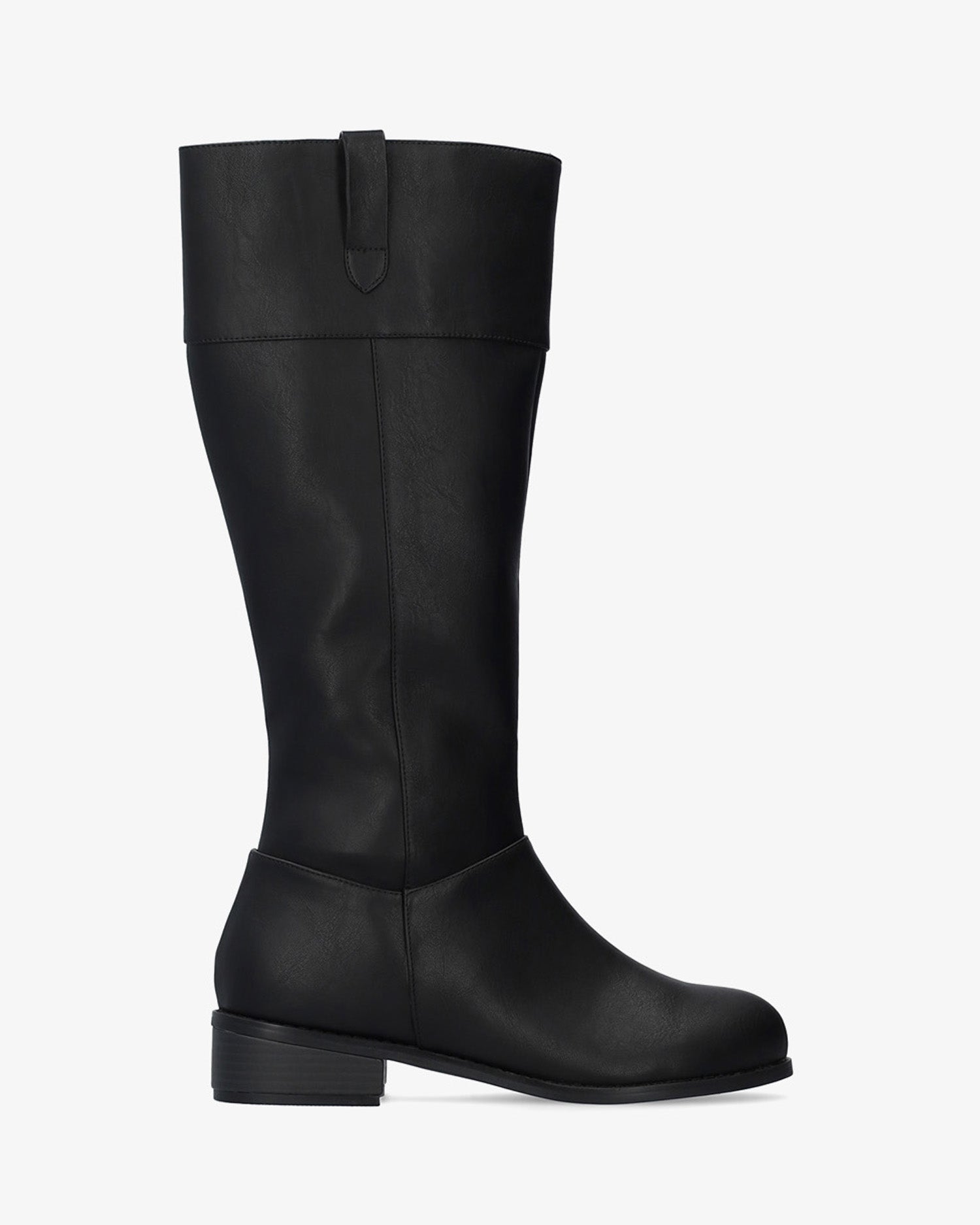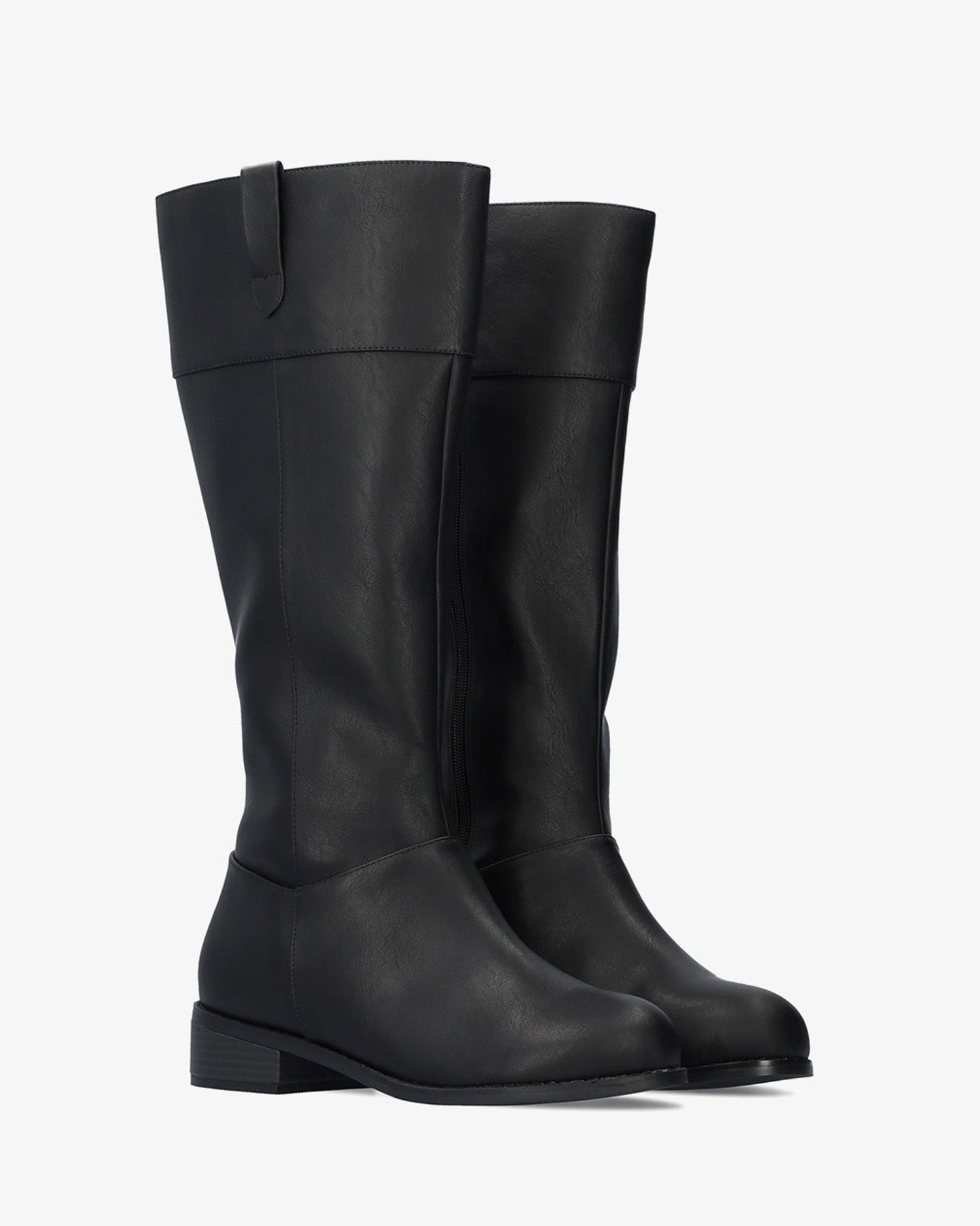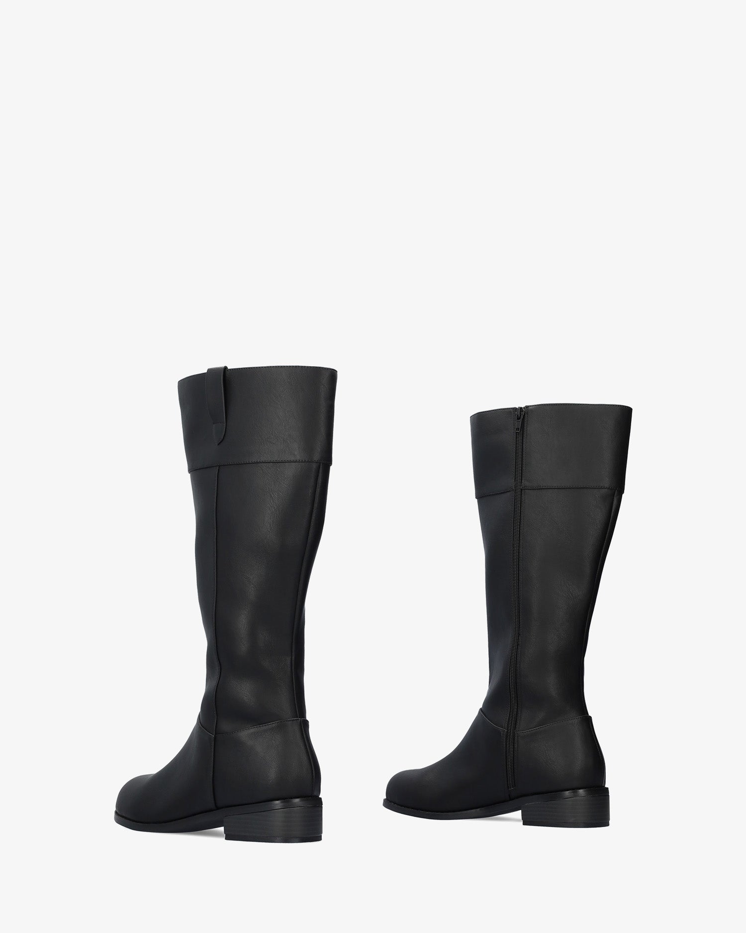 Bota alta en soft de color Negro con cremallera al tono en la parte interna. Detalle de tira decorativa al tono alrededor de la caña y tirador en la parte superior. Acabado en punta redonda. Suela de color negro con tacón efecto madera lijada de 4 cm tallas grandes de la 42 a la 45.