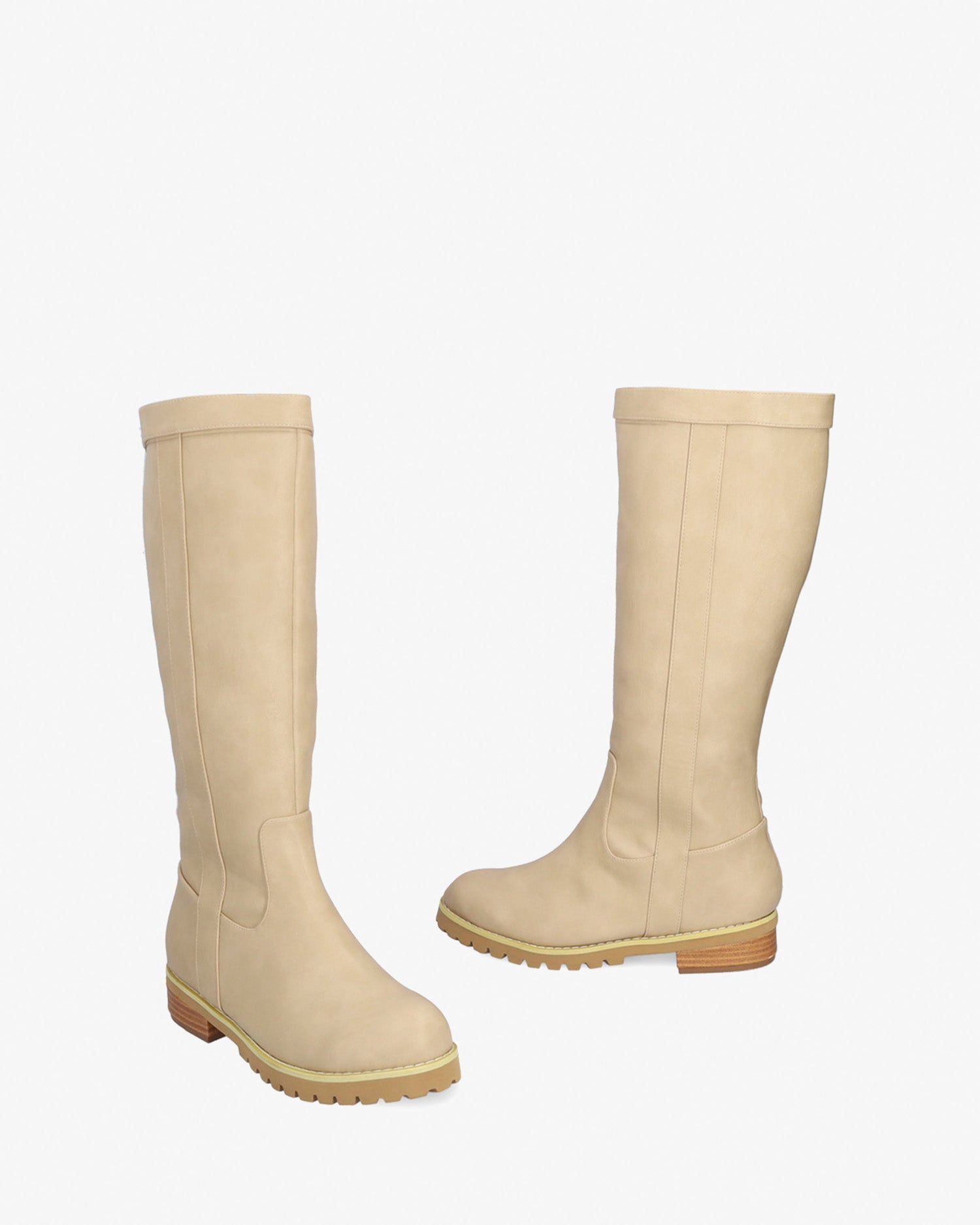 Bota de estilo campera en soft hueso. Caña alta con cierre de cremallera al tono en la parte interior. Detalle de tira lateral en la parte exterior y en el borde superior. Punta redondeada. Suela track de goma. Tacón de 3 cm efecto madera lijada. Tallas grandes de la 42 a la 45.