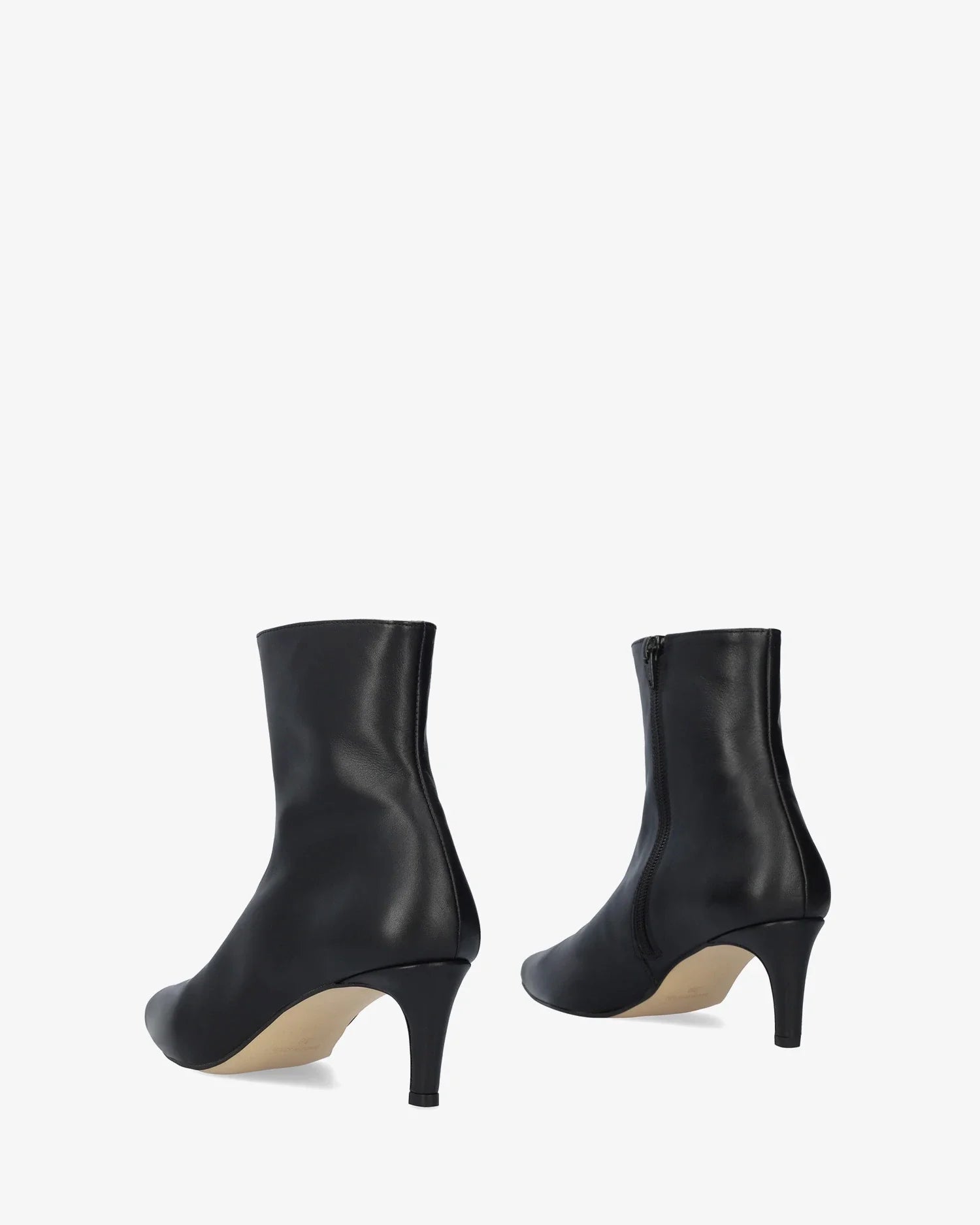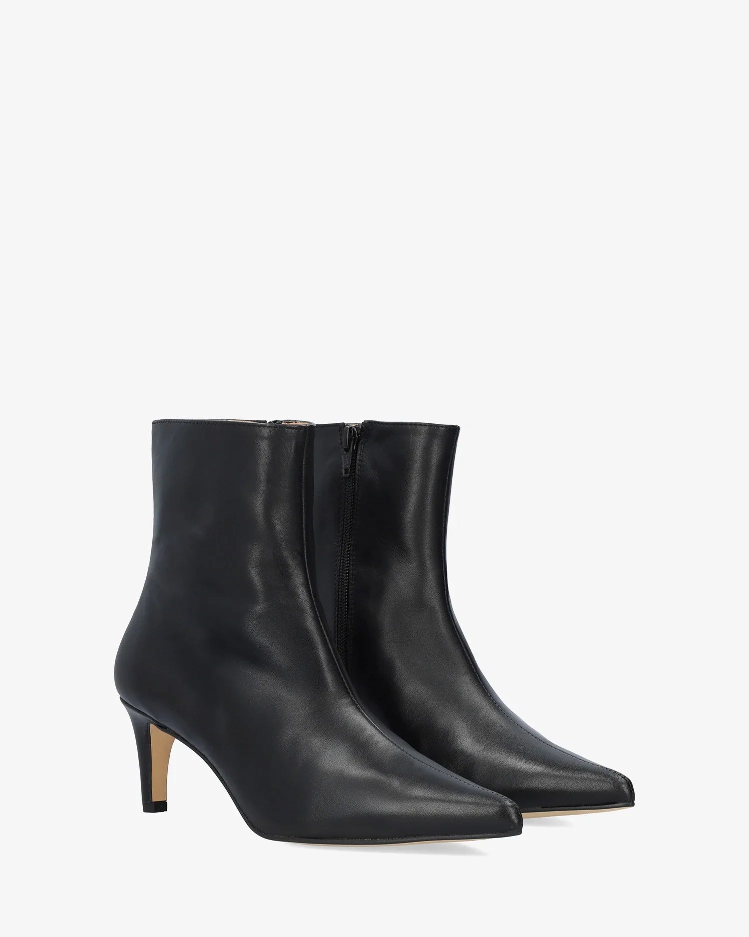Botín con tacón de piel. Acabado en punta fina con cremallera en lateral y pespuntes decorativos al tono. Tacón de 6 cm para las tallas pequeñas, de la 32 a la 35 y tacón de 7 cm para las tallas grandes, de la 42 a la 45. Fabricado en España.