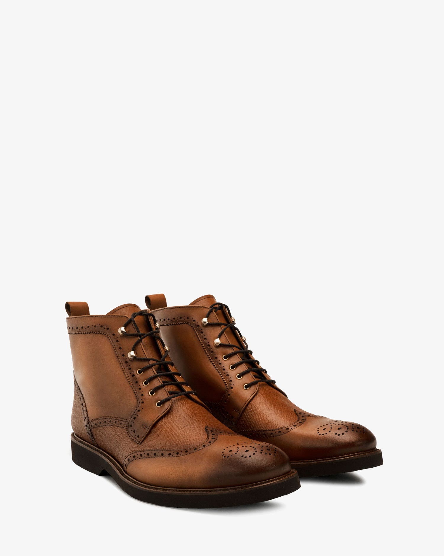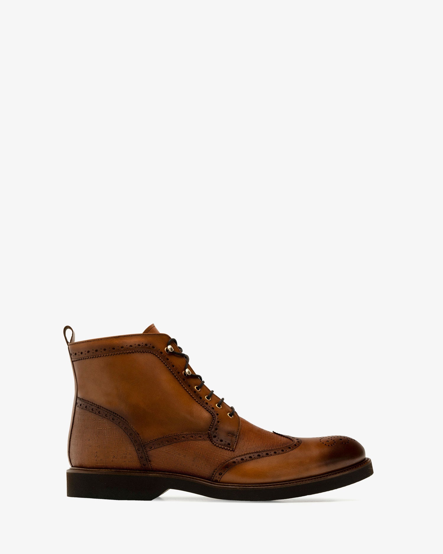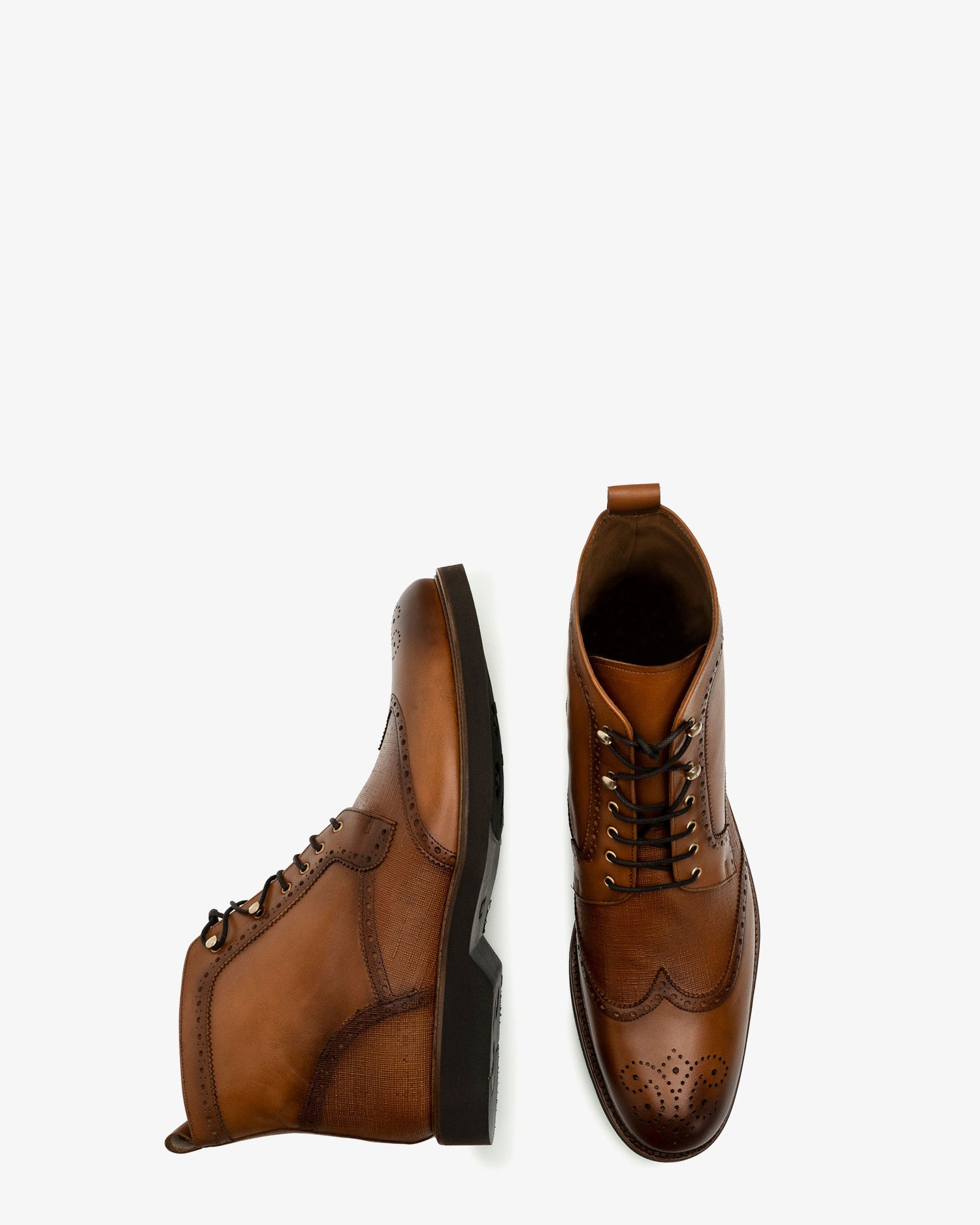 Botín de caballero en piel de color Marron. Detalle de picados decorativos en el corte y grabado al tono en la parte trasera y en la lengüeta. Tirador en la parte trasera. Cierre de cordones de color Marrón. Forro interior en piel de color camel. Suela de goma. Tallas grandes de caballero de la talla 44 y de la 47 a la 50. Fabricado en España