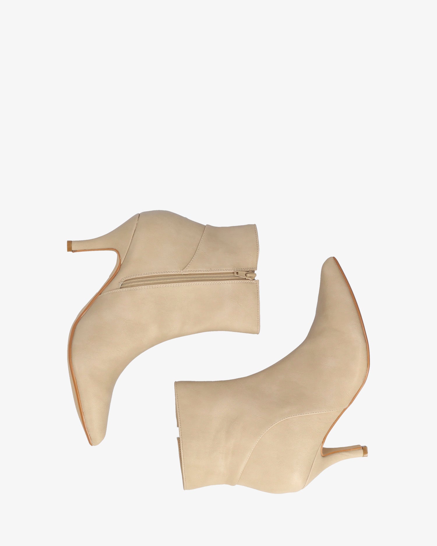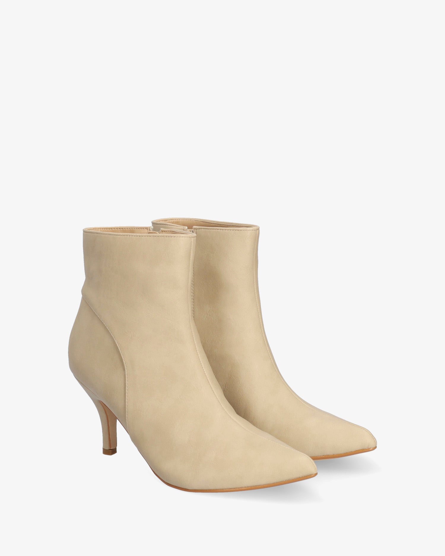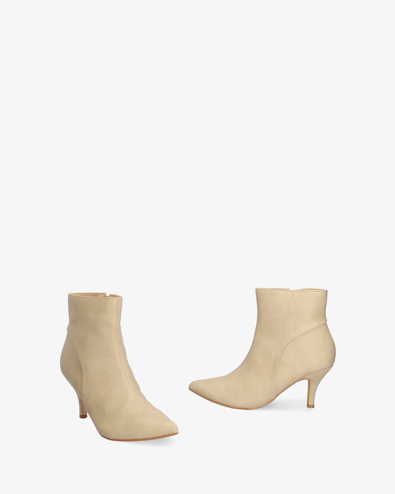 Botín en soft de color márfil. Caña baja con cierre de cremallera al tono en el lateral interno. Pespunte decorativo de la puntera a lo alto de la caña y en la parte trasera. Tacón fino medio forrado al tono de 7 cm para las tallas pequeñas de la 32 a la 35. Tacón de 8 cm para las tallas grandes de la 42 a la 45.